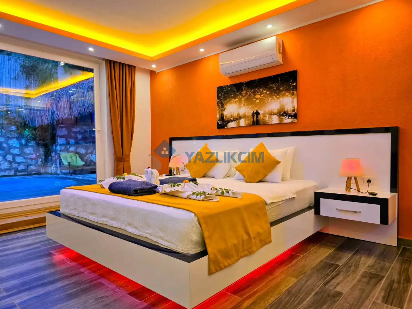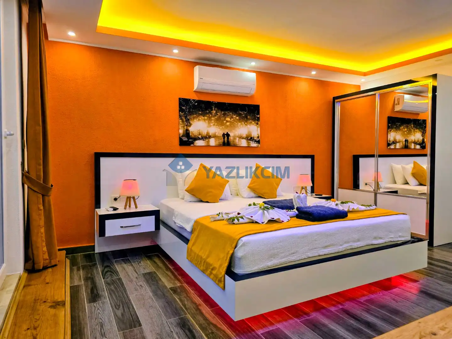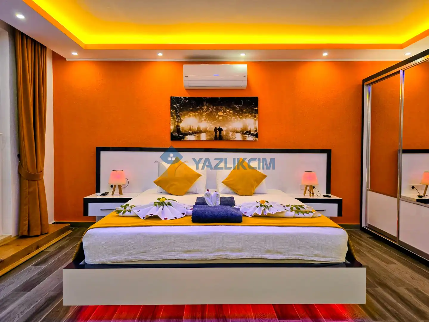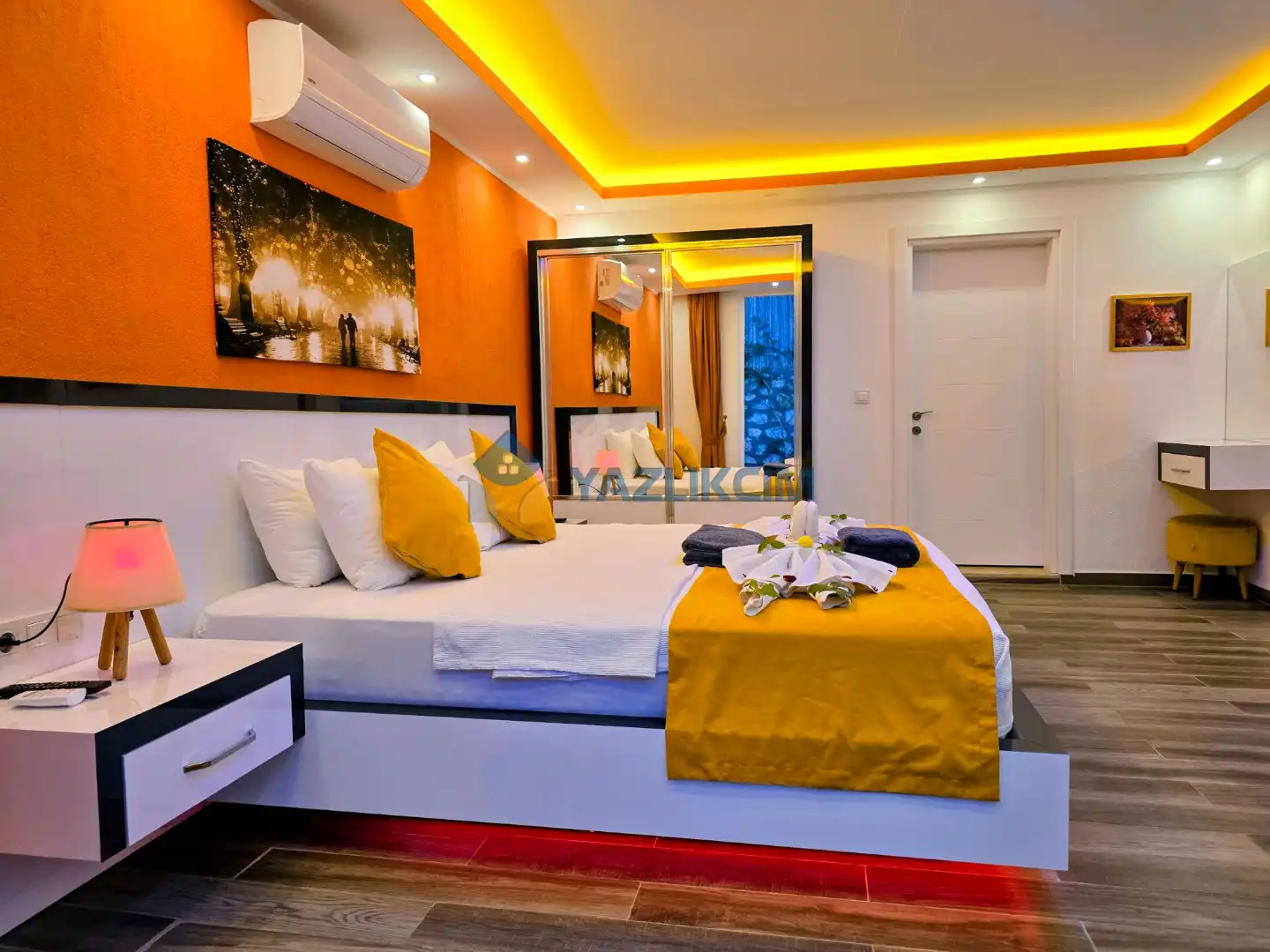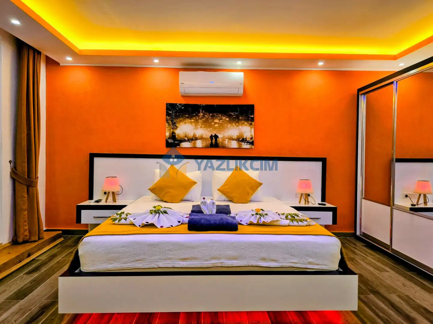 Detayları : Çift kişilik yatak, jakuzi, klima, komodin, elbise dolabı, makyaj masası, banyo ve lavabo bulunmaktadır.