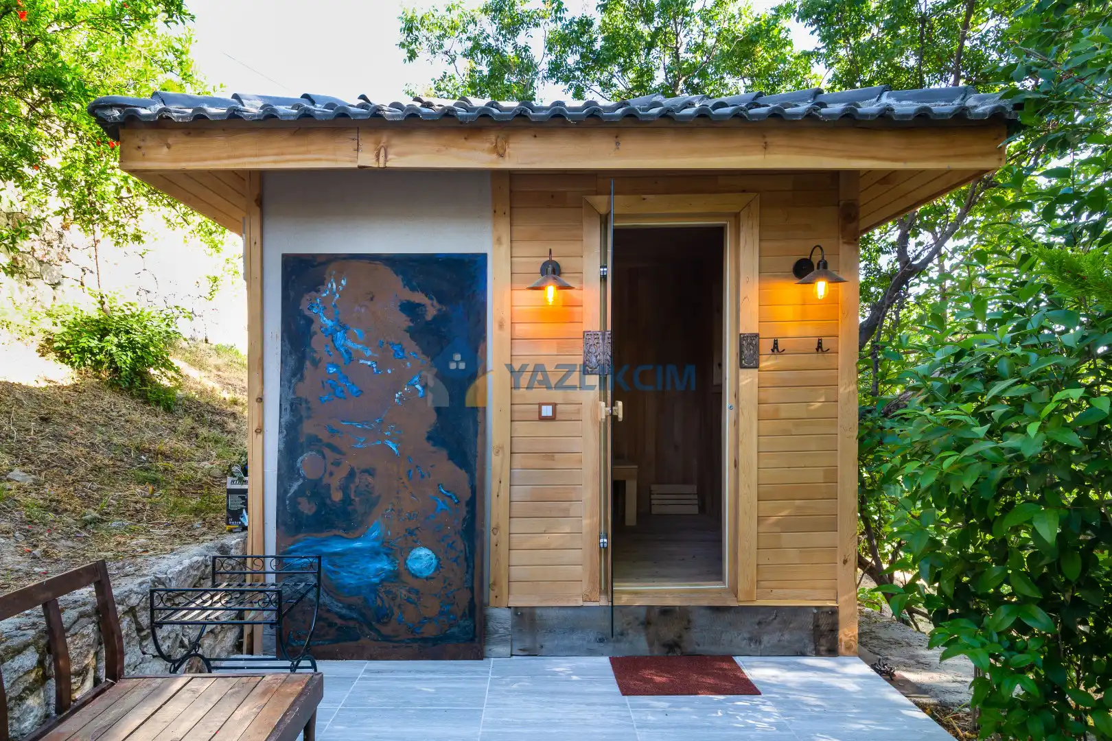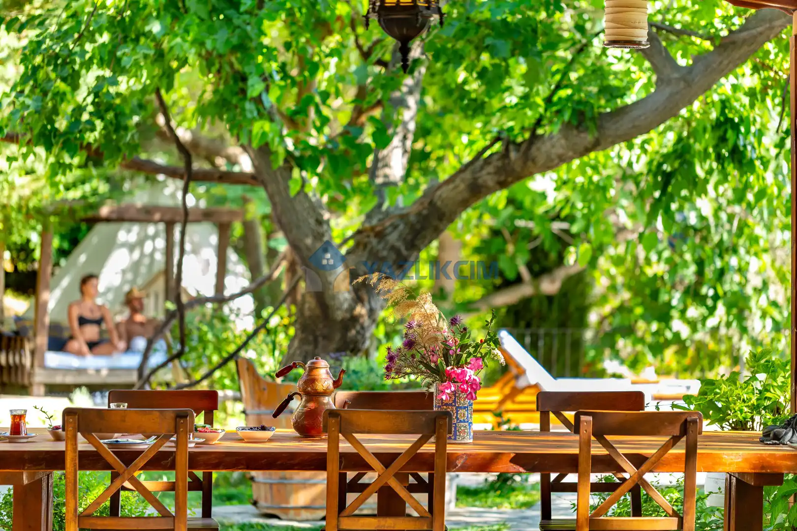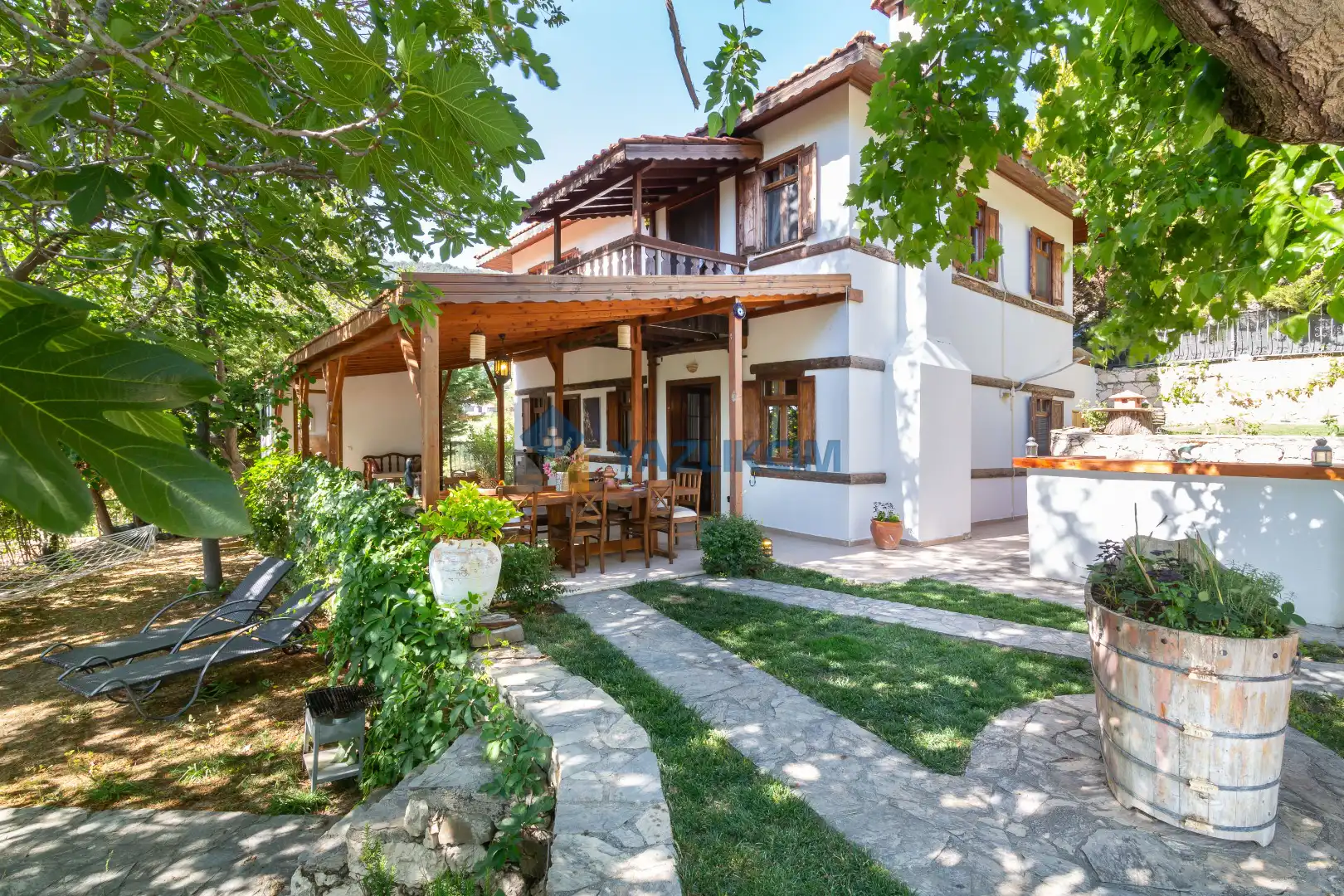 Detayları: 6 adet şezlong, Mangal, Güneş şemsiyesi, Bahçe oturma grubu, 6 Kişilik masa ve sandalye ve Bahçe duş bulunur.