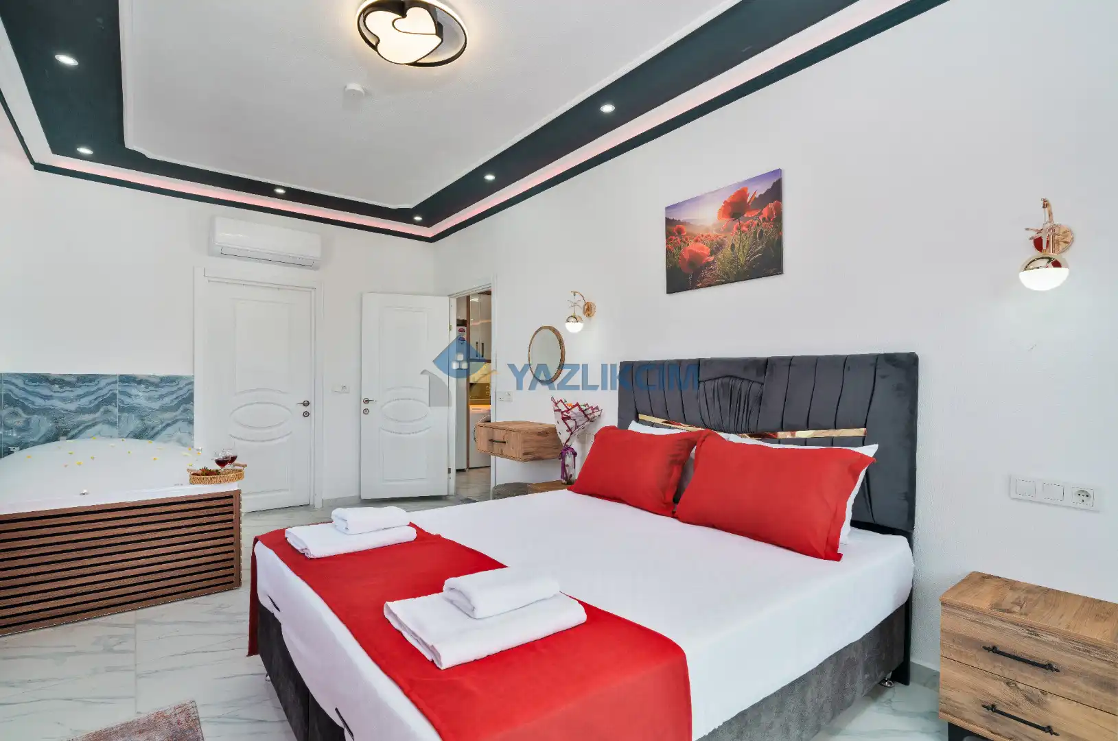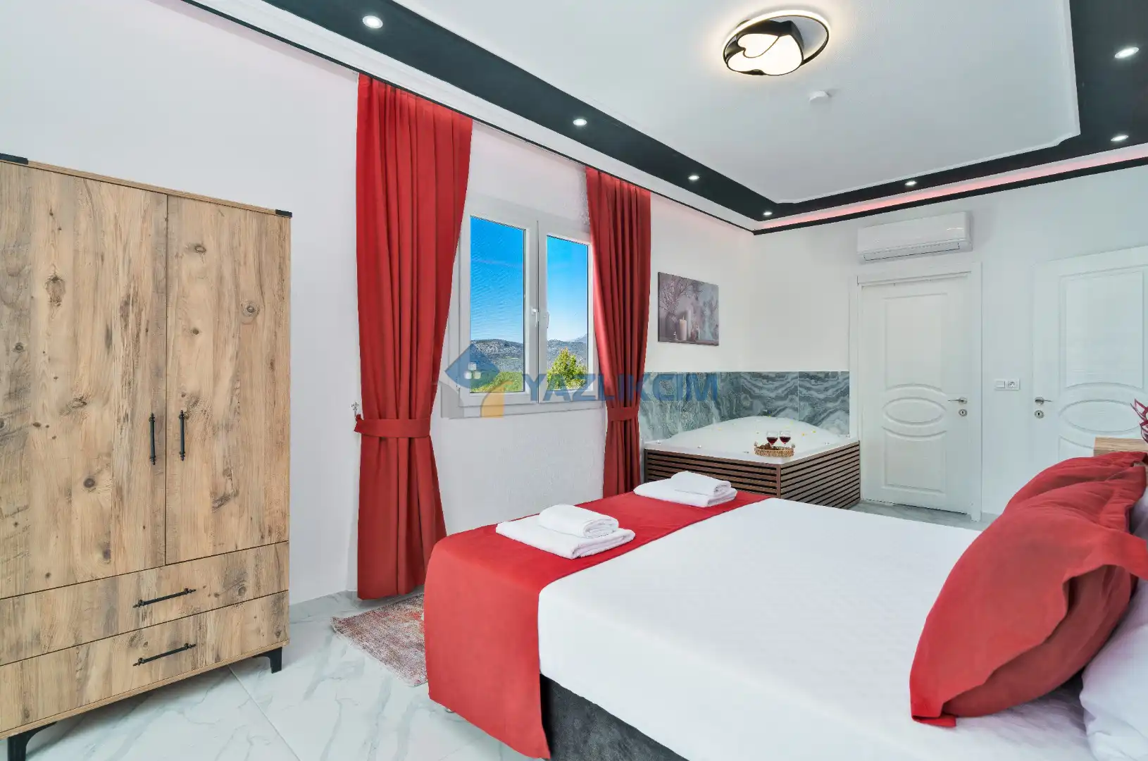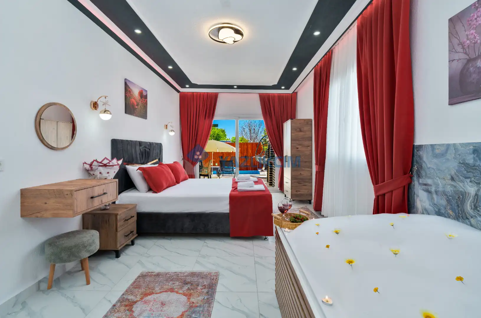 Detayları : Çift kişilik yatak, jakuzi, klima , komodin, elbise dolabı, makyaj masası, banyo ve lavabo bulunmaktadır.