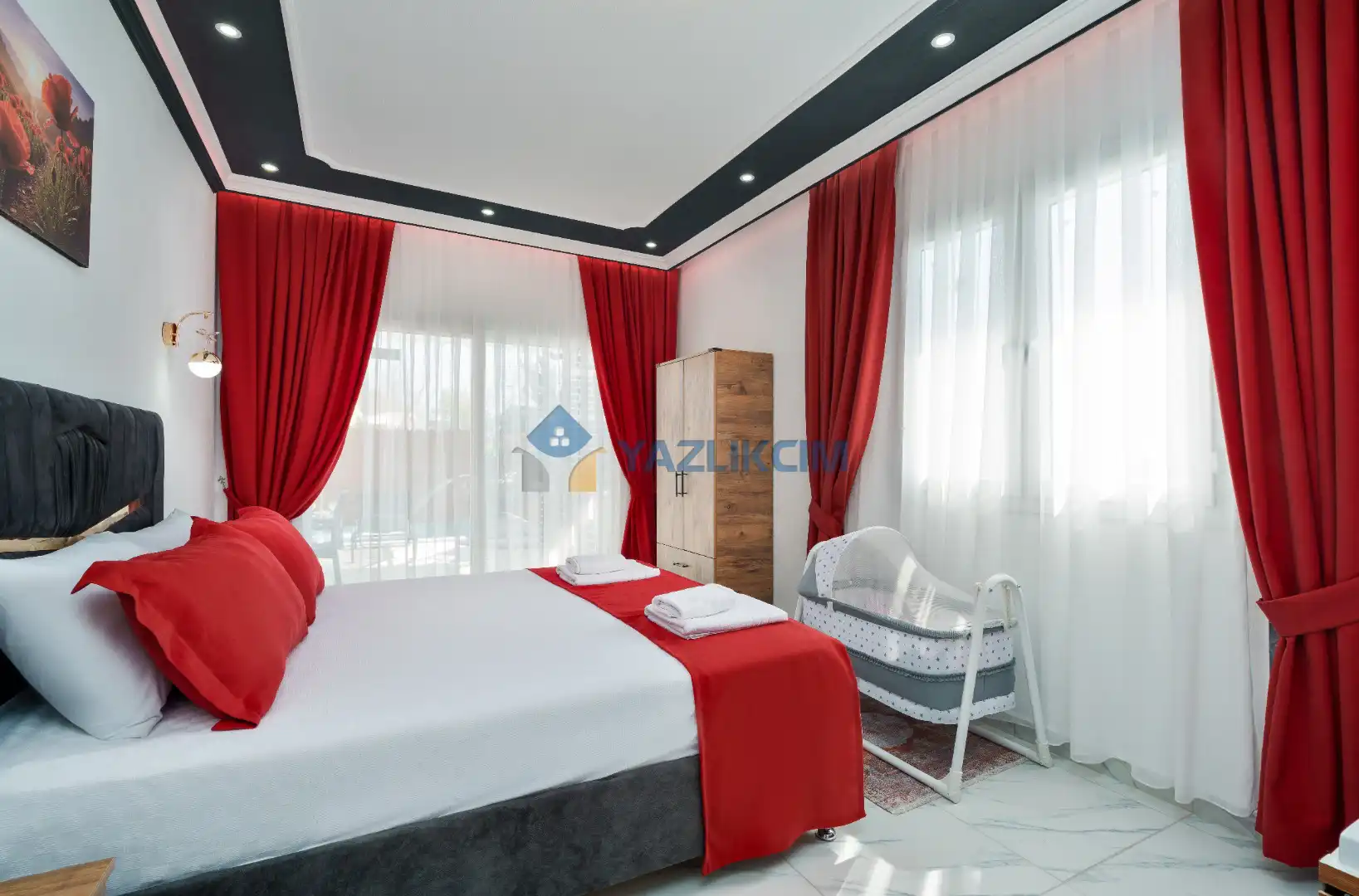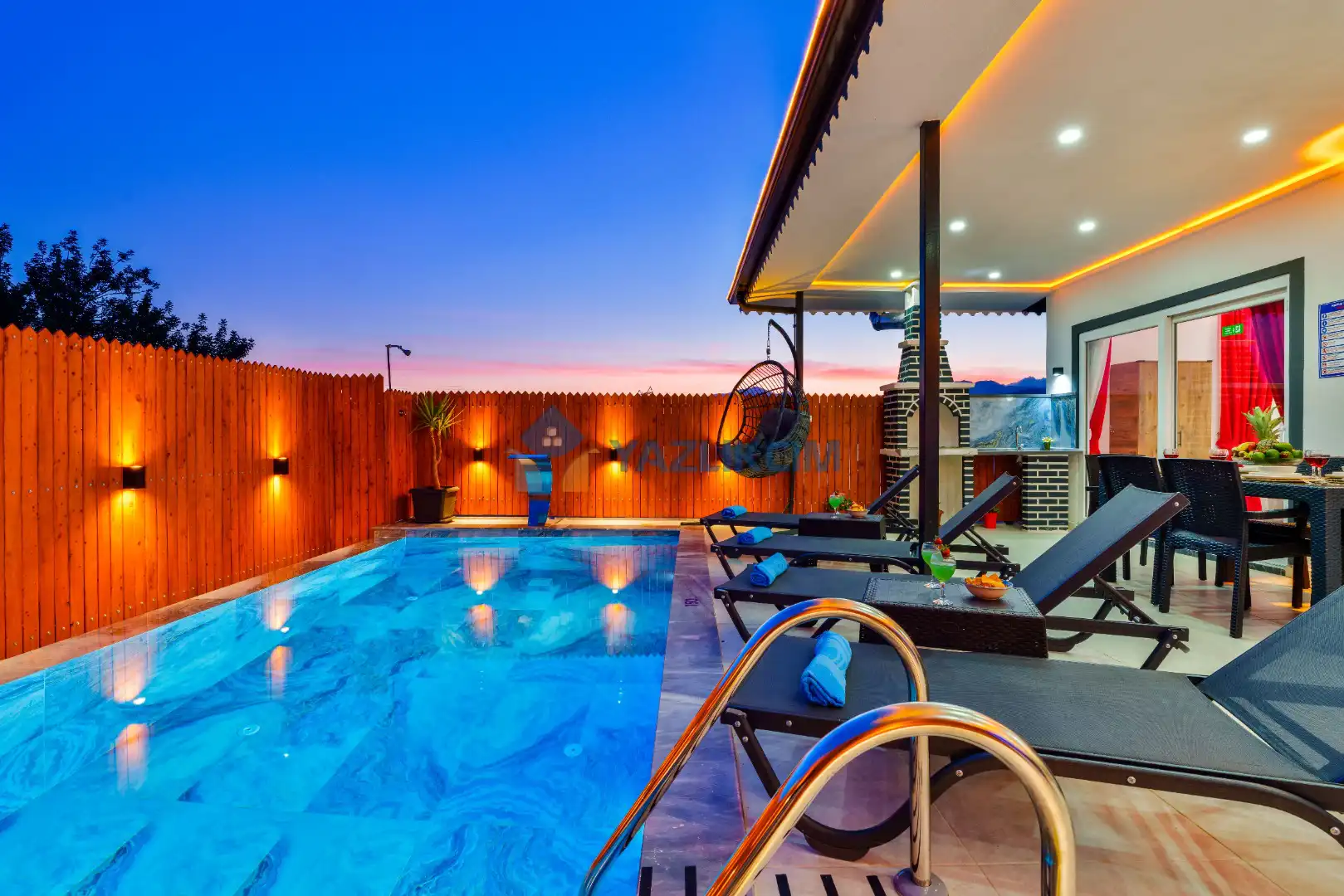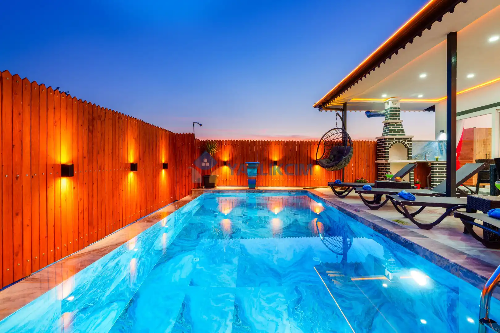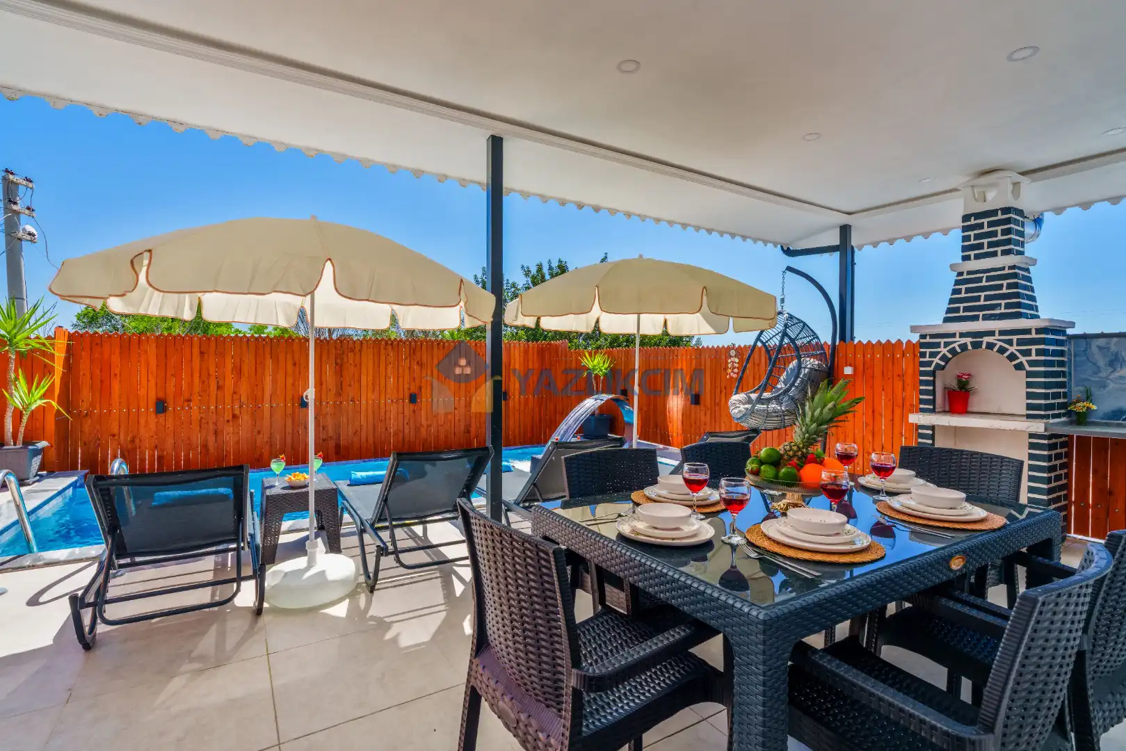 Detayları : Şezlong, güneşlenme şemsiyesi, oyun parkı, salıncak, oturma grubu, barbekü, yemek masası ve sandalyeleri bulunmaktadır.