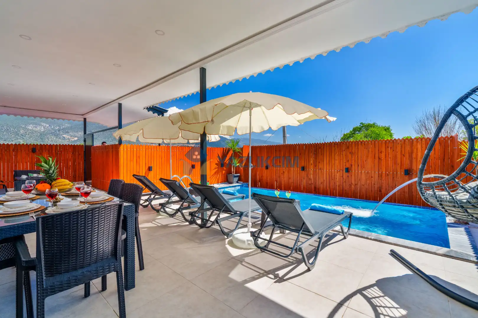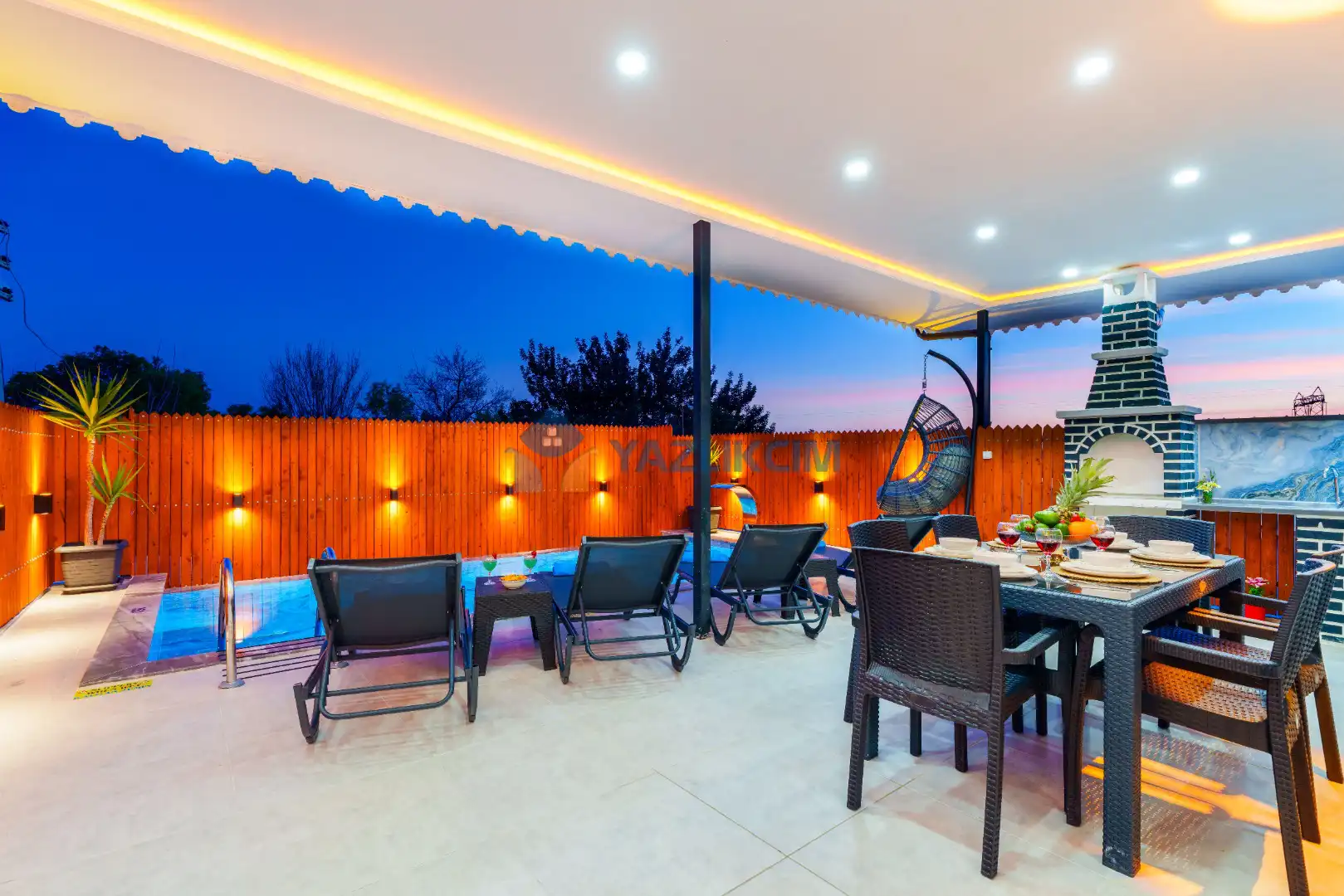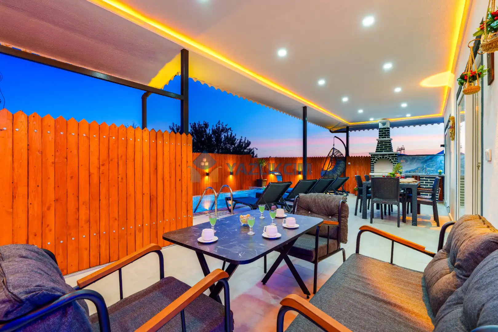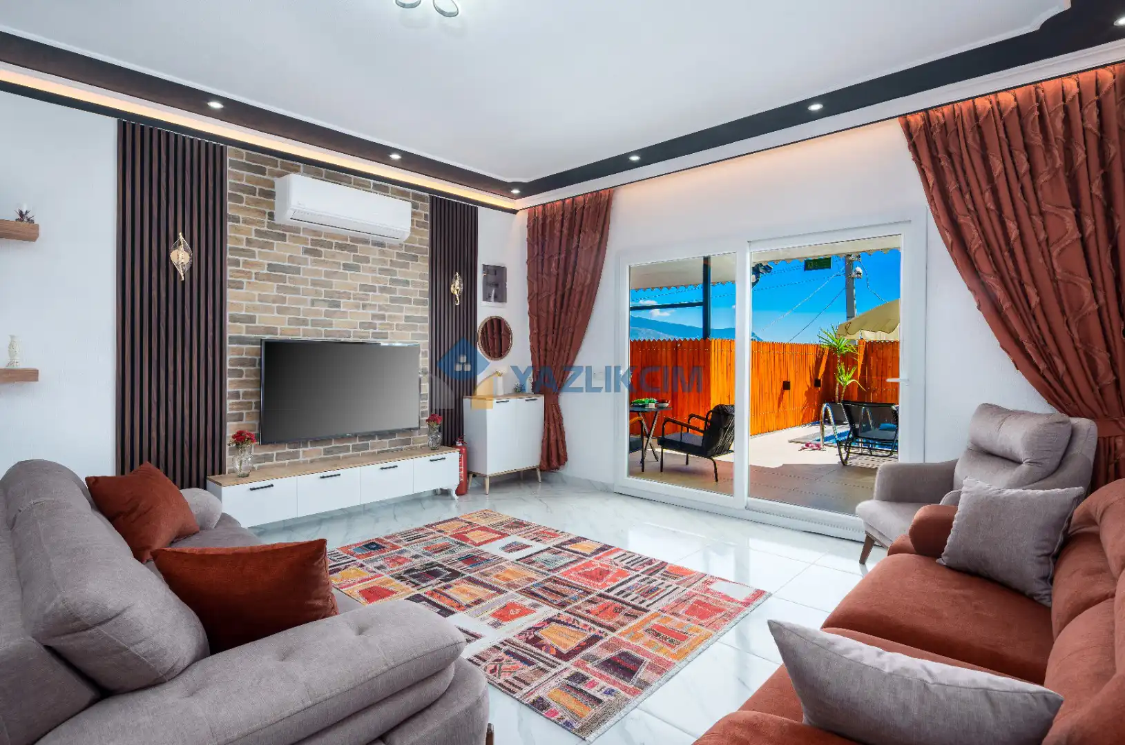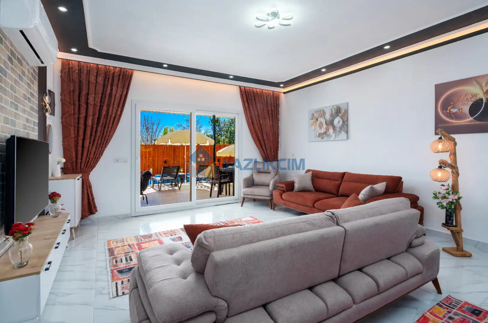 Salon Detayları : LCD TV, modern oturma grubu, yemek masası ve sandalyeler ve havuz terasına bulunmaktadır.