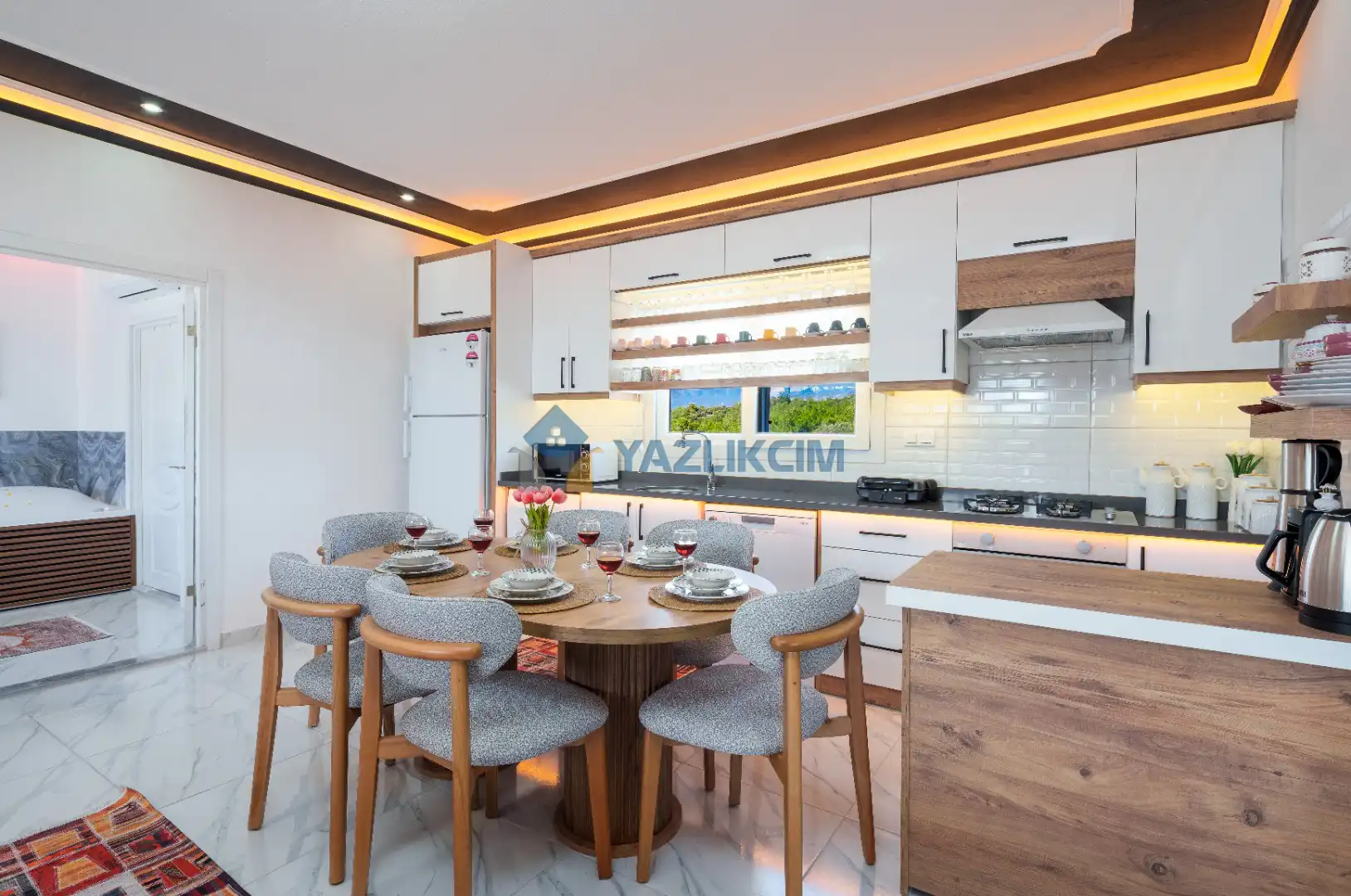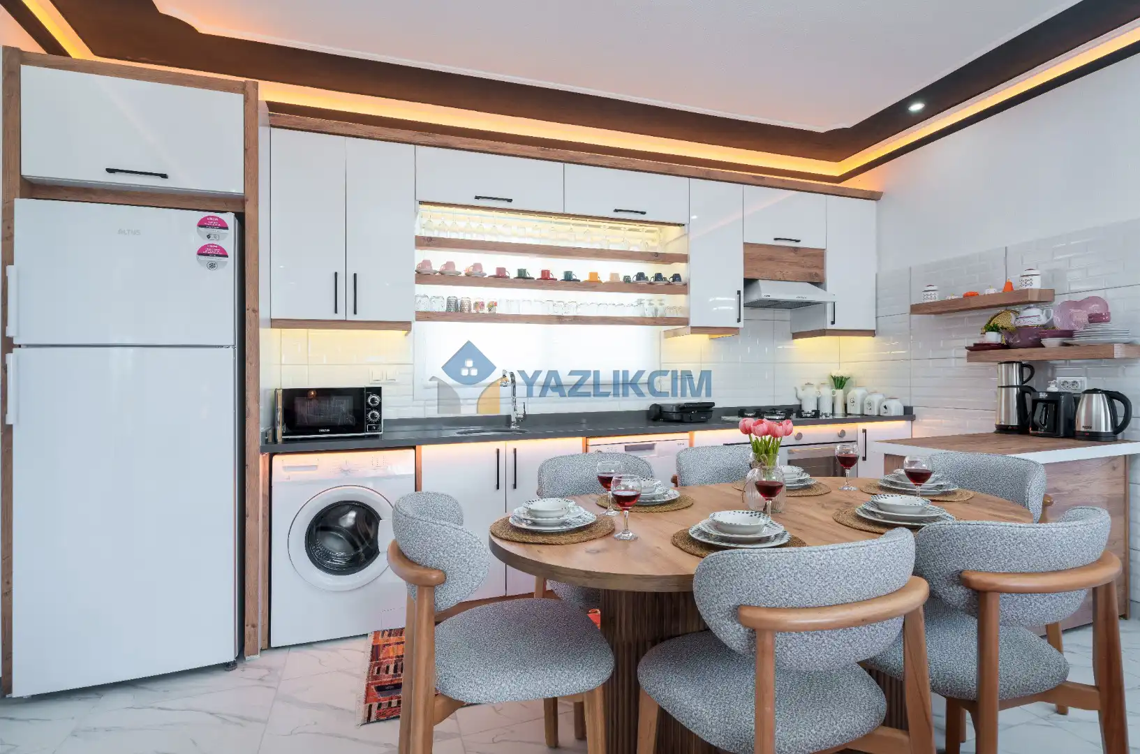 Mutfak Detayları : Buzdolabı, bulaşık makinesi, fırın, 4'lü ocak, çamaşır makinesi, tost makinesi, çaycı, kahve makinesi, yemek takımı, tava-tencere, çatal-bıçak seti bulunmaktadır.
