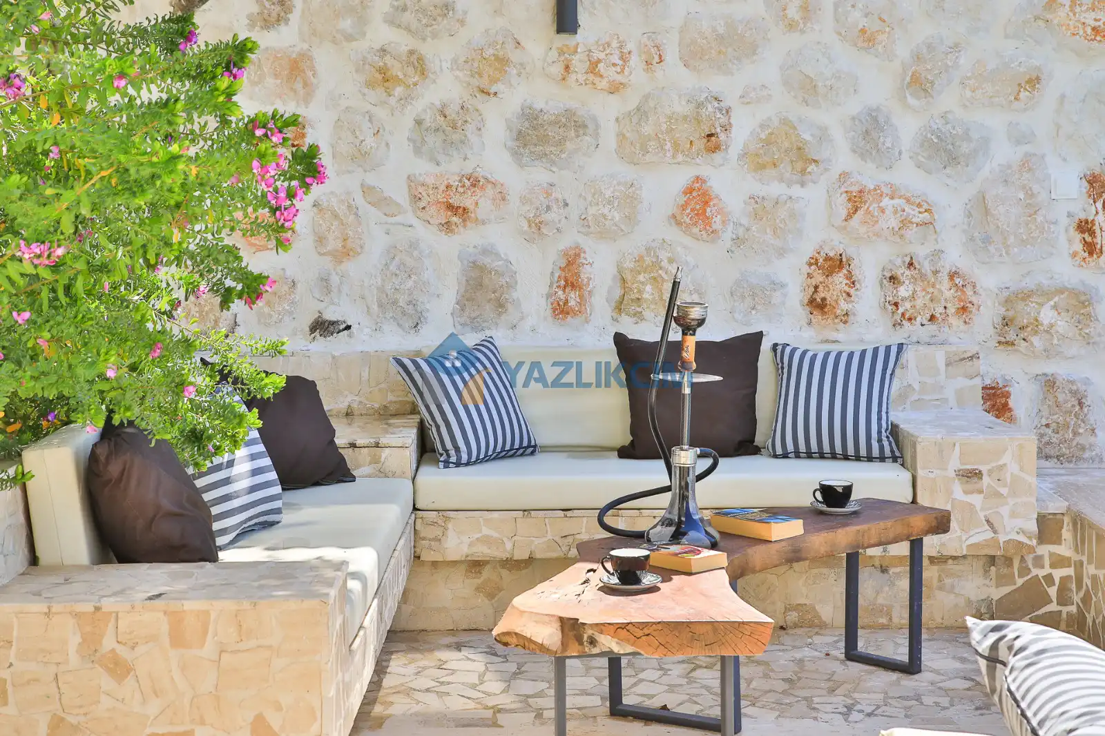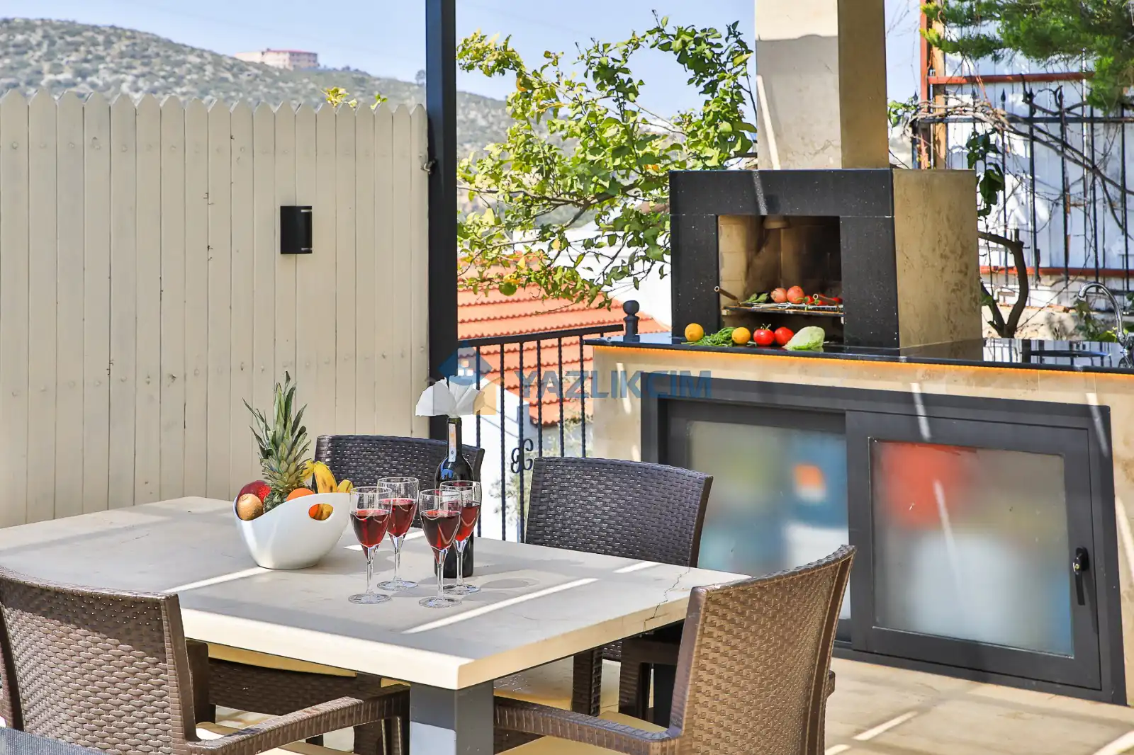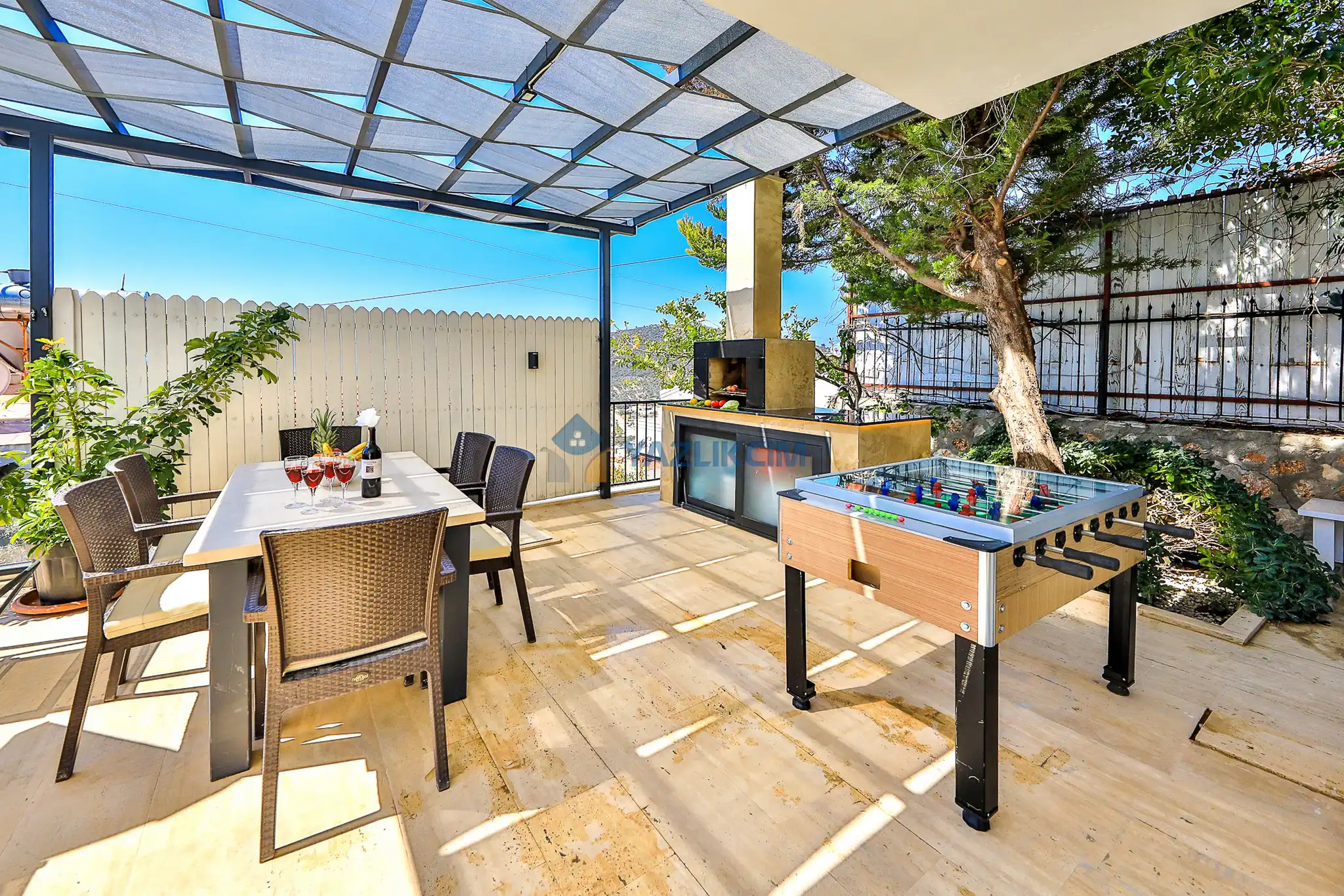 Detaylari : Sezlonglar, semsiye, yemek masasi ve barbekü bulunmaktadir.