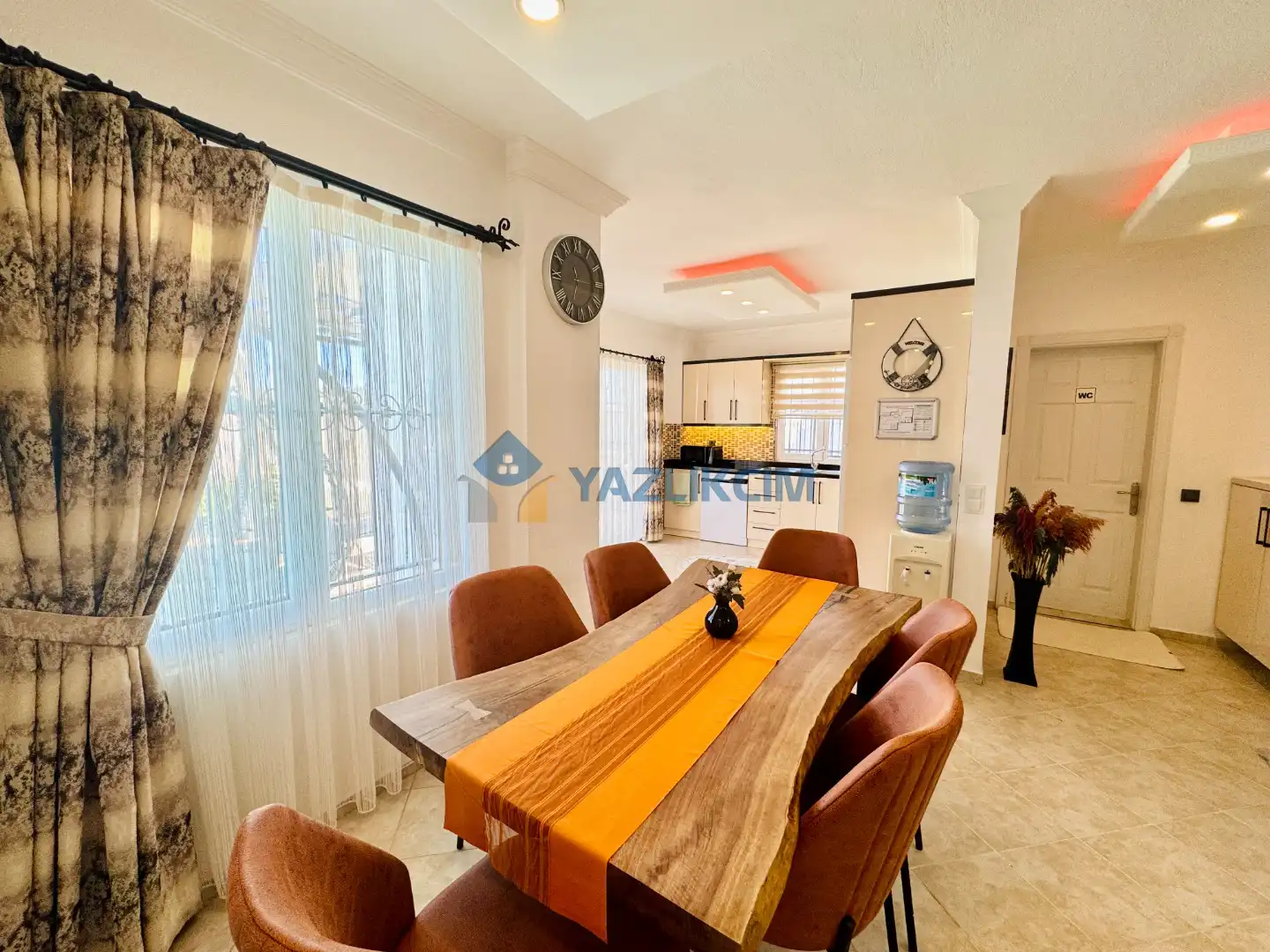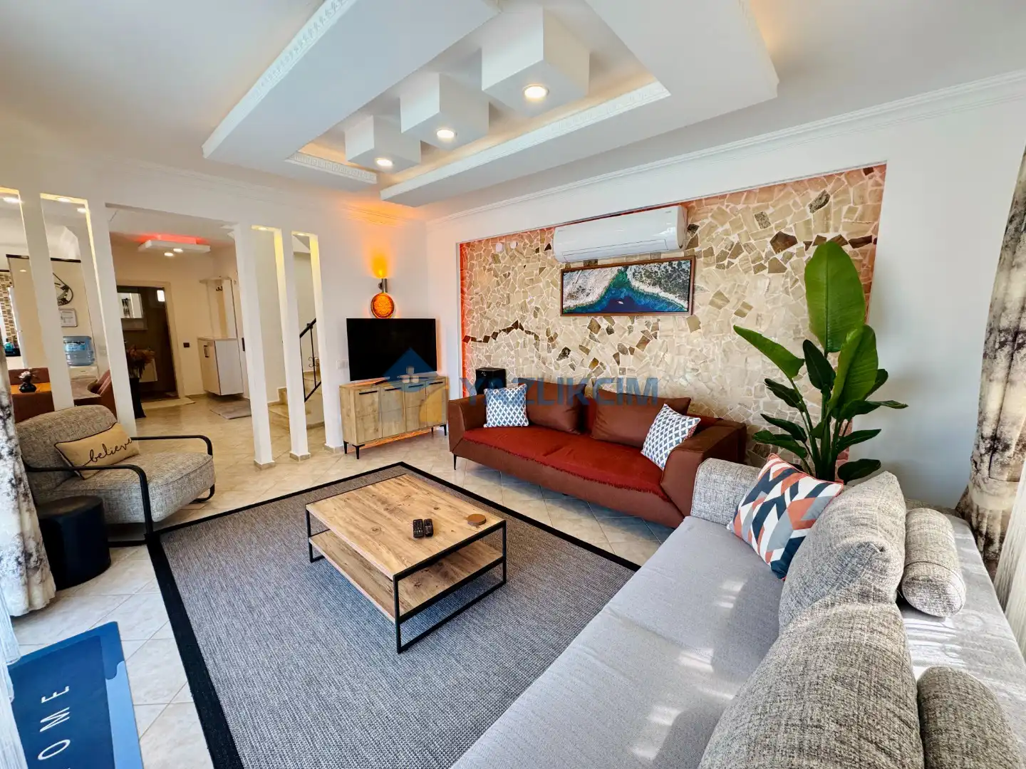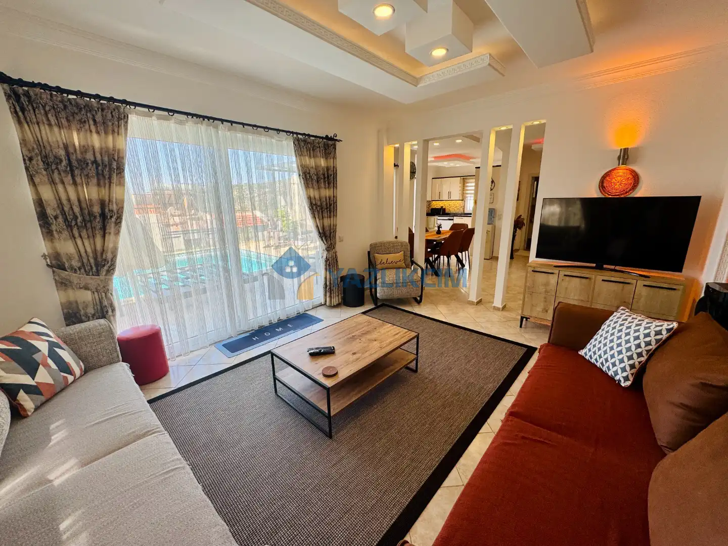 Salon Detaylari: LCD TV, uydu alici, modern oturma grubu, yemek masasi ve sandalyeler bulunmaktadir.