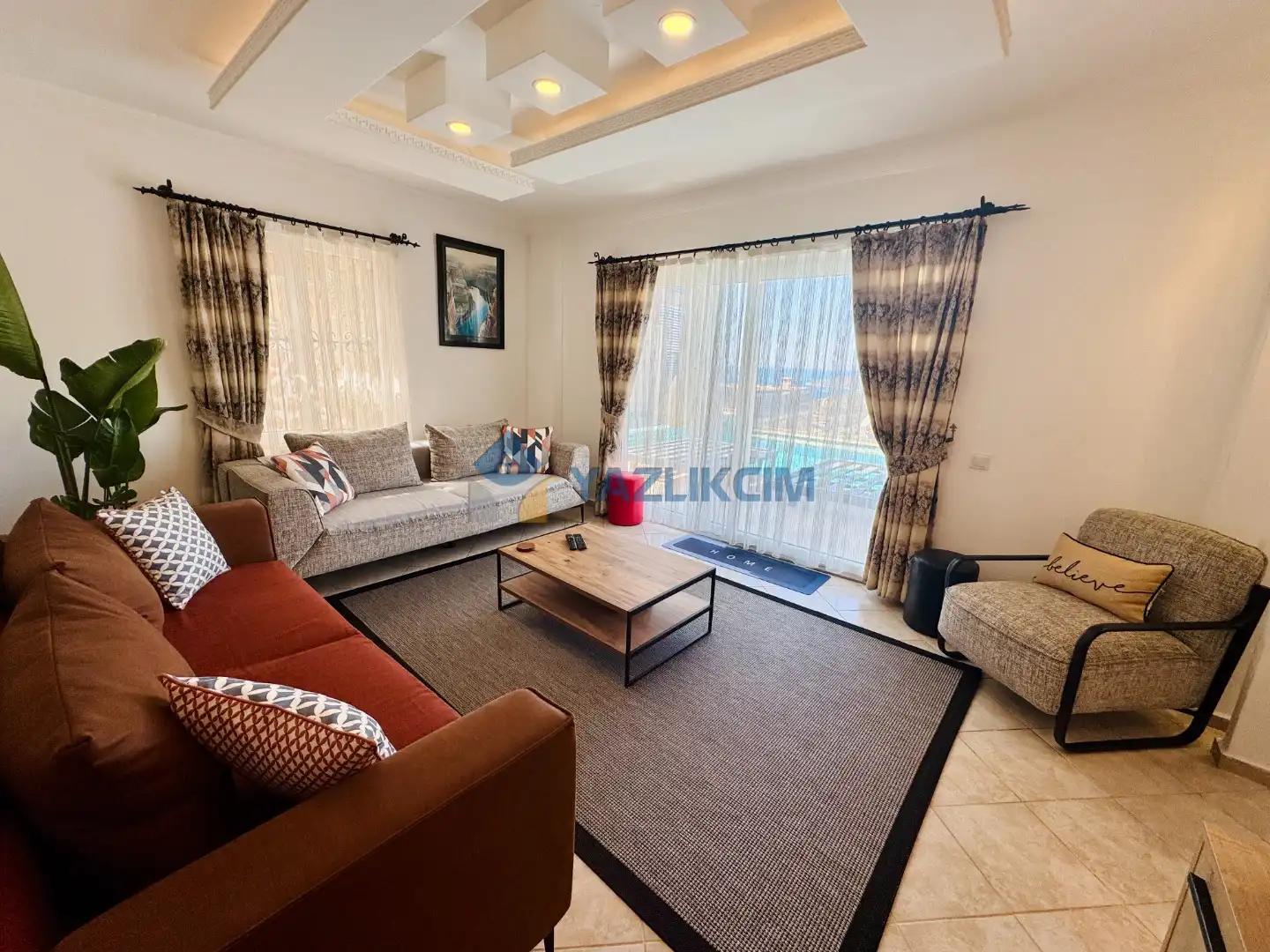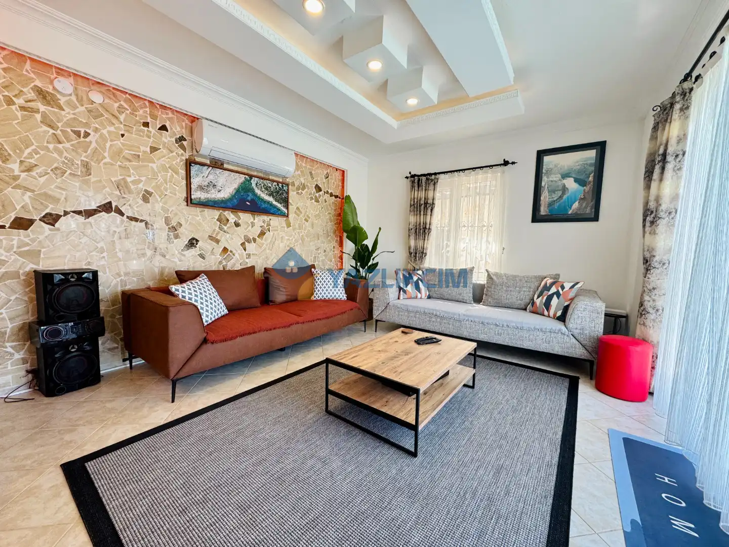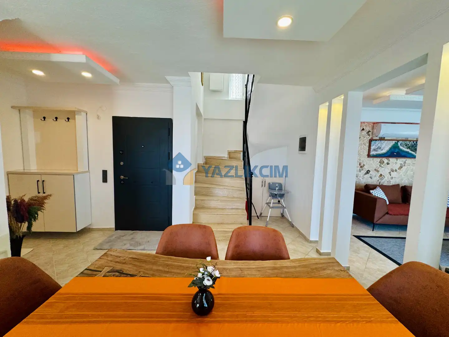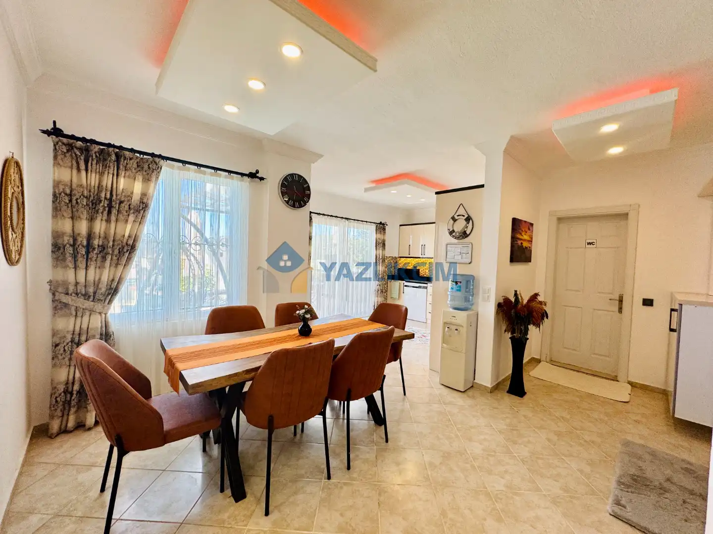 Salon Detaylari: LCD TV, uydu alici, modern oturma grubu, yemek masasi ve sandalyeler bulunmaktadir.
