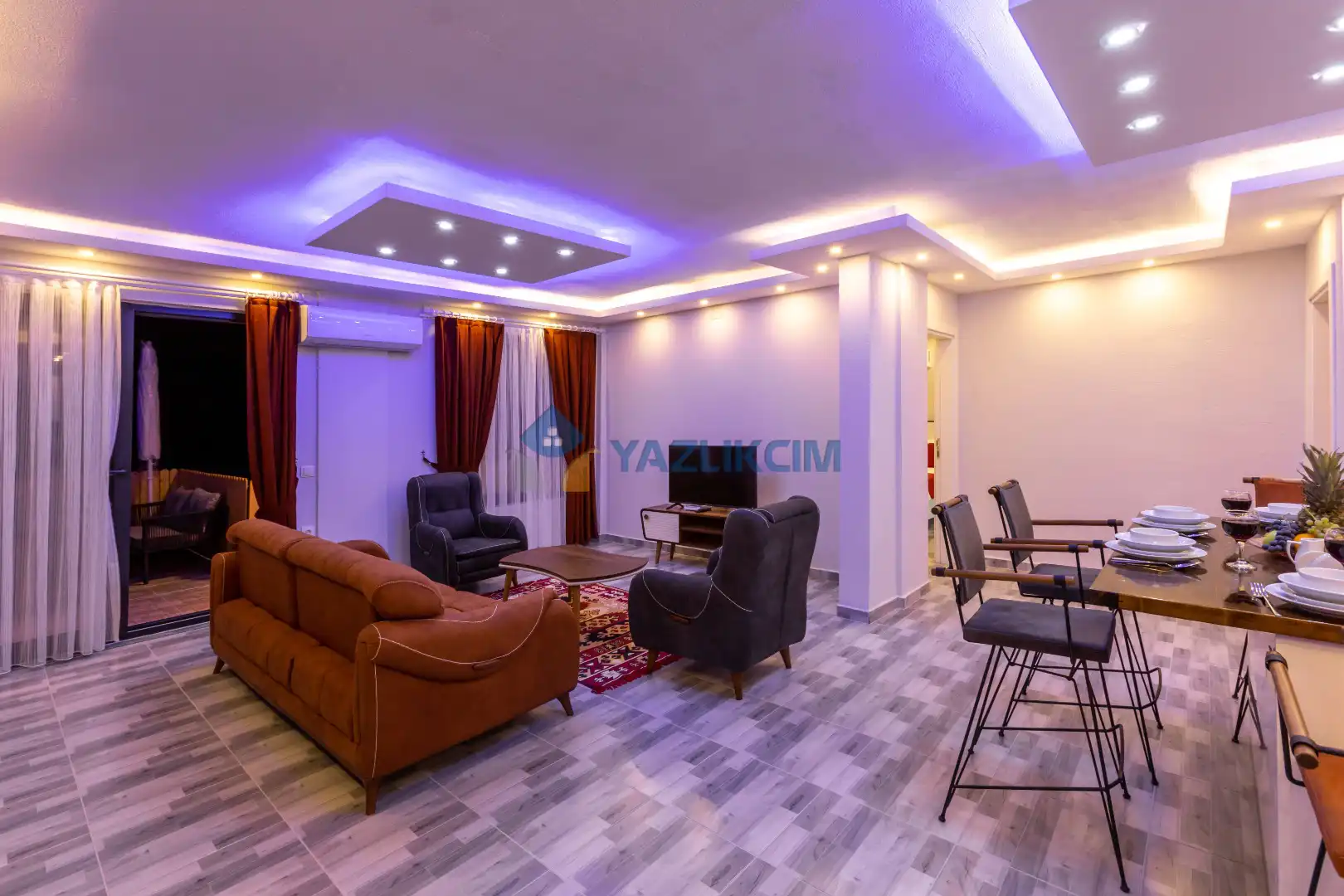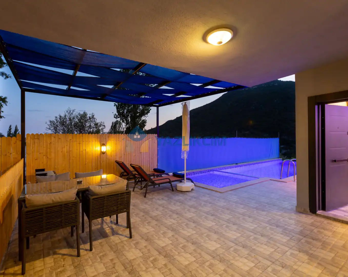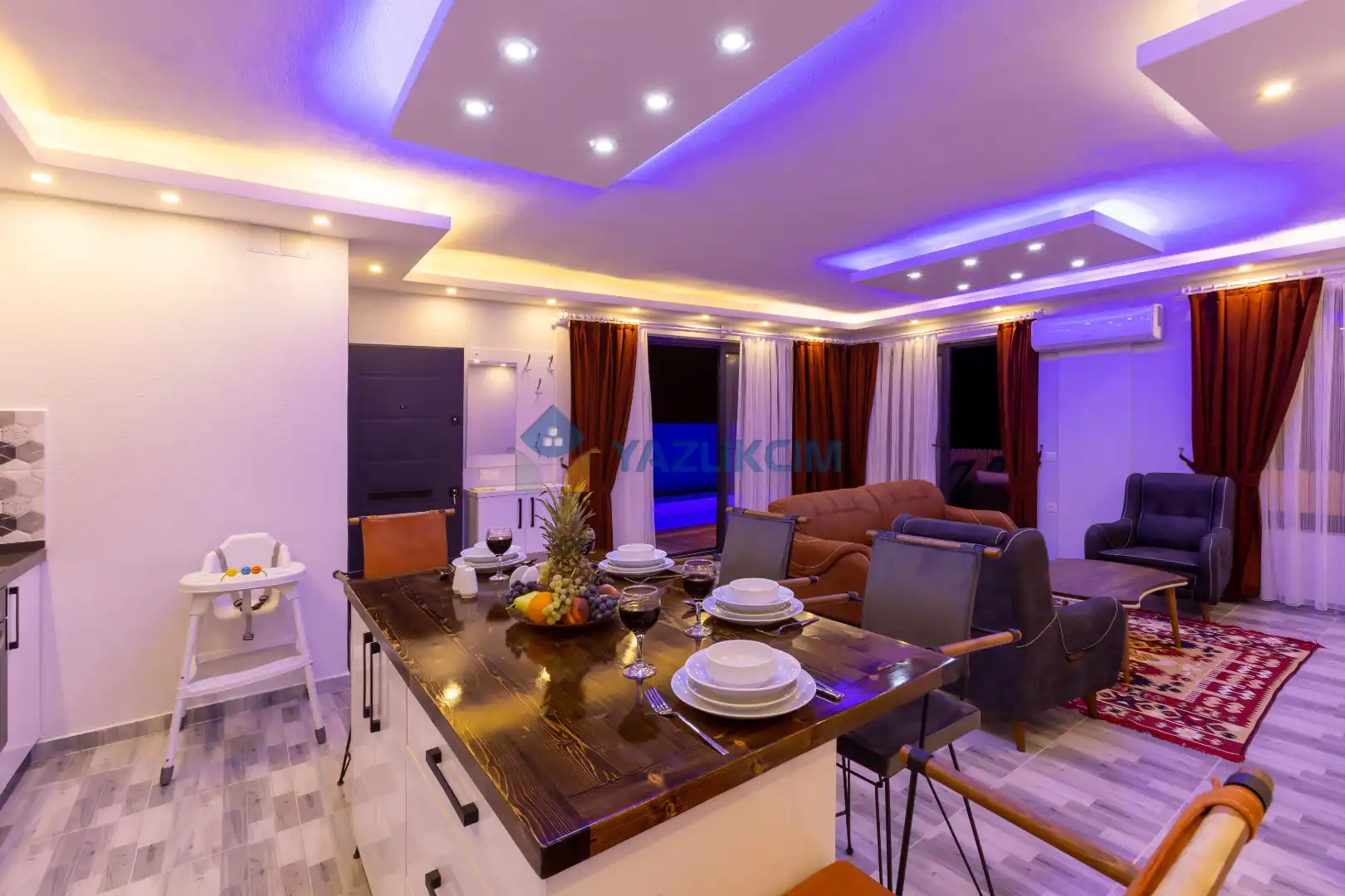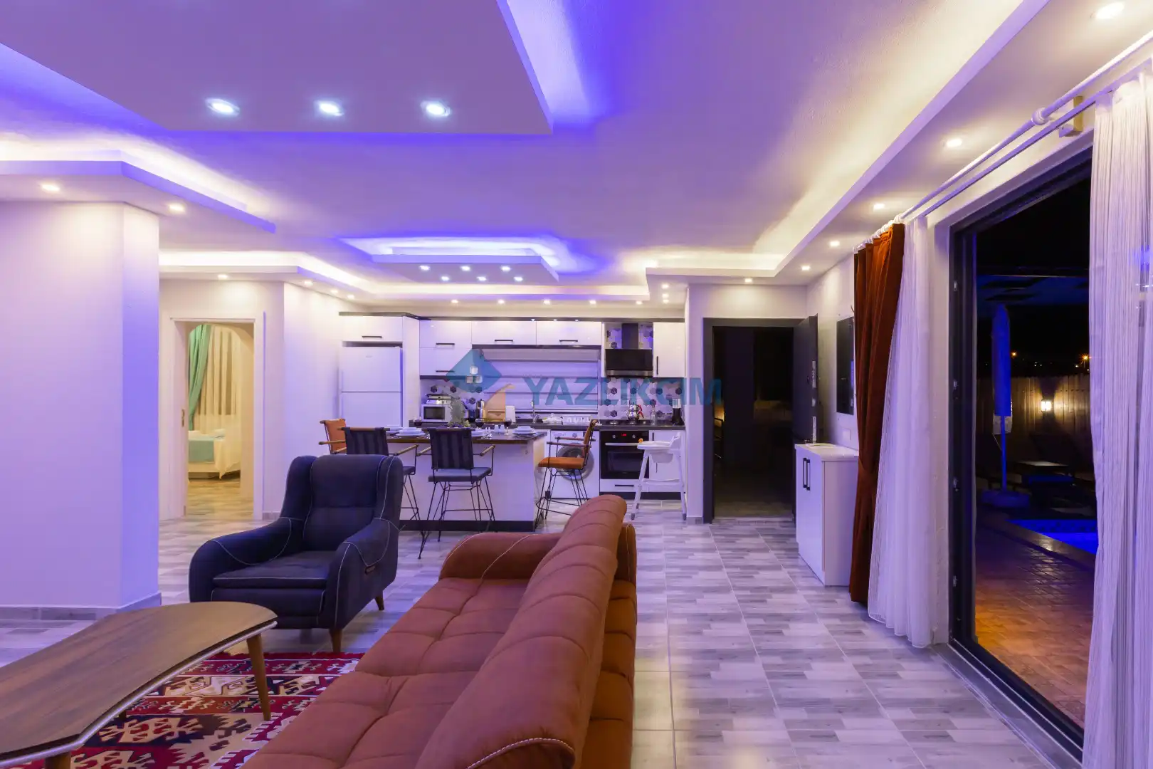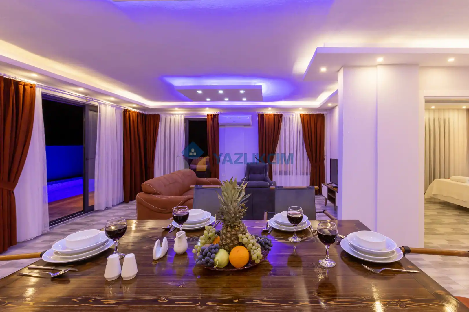 Salon Detayları : Oturma grubu, Uydu TV (LCD), Klima, 4 kişilik yemek masası, Havuz terasına çıkış bulunmaktadır.
