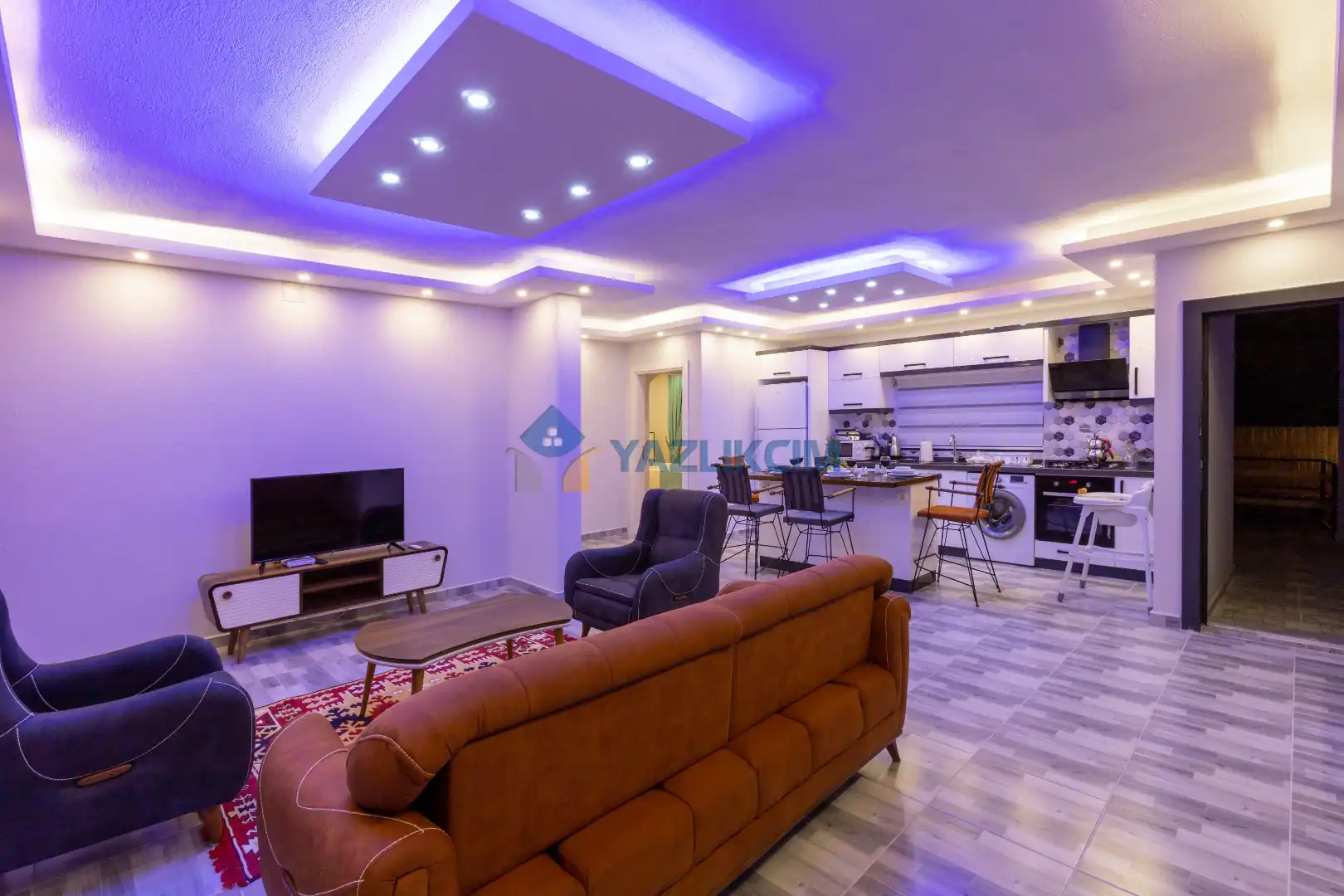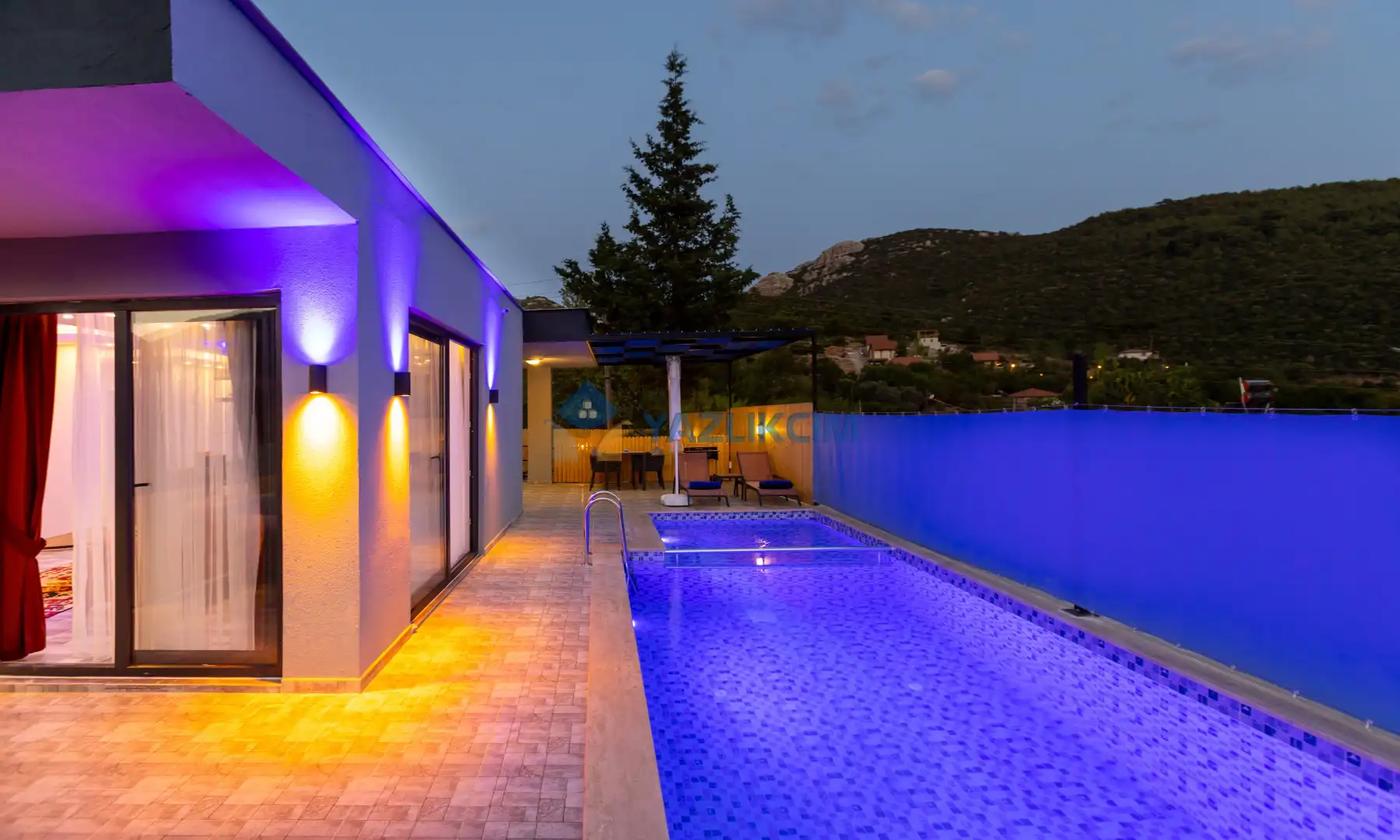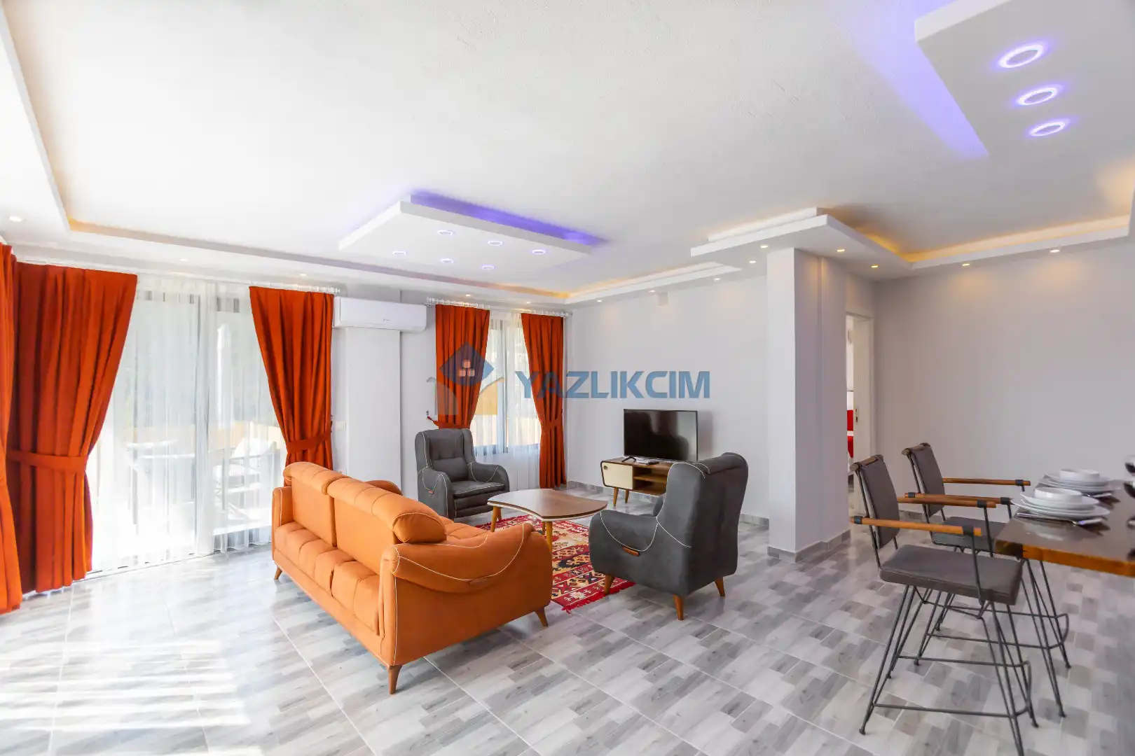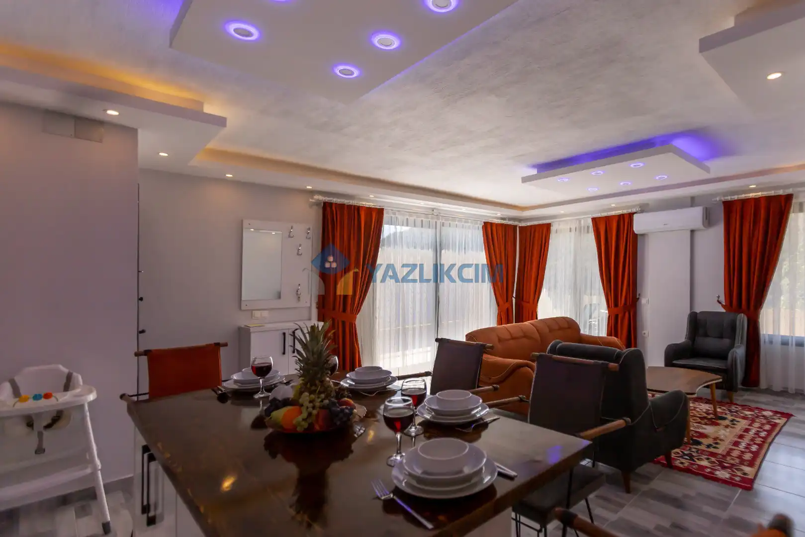Salon Detayları : Oturma grubu, Uydu TV (LCD), Klima, 4 kişilik yemek masası, Havuz terasına çıkış bulunmaktadır.