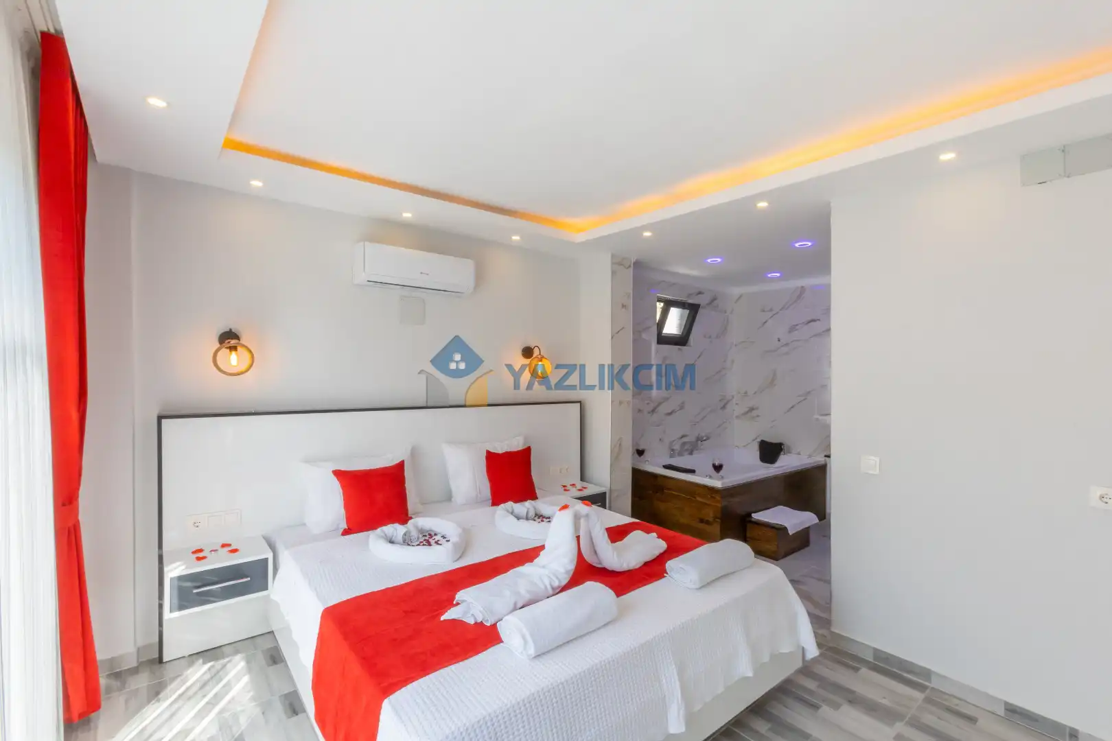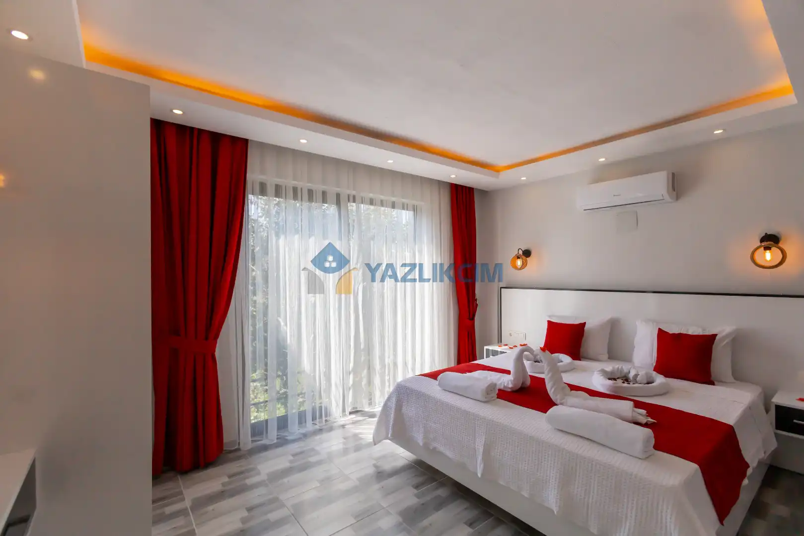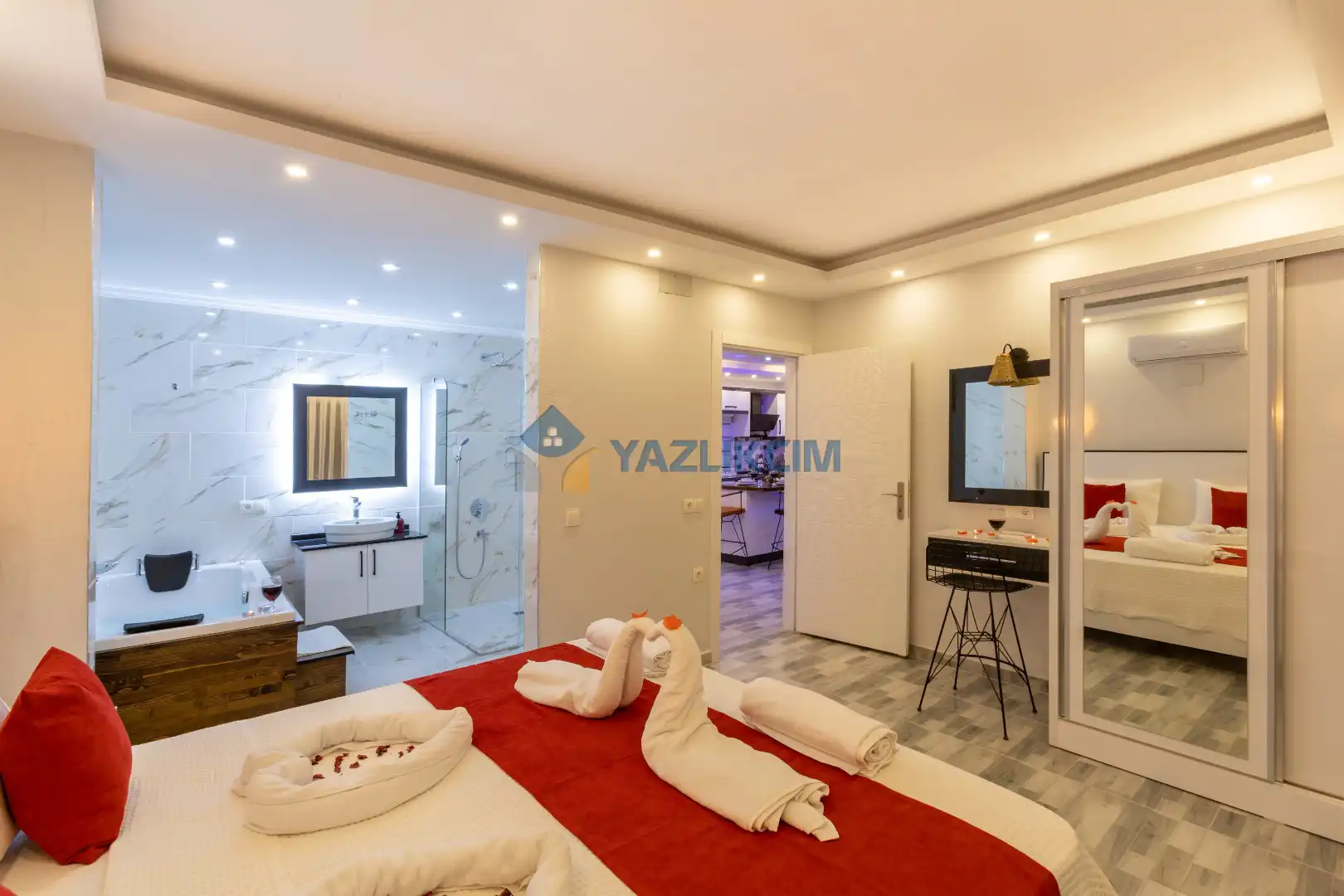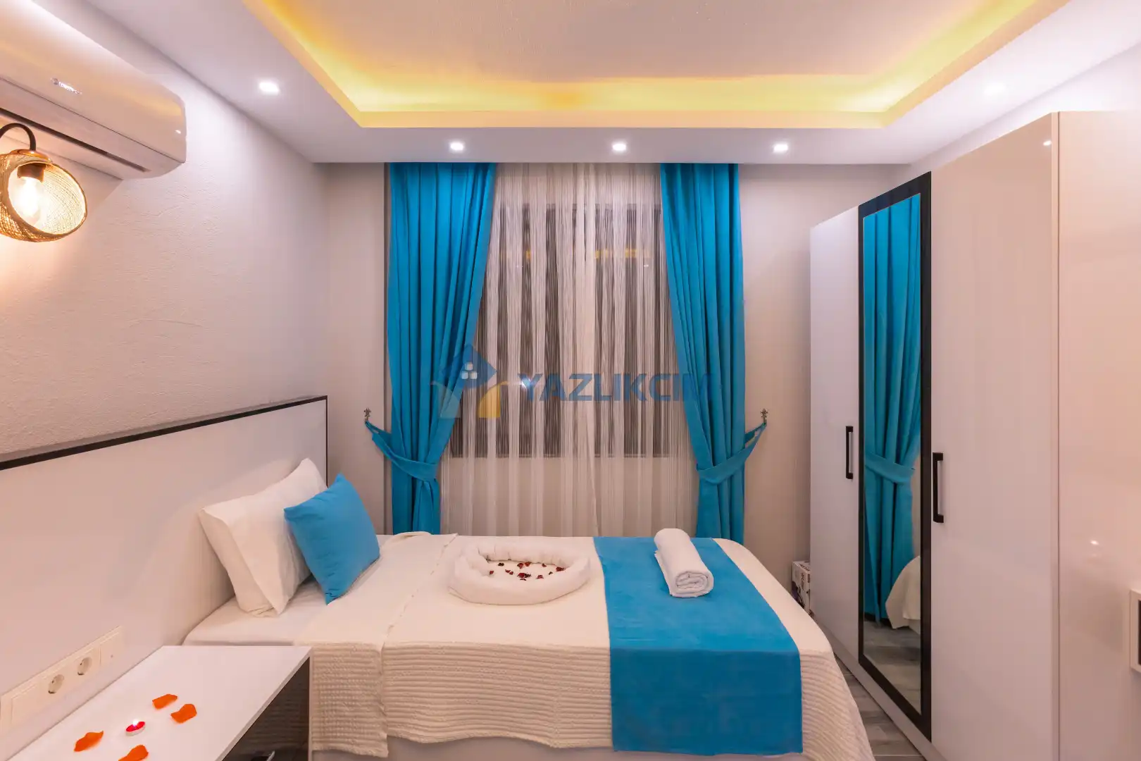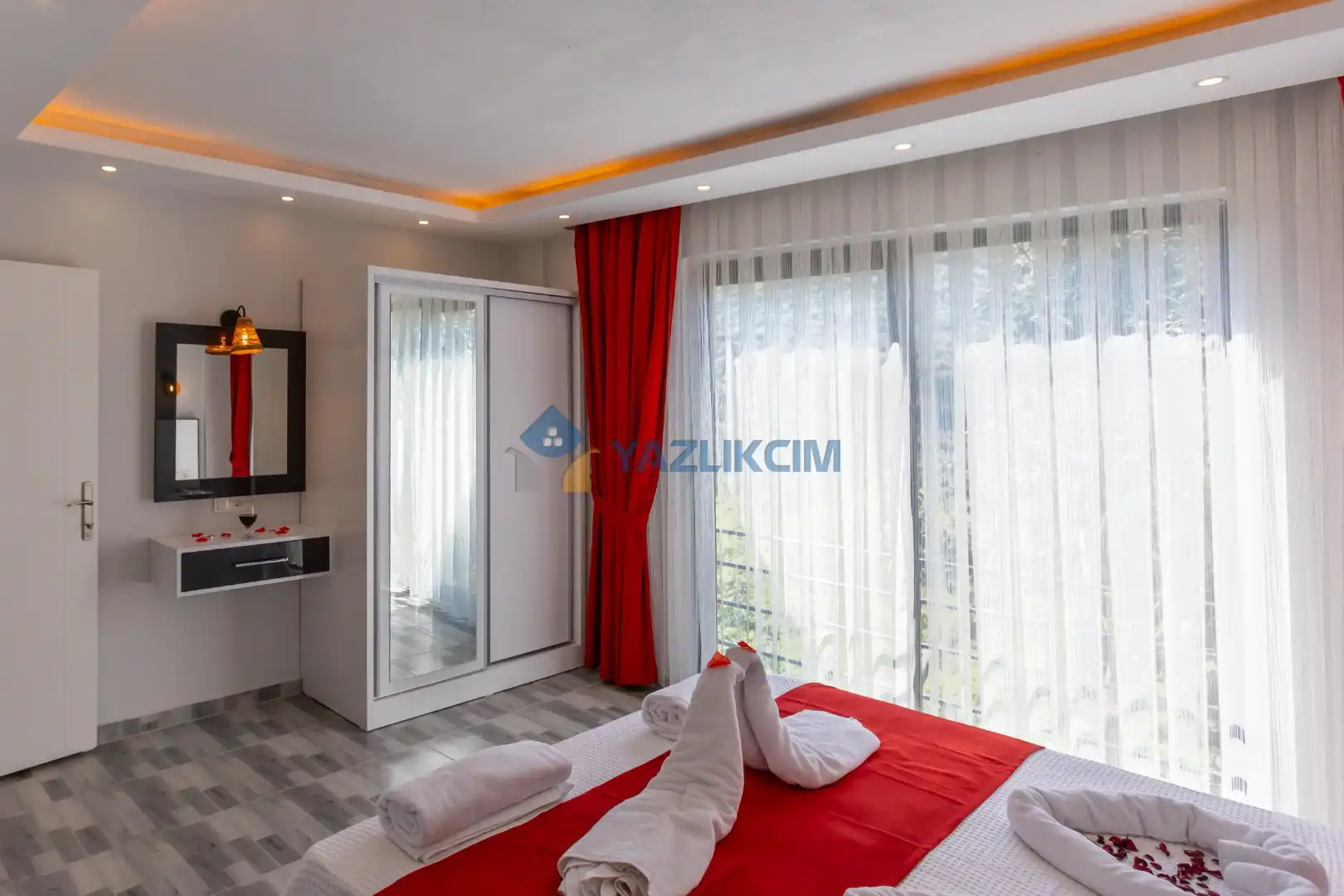 Detayları :Çift kişilik yatak, Makyaj masası, Komodin, Klima, Elbise dolabı, Banyo/WC