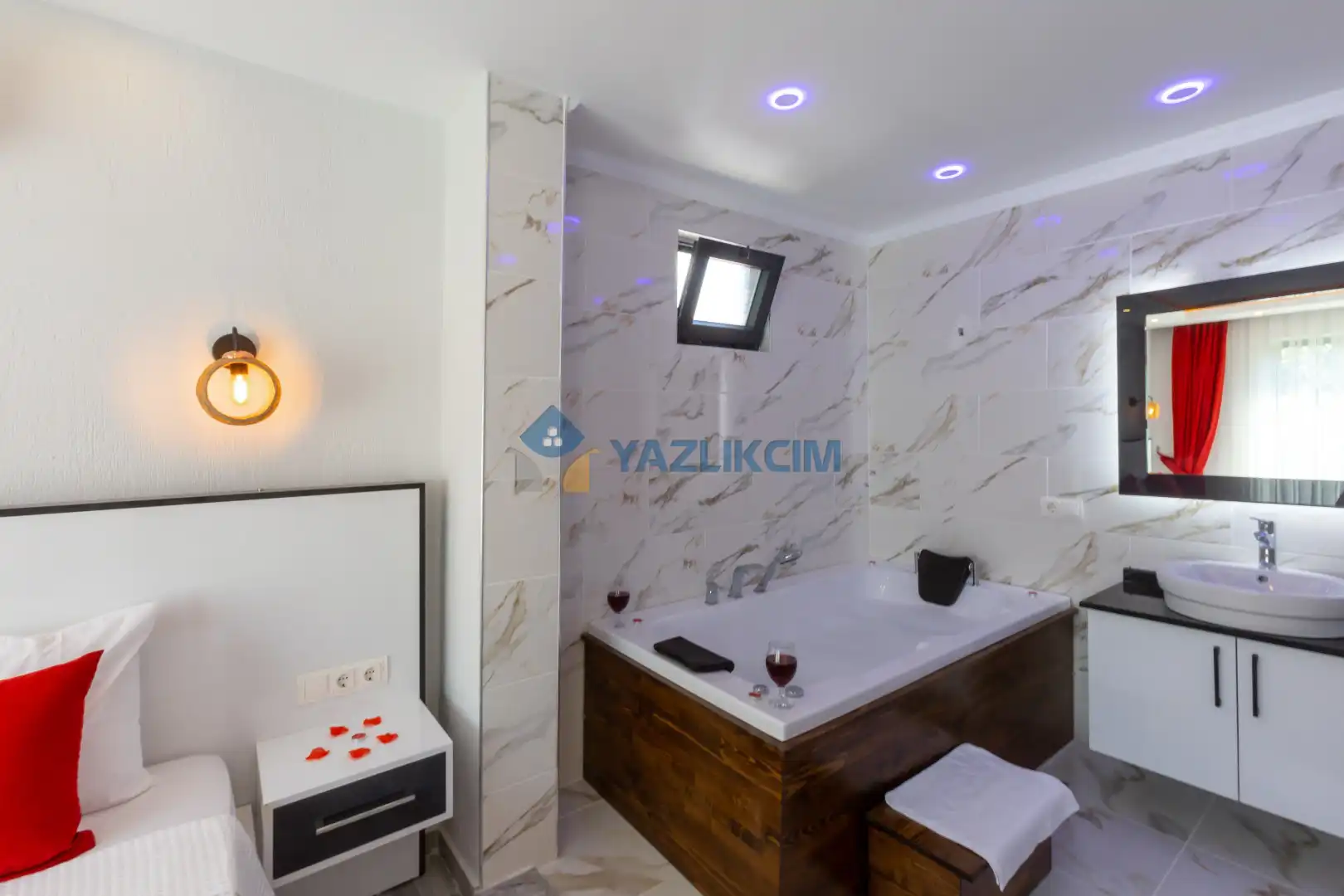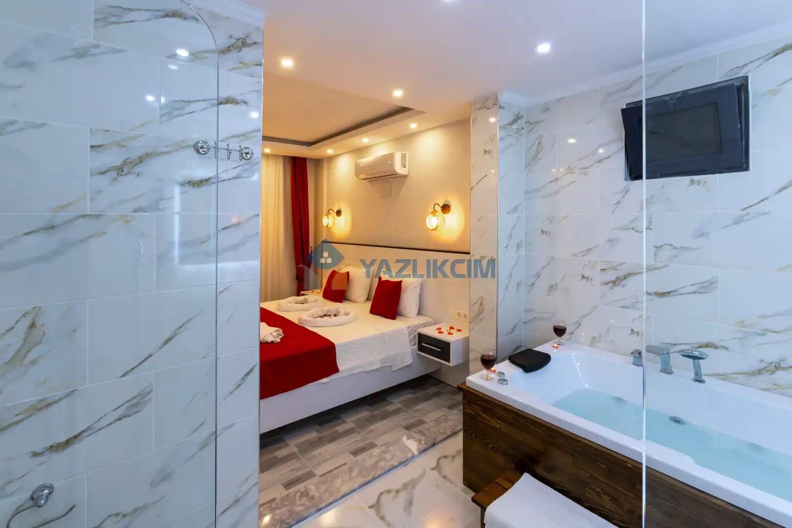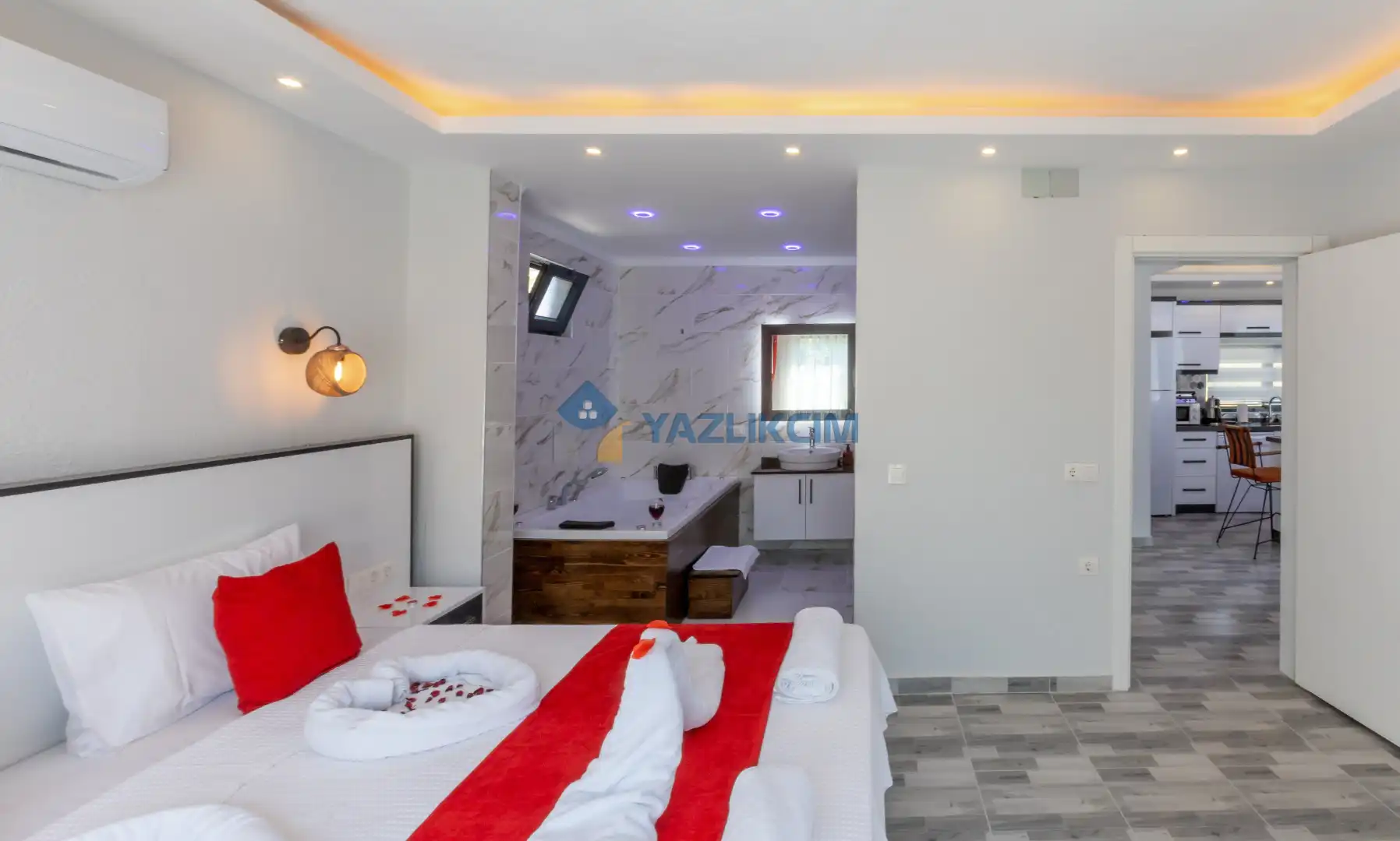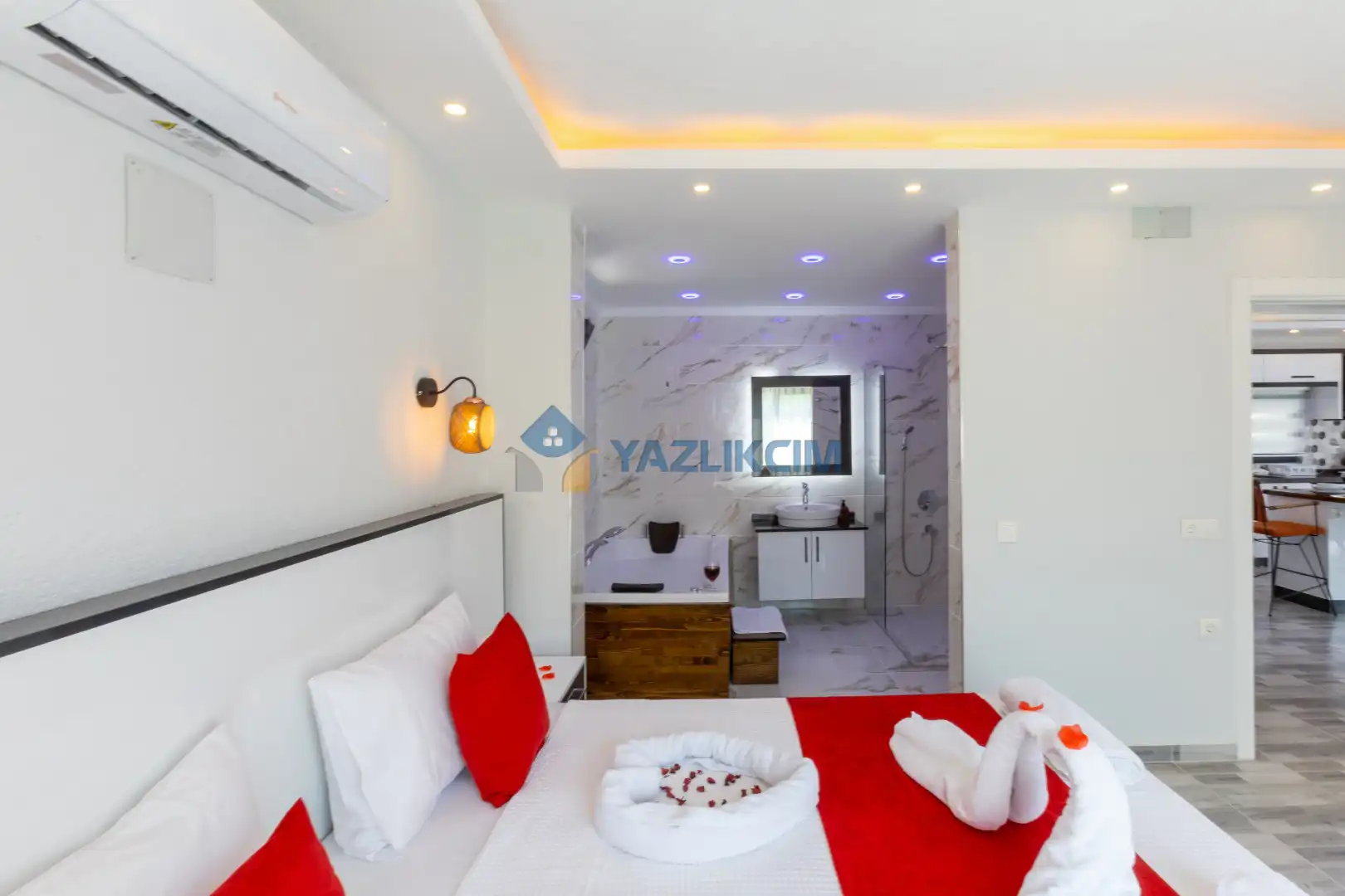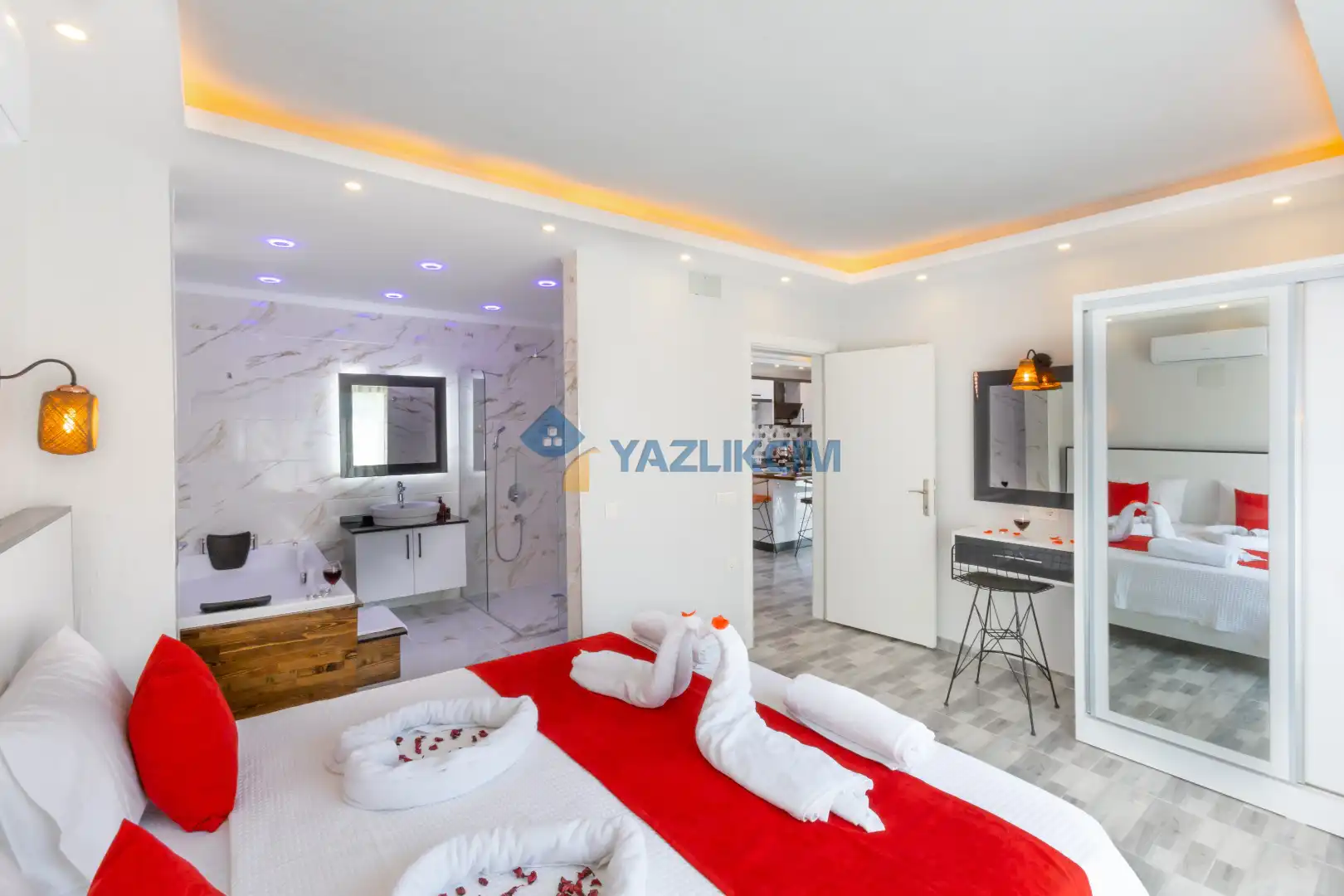 Detayları :Çift kişilik yatak, Makyaj masası, Komodin, Klima, Elbise dolabı, Banyo/WC