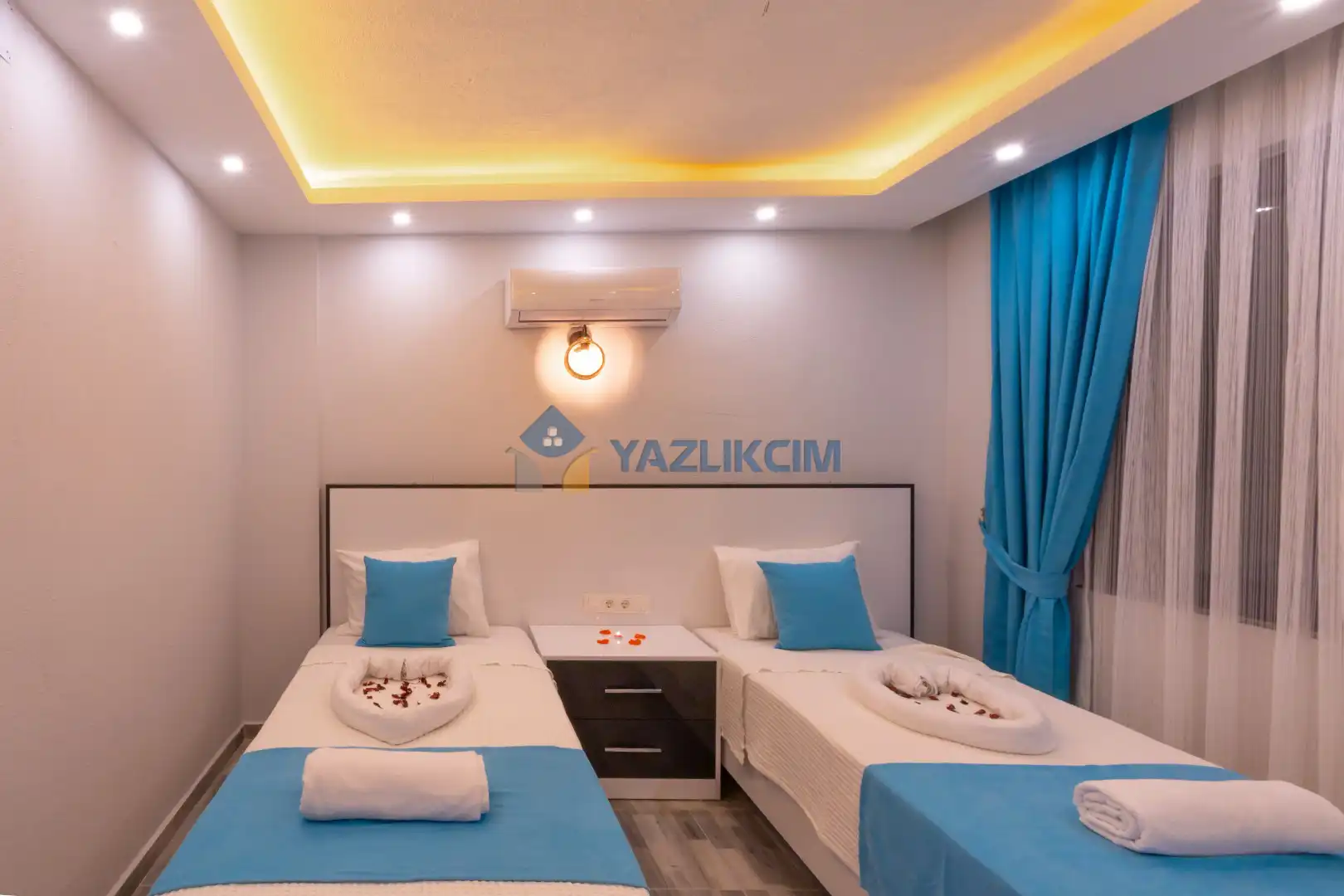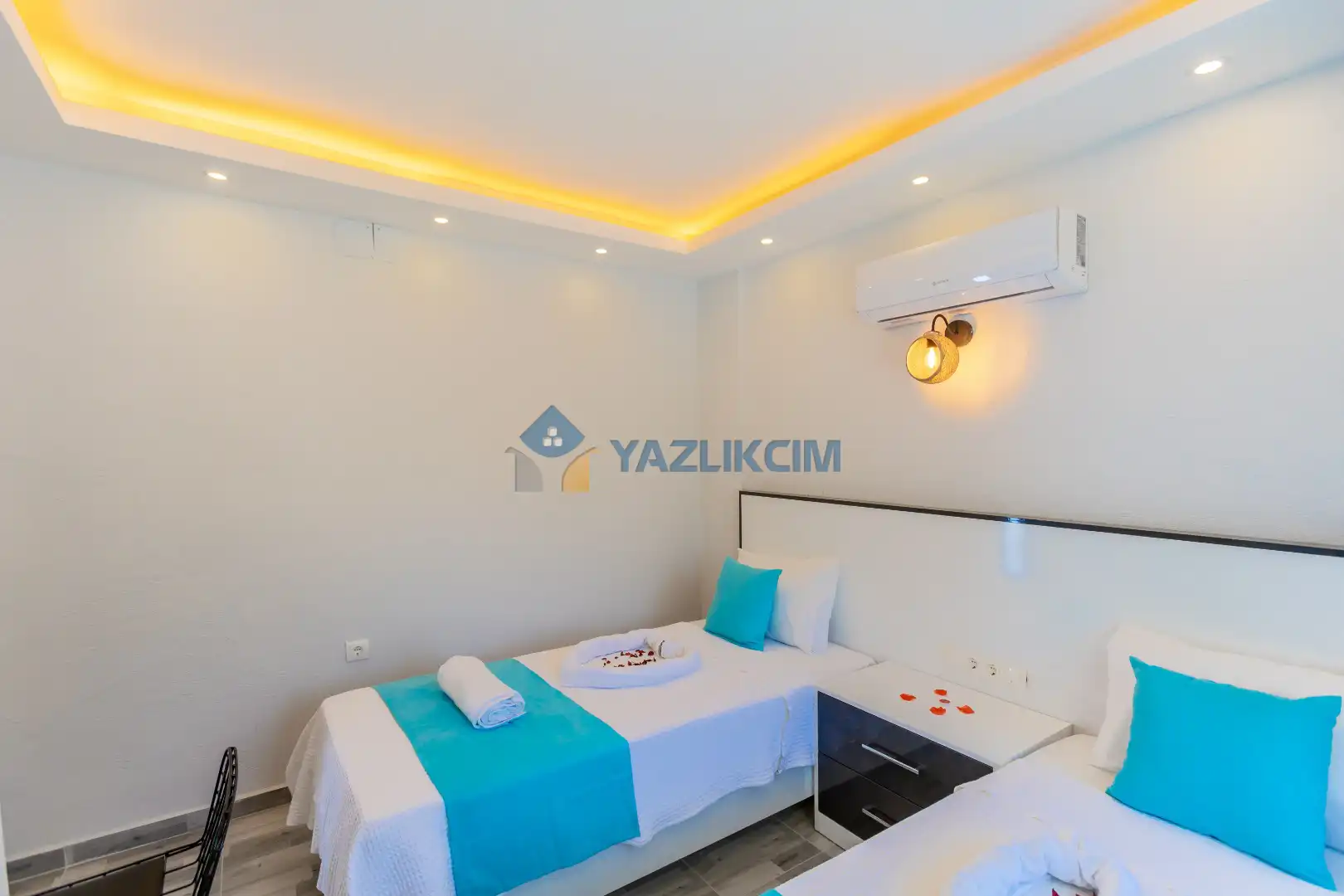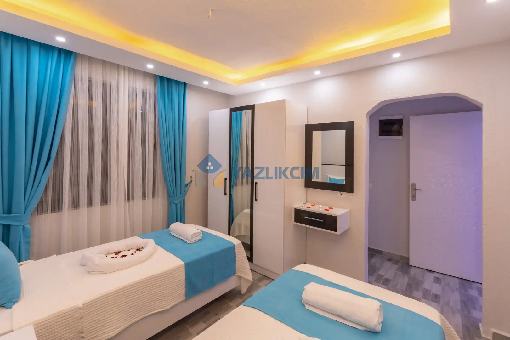 Detayları :2 Adet tek kişilik yatak, Komodin, Makyaj masası, Klima, Elbise dolabı, Banyo/WC