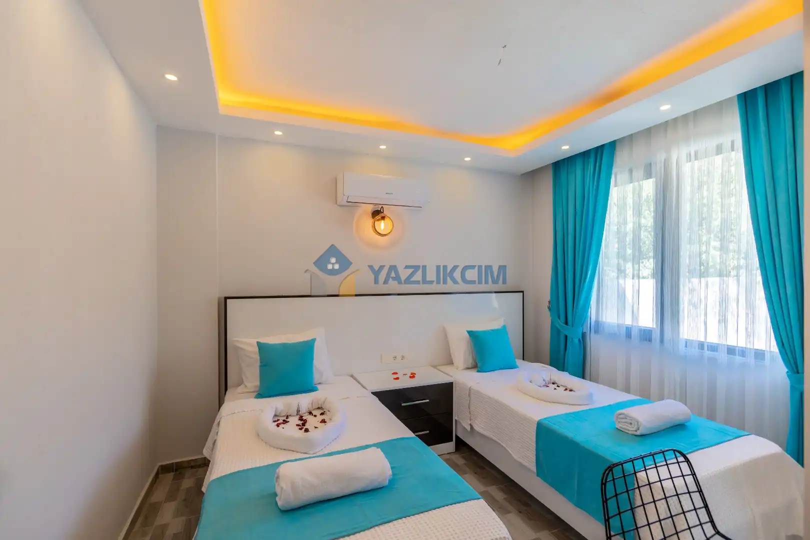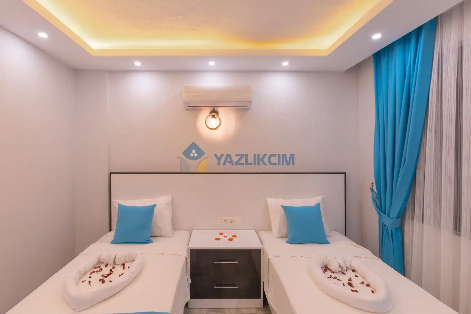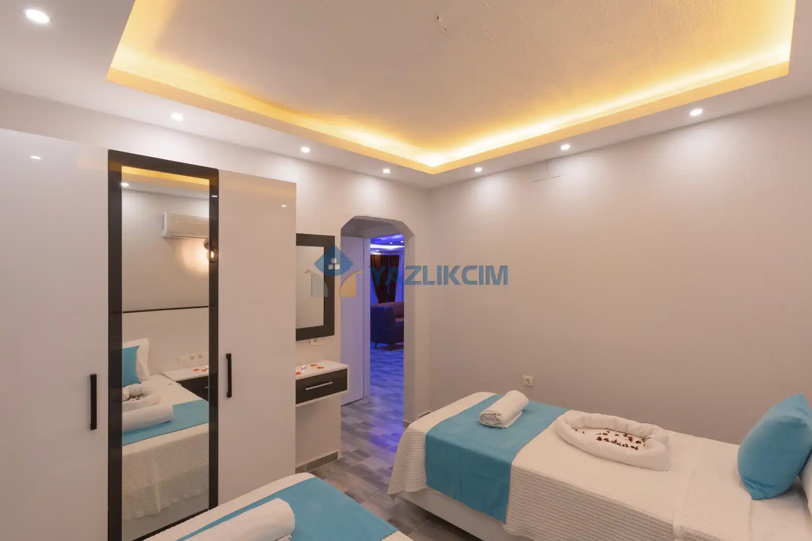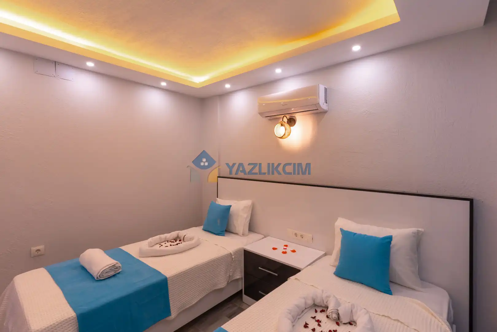 Detayları :2 Adet tek kişilik yatak, Komodin, Makyaj masası, Klima, Elbise dolabı, Banyo/WC