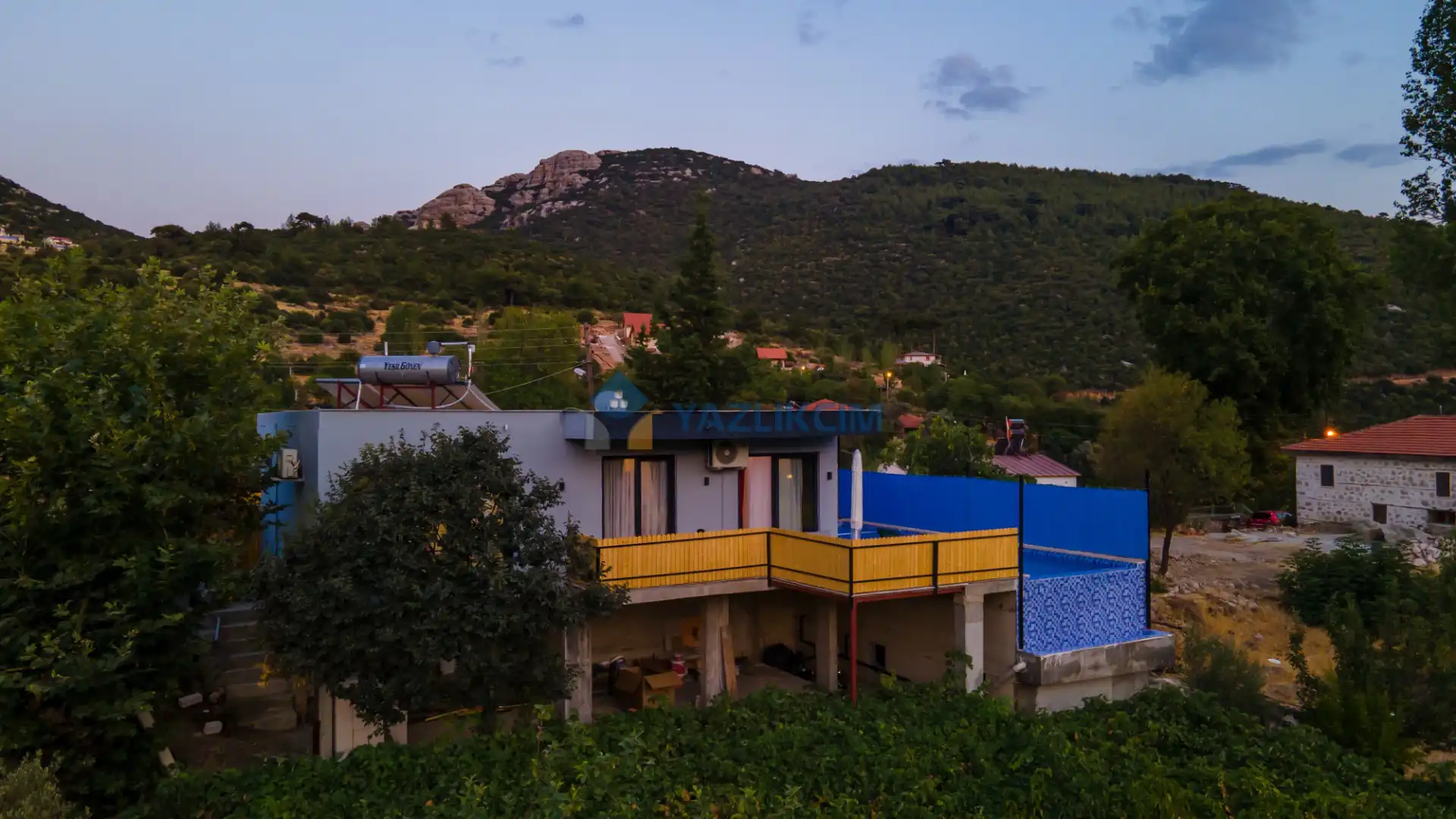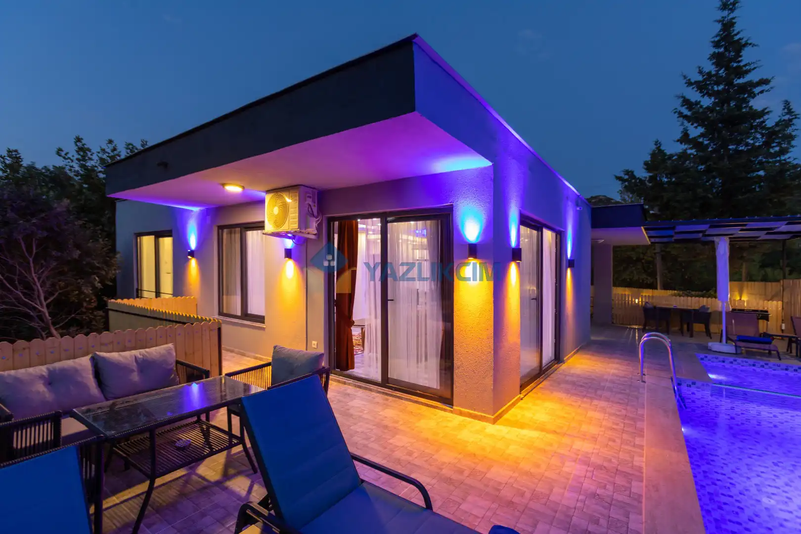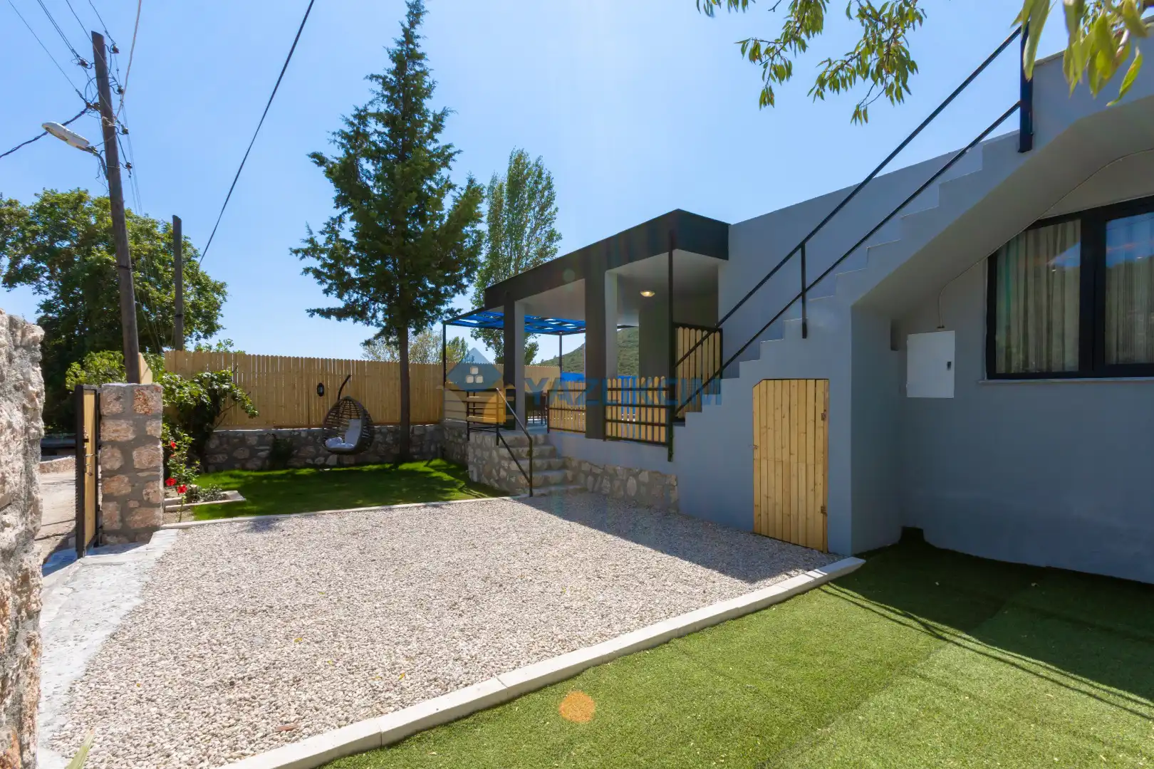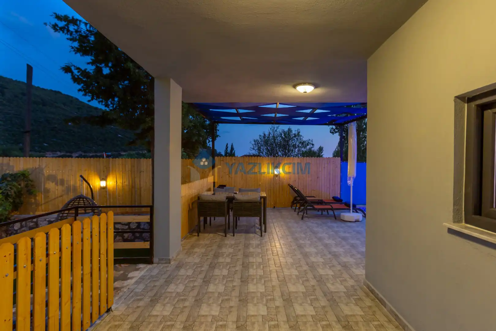 Detayları : 4 Kişilik masa ve sandalye, Oturma grubu, 2 adet şezlong, Barbekü, Salıncak, Güneş şemsiyesi, Çocuk havuzu