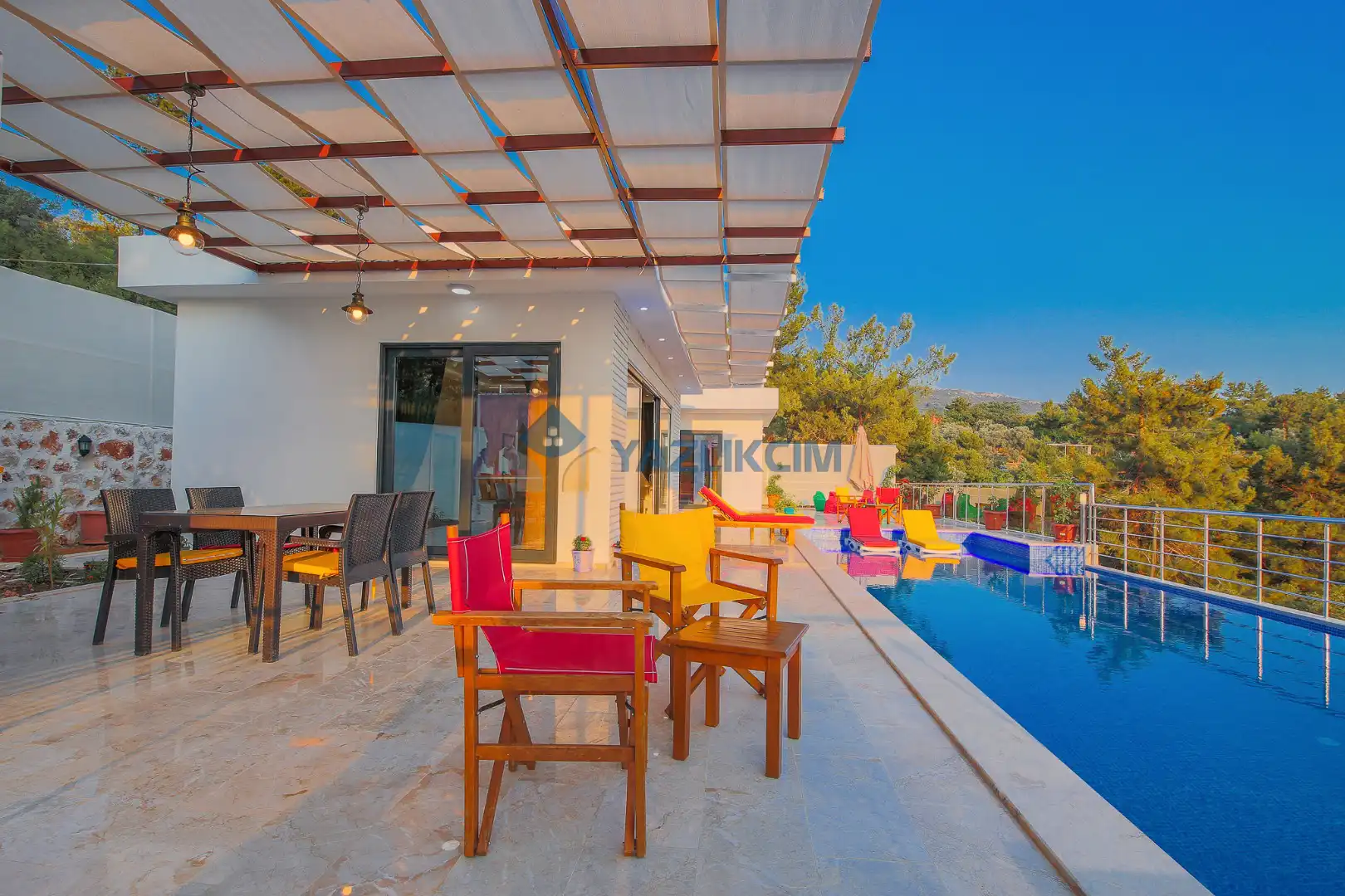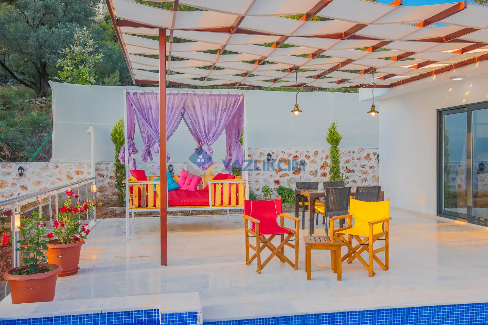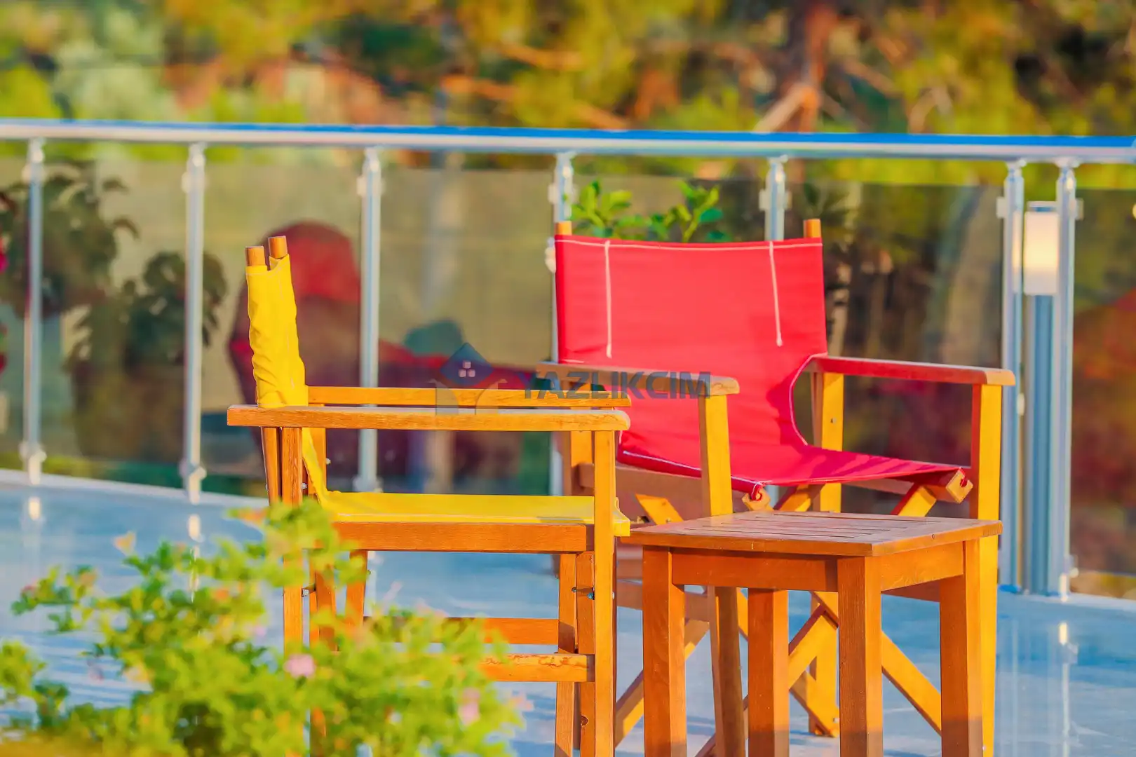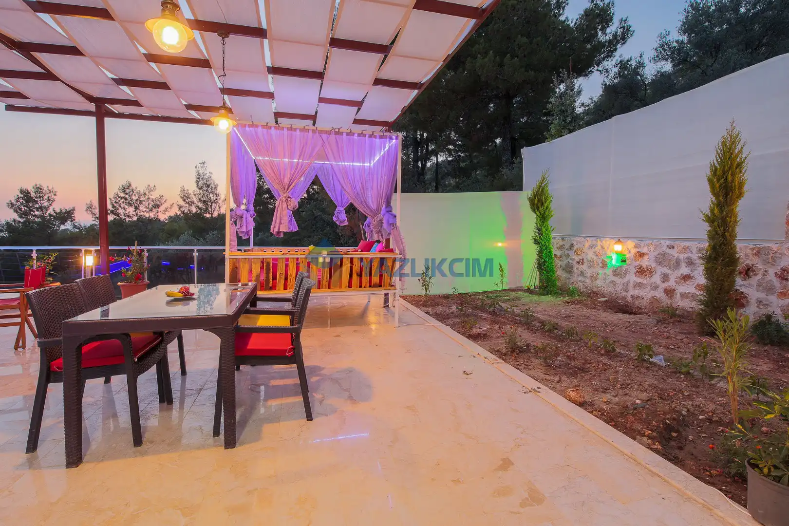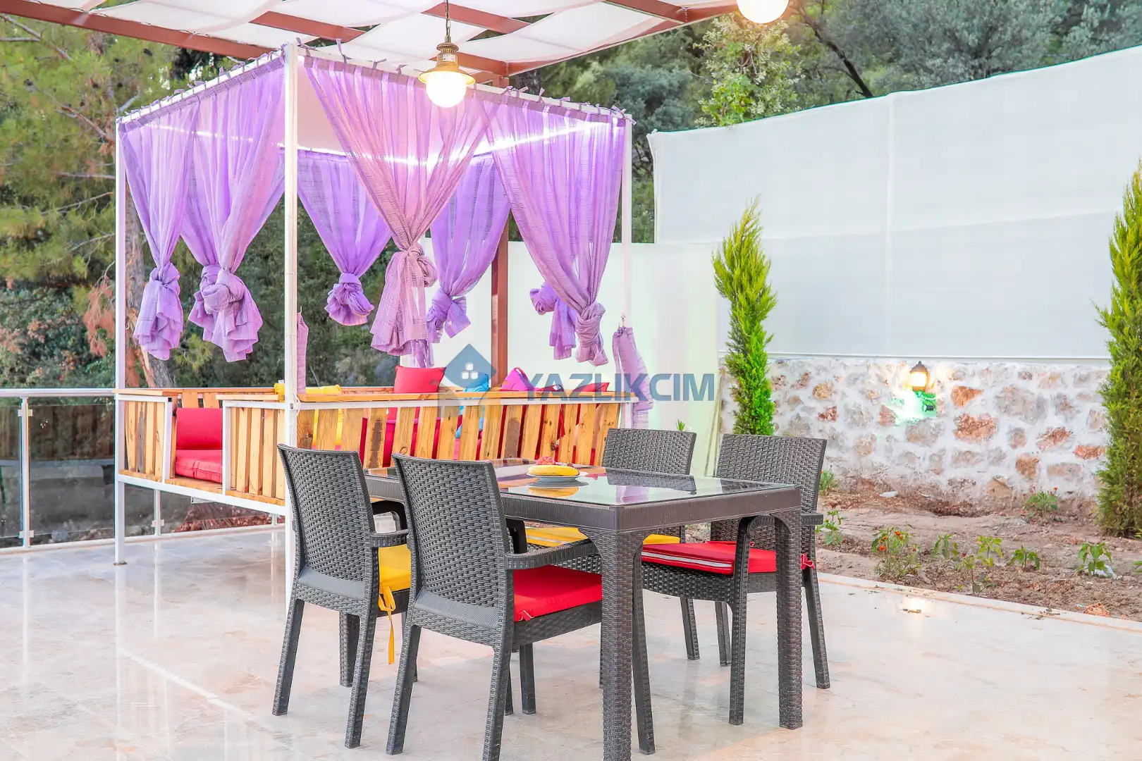 Detayları : şezlong, güneş şemsiyesi, yemek masası, köşk, 4 adet armut koltuk bulunmaktadır.