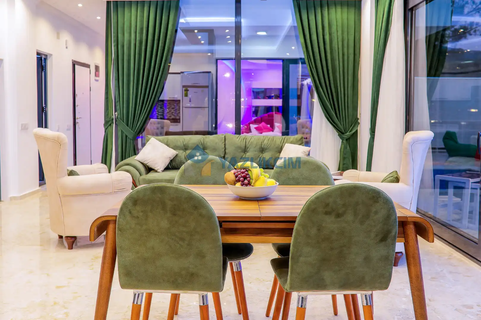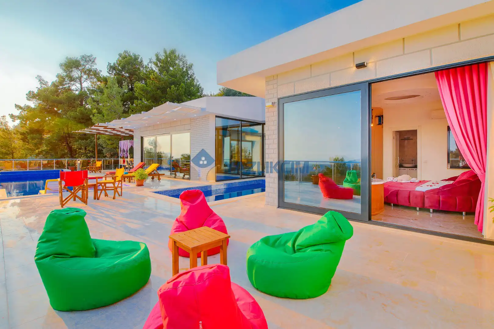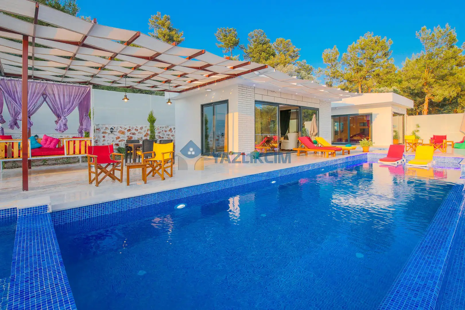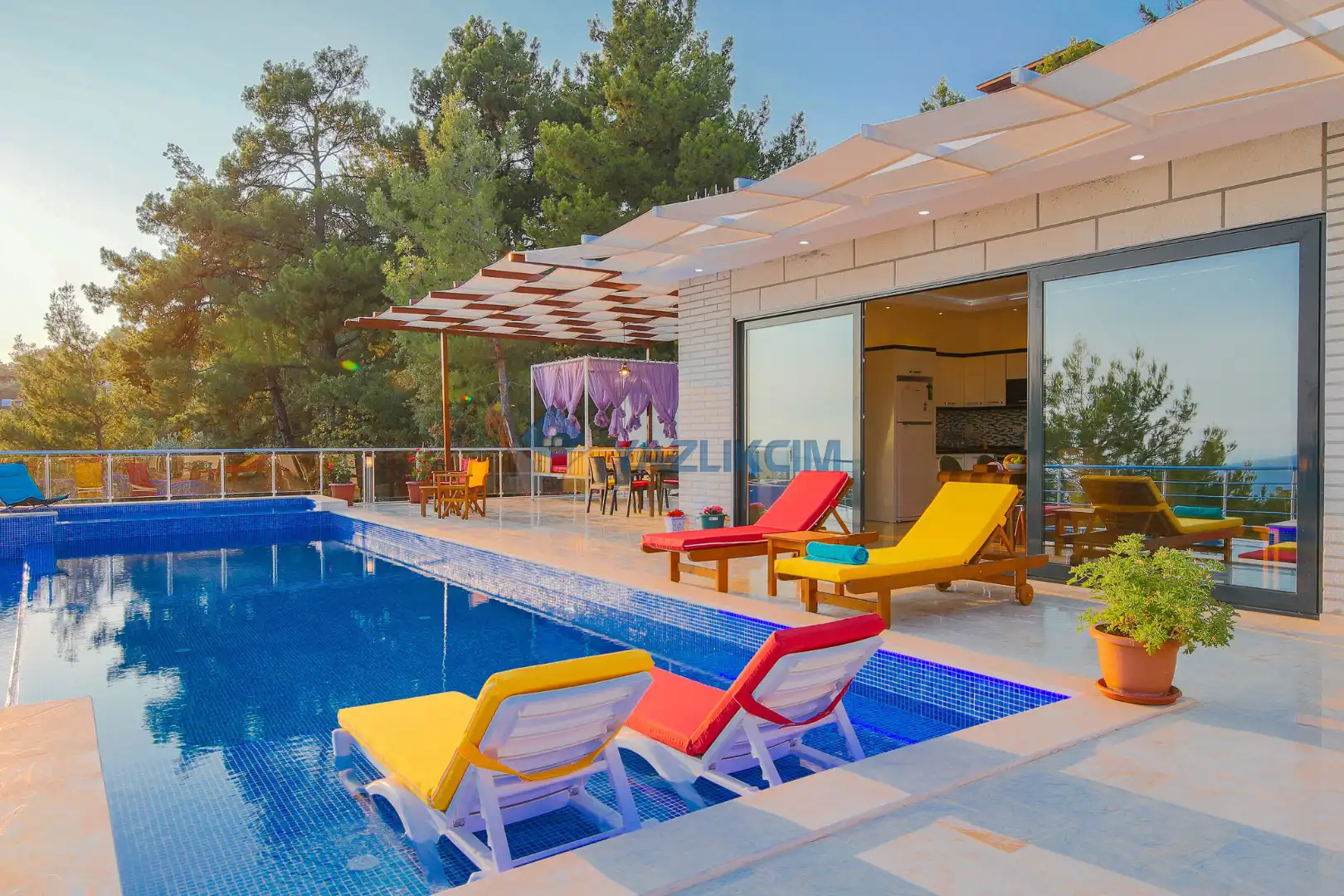 Detayları : şezlong, güneş şemsiyesi, yemek masası, köşk, 4 adet armut koltuk bulunmaktadır.
