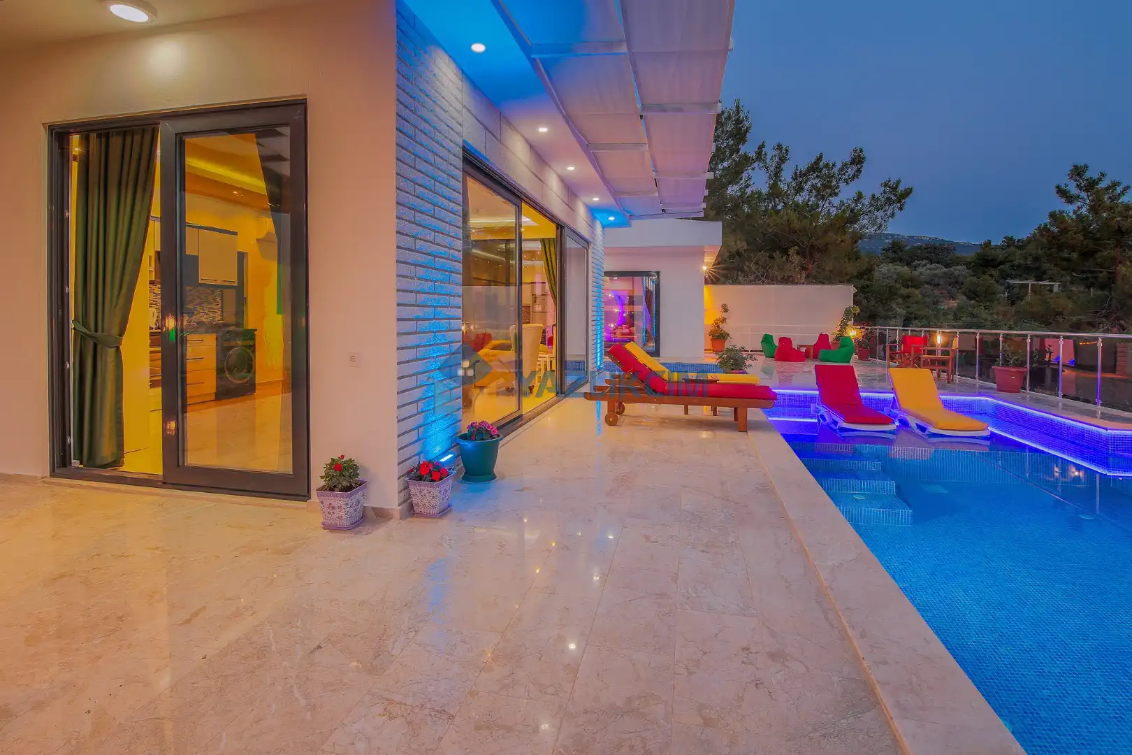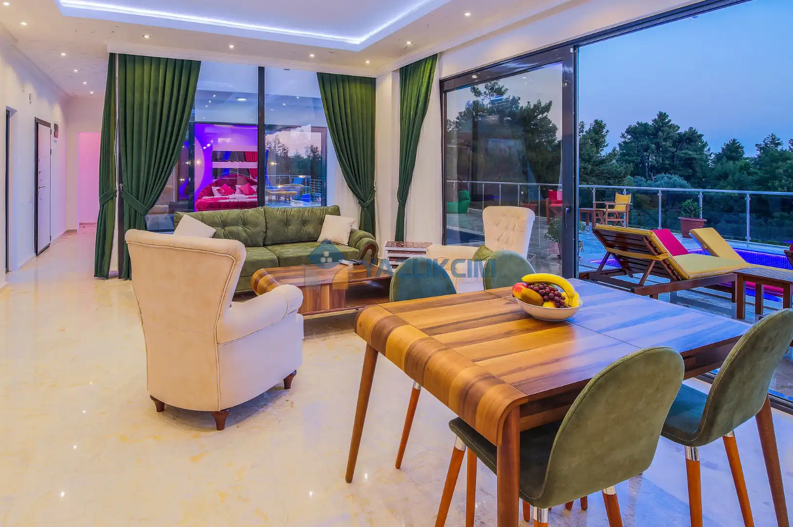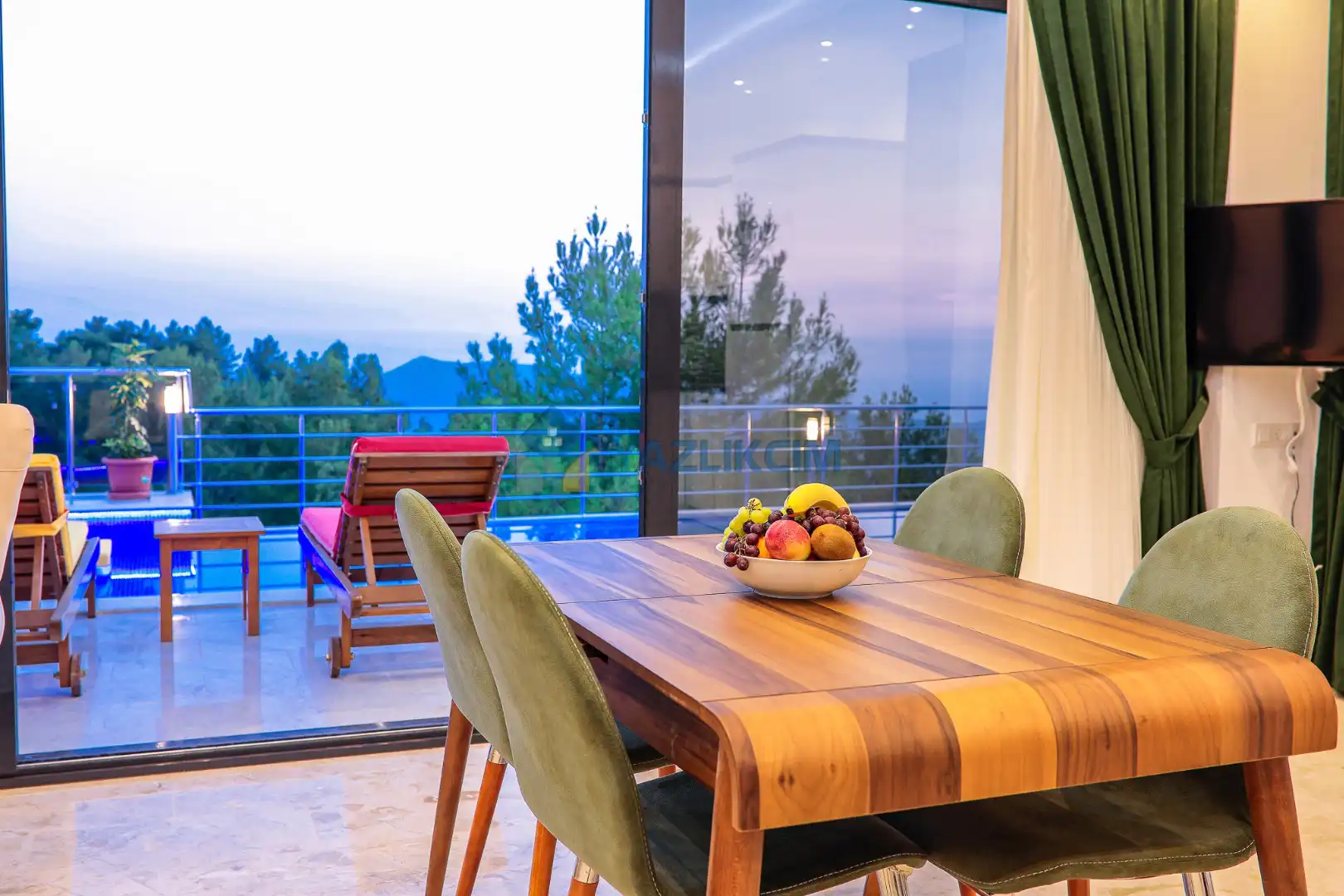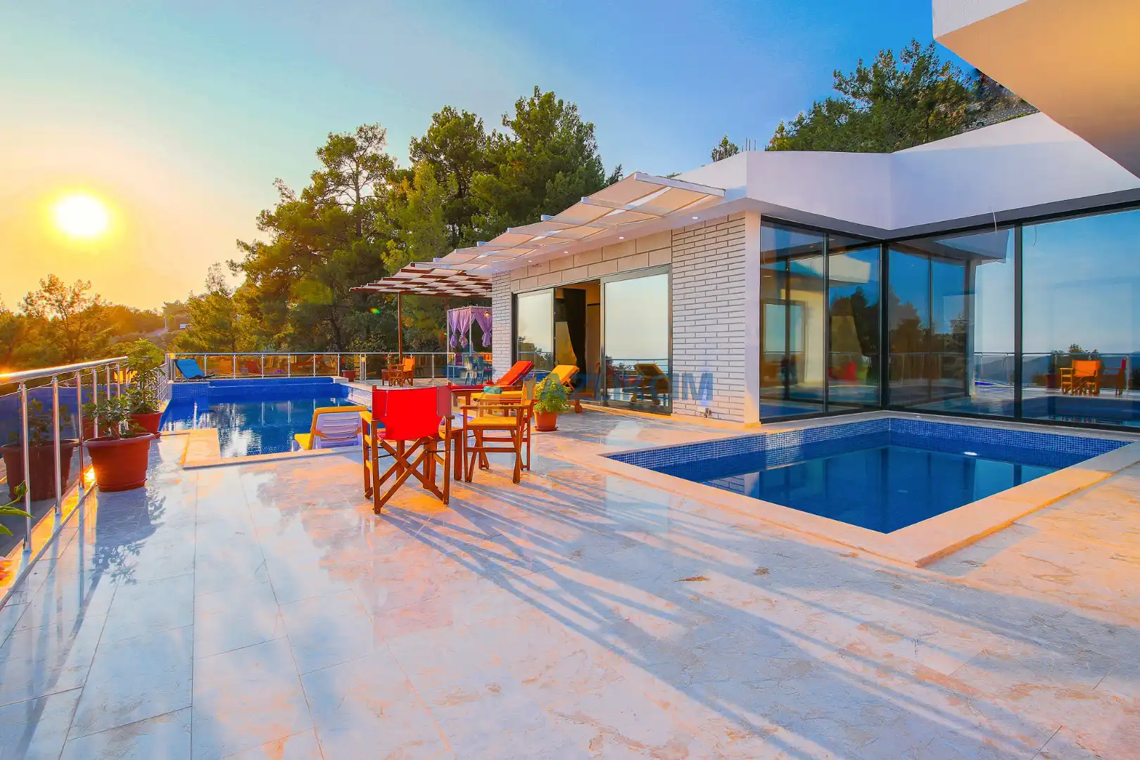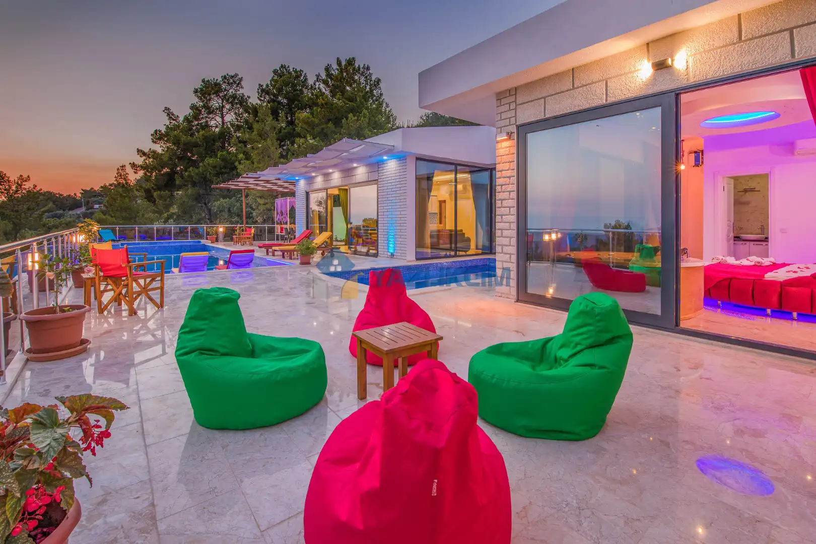 Detayları : şezlong, güneş şemsiyesi, yemek masası, köşk, 4 adet armut koltuk bulunmaktadır.