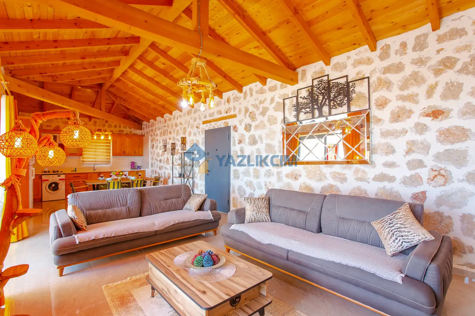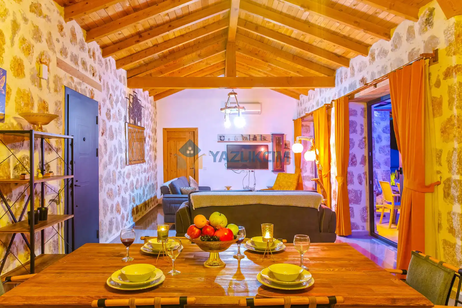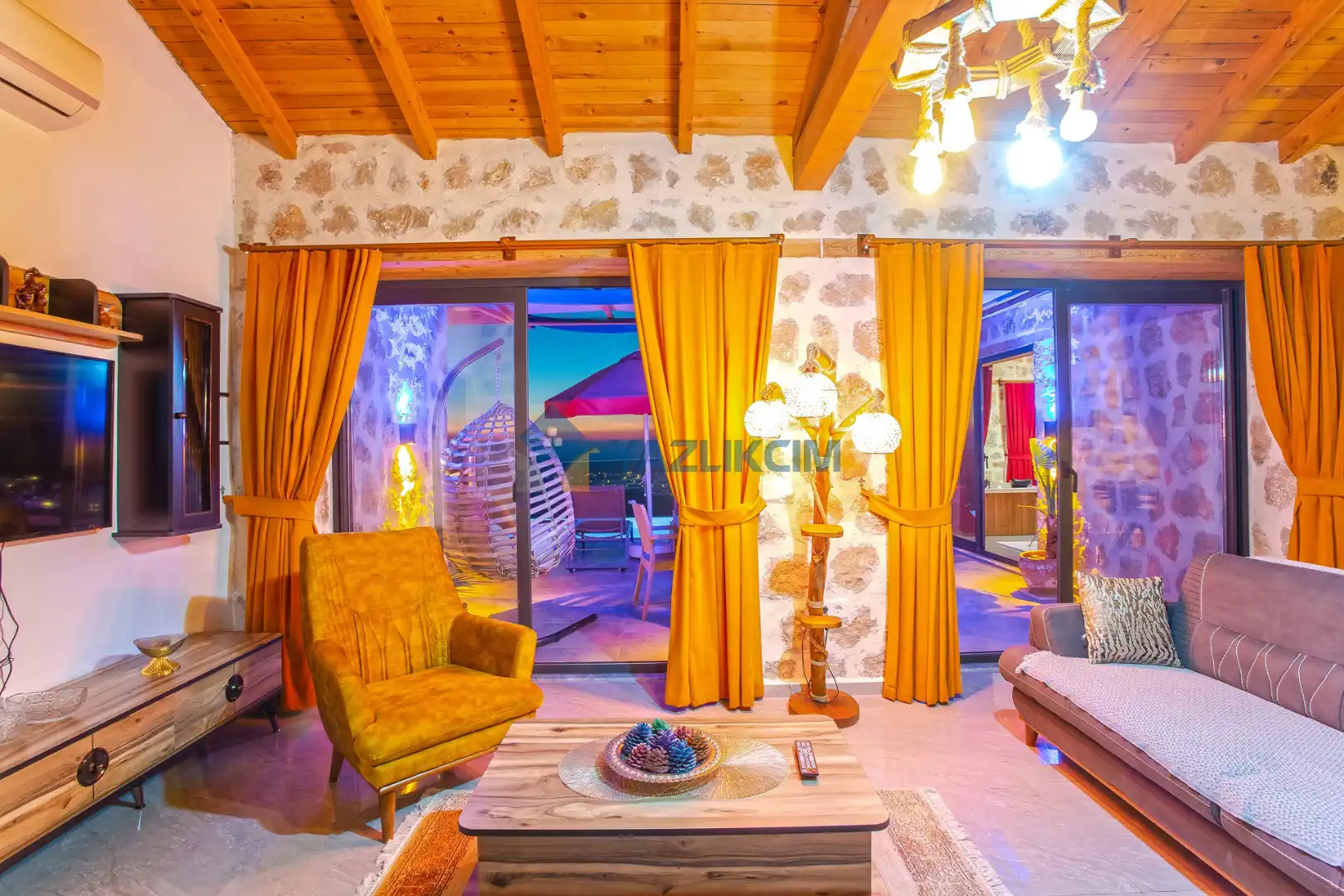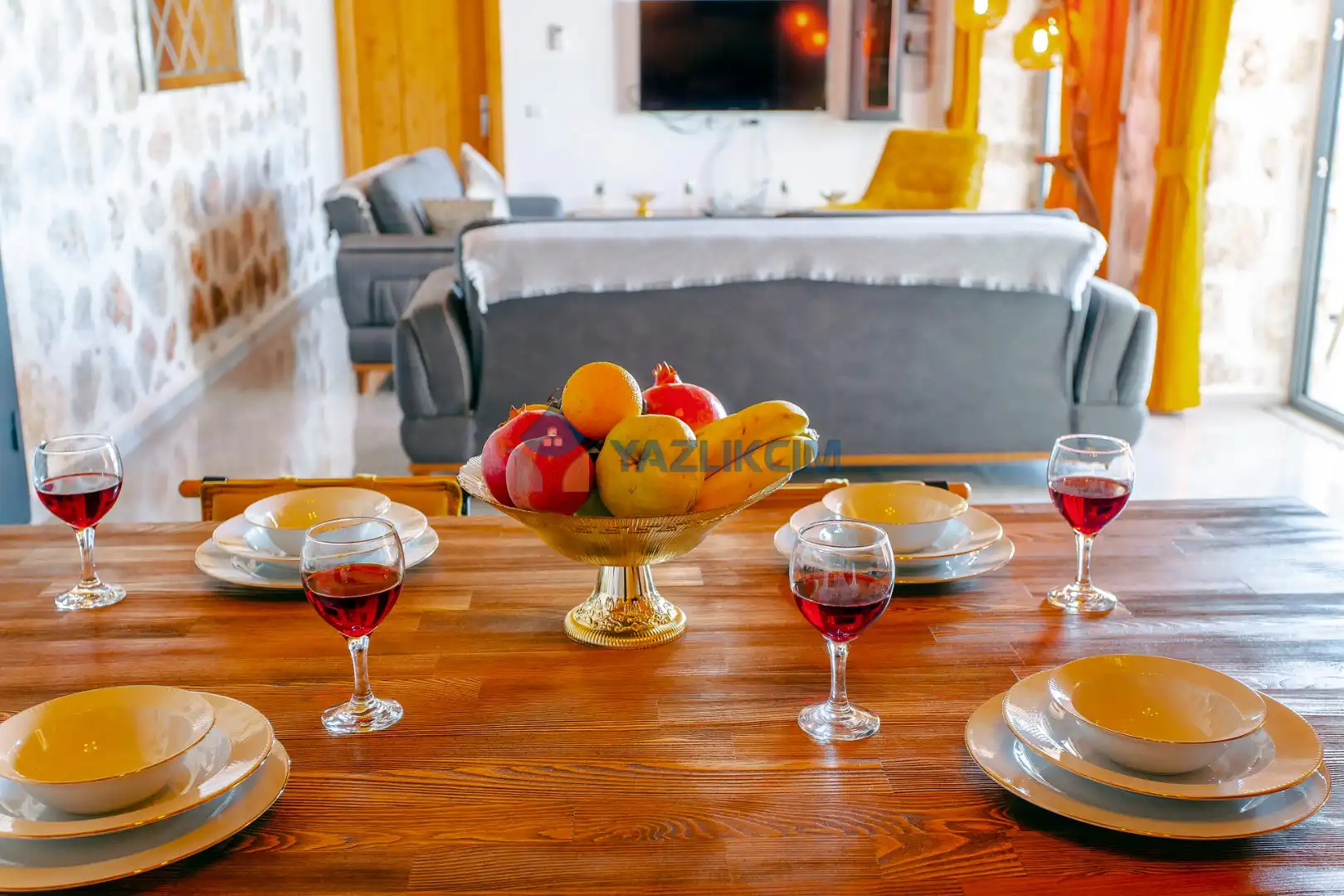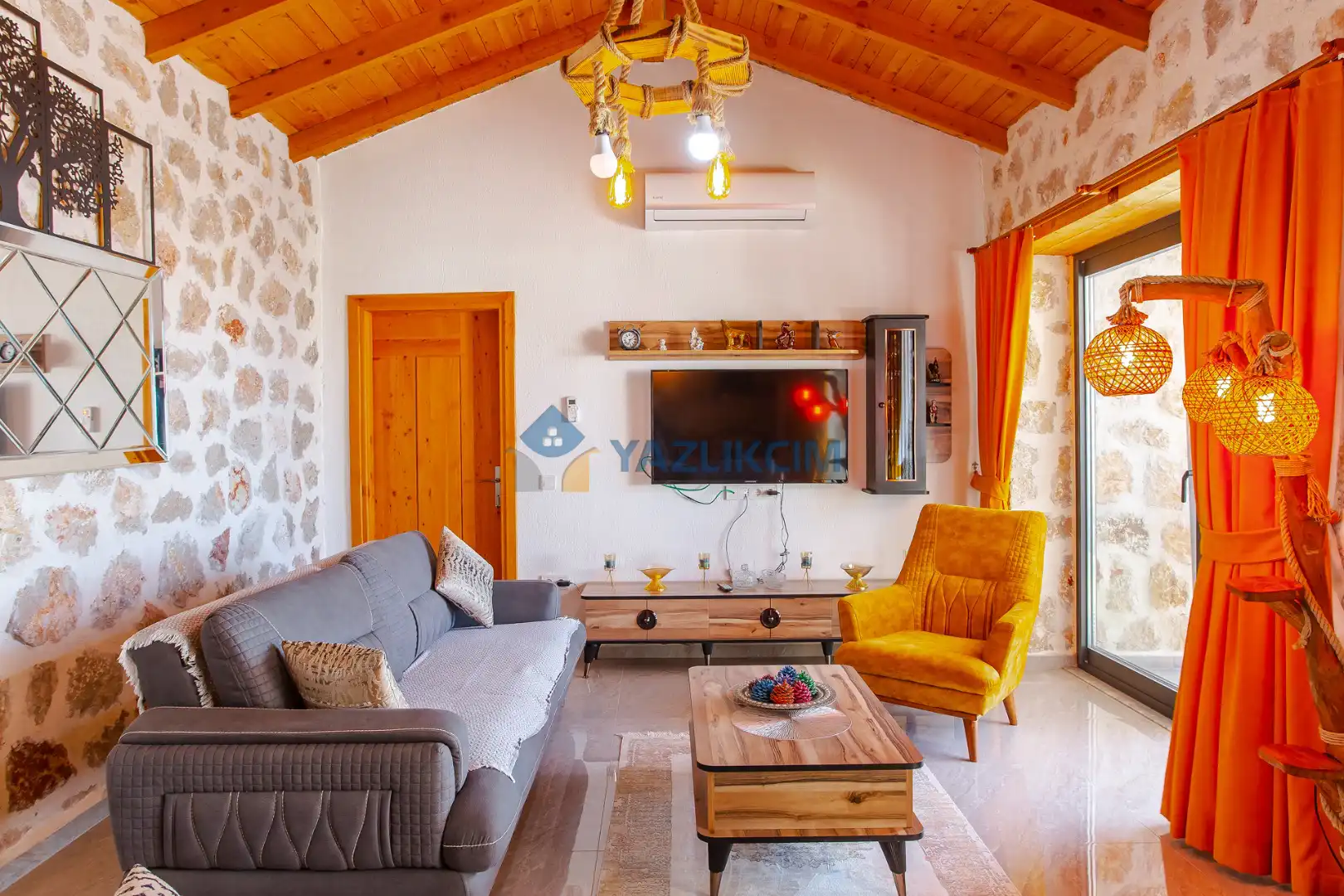 Salon Detayları: LCD TV, modern oturma grubu, yemek masası ve sandalyeler, kablosuz modem, lavabo bulunmaktadır.