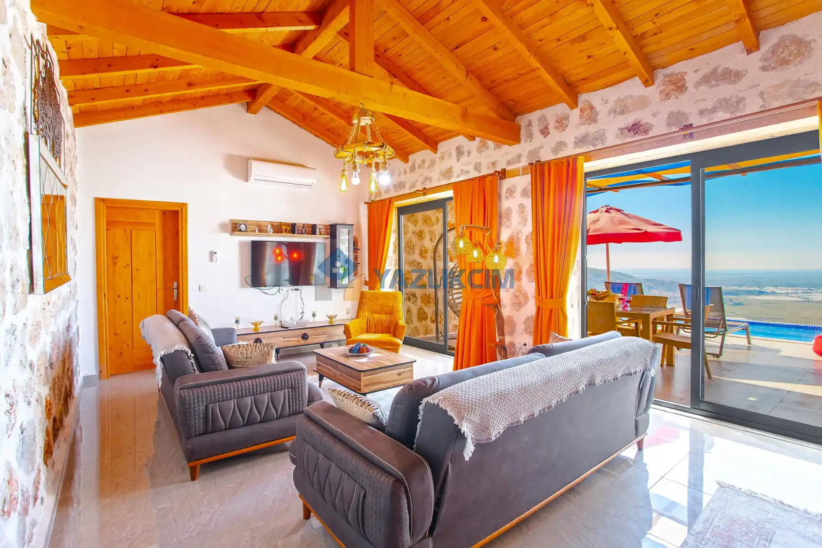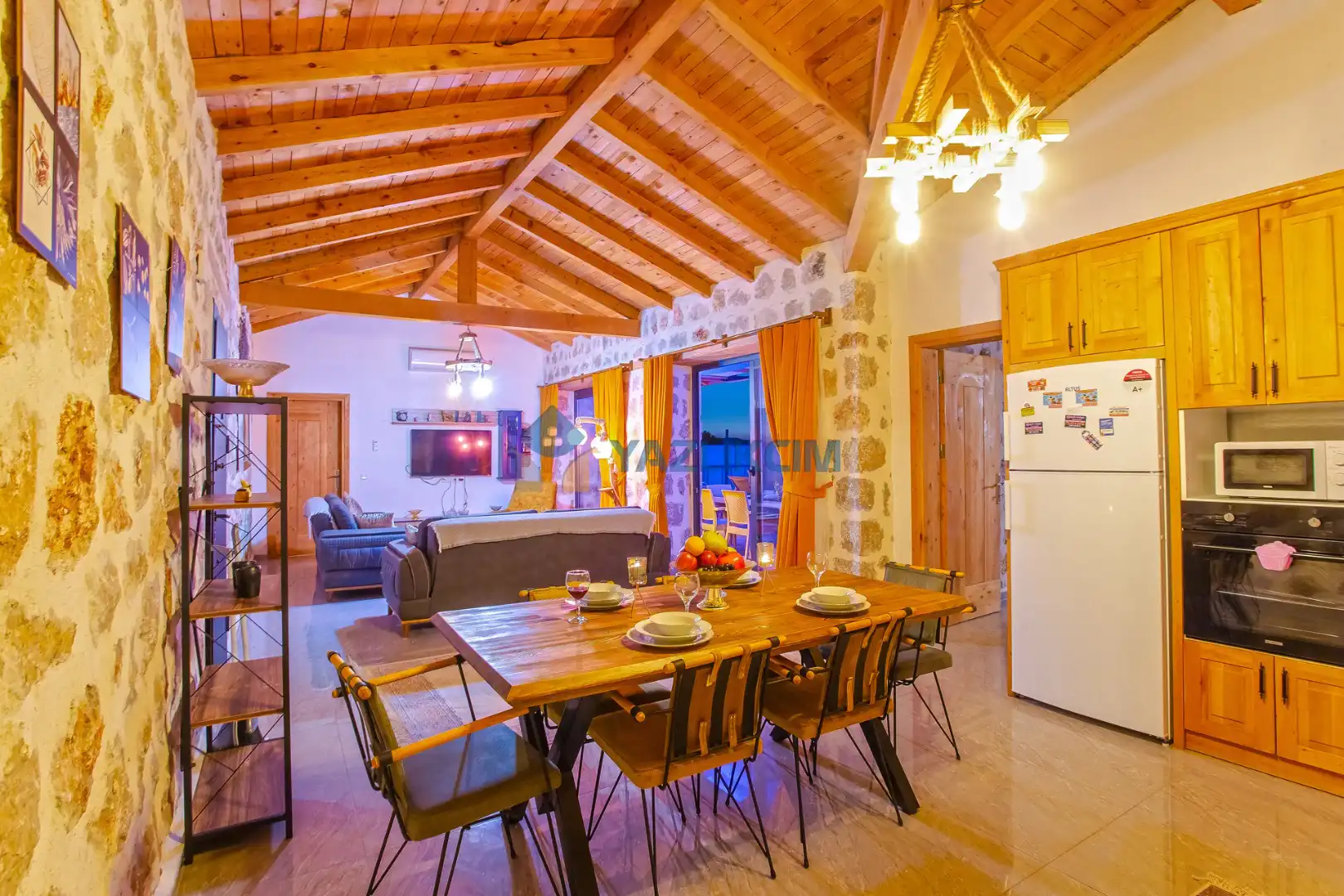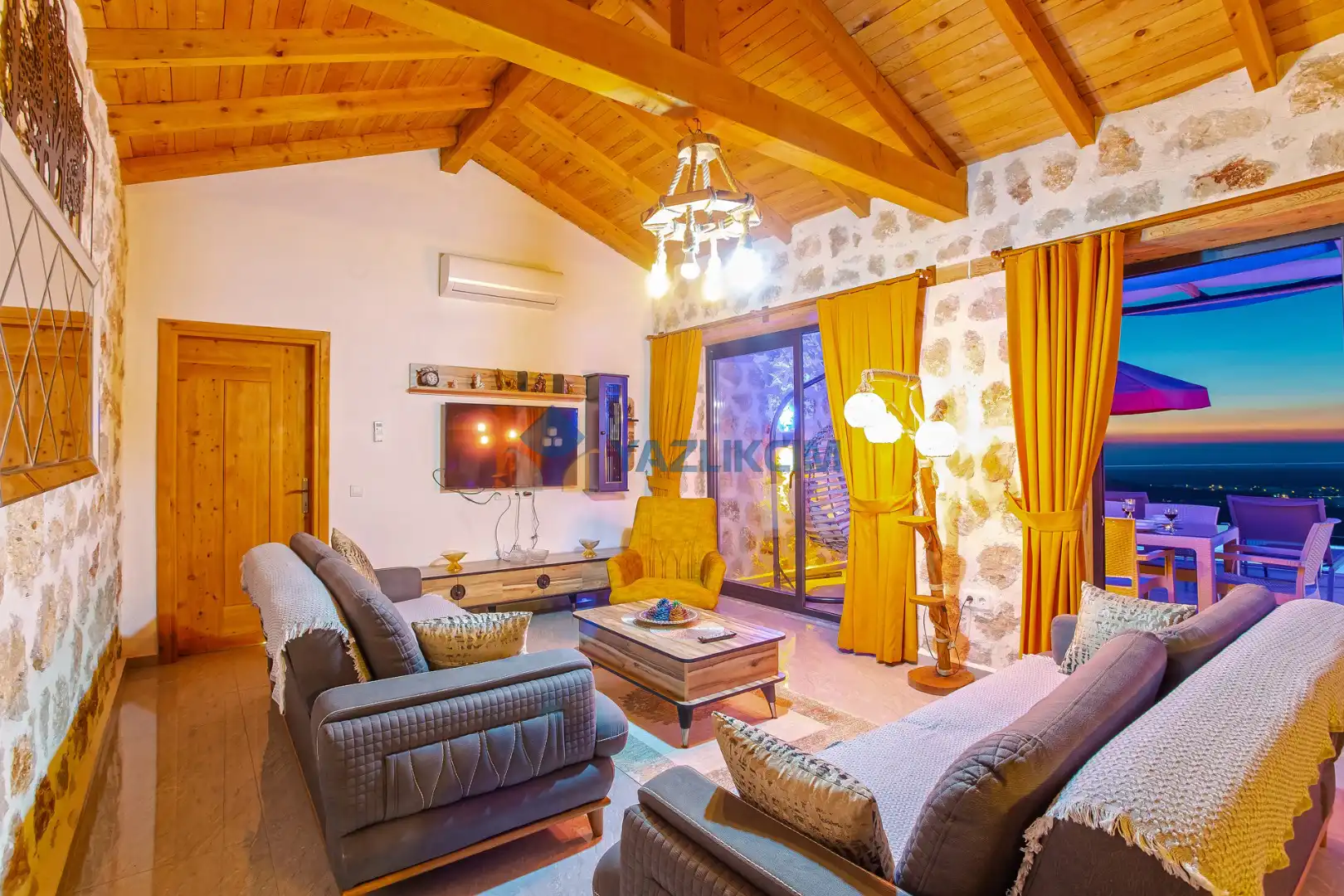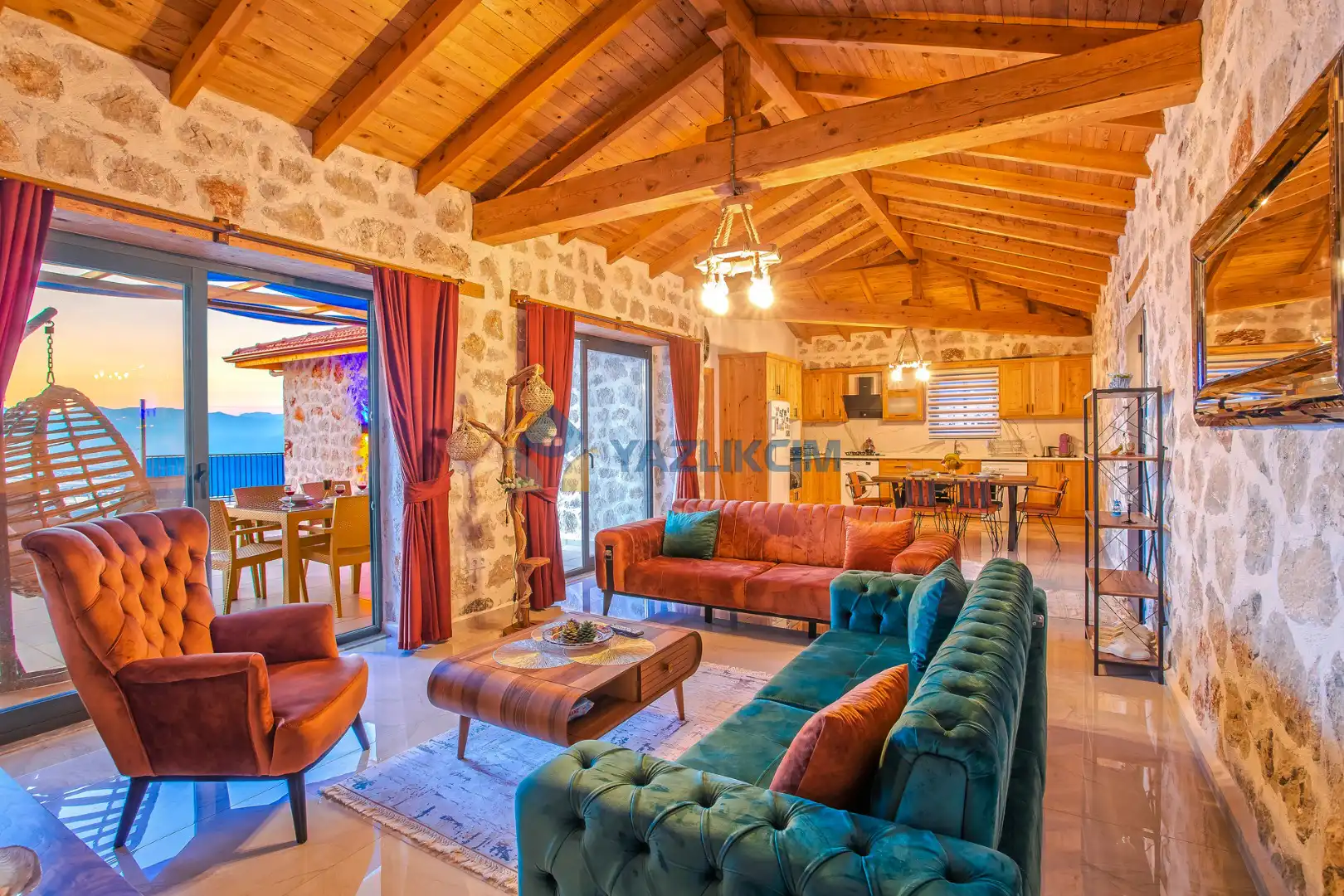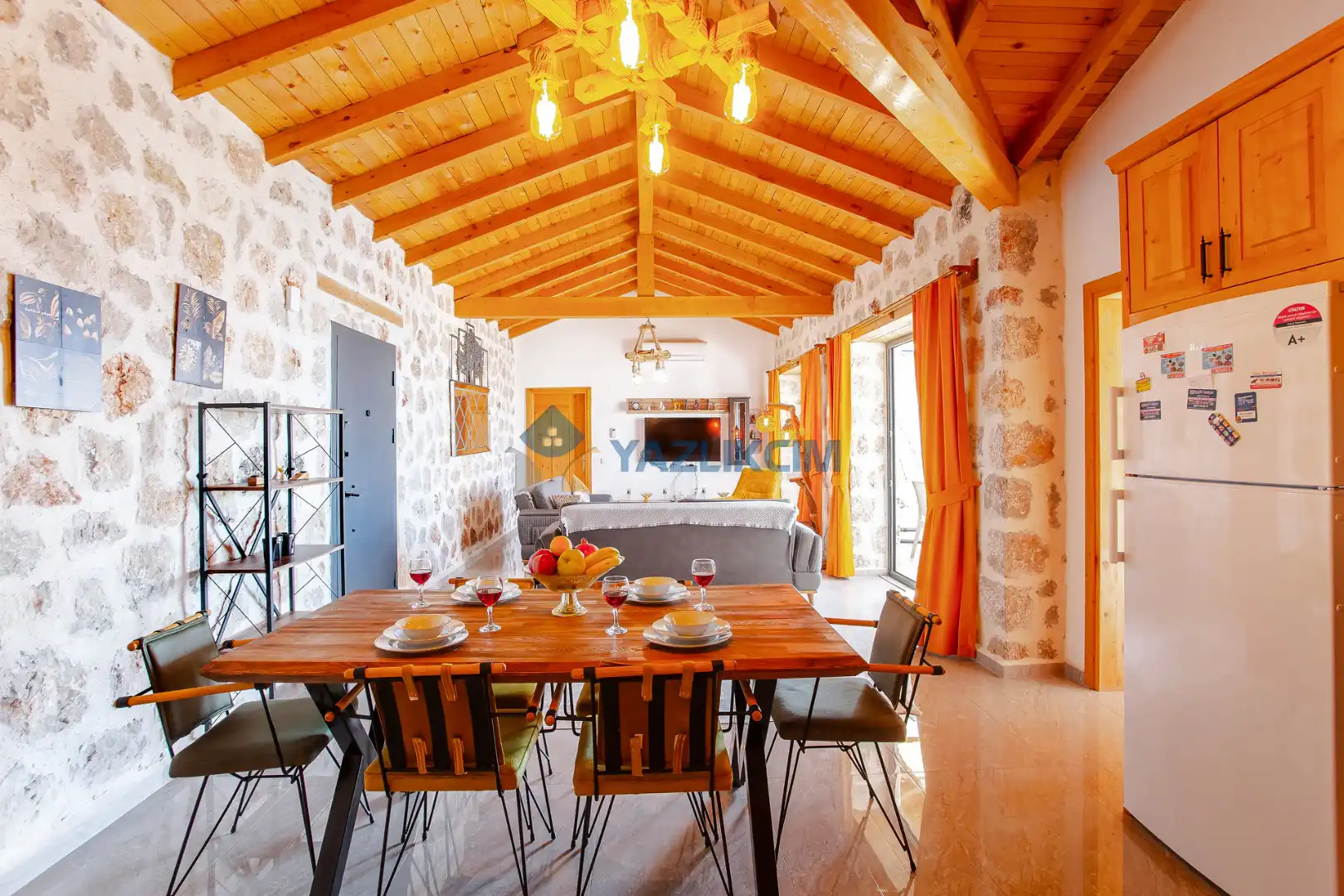 Salon Detayları: LCD TV, modern oturma grubu, yemek masası ve sandalyeler, kablosuz modem, lavabo bulunmaktadır.