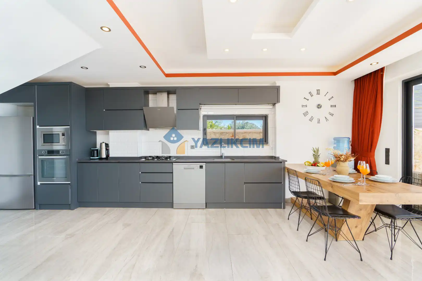 Mutfak Detayları : Modern Amerikan mutfak, buzdolabı, bulaşık makinası, fırın, 4'lü ocak, mikrodalga fırın, tost makinası, kahve makinesi, çaycı, yemek masası, yemek takımları, çatal ve bıçak takımları, tencere ve tava takımları, bardaklar bulunmaktadır.