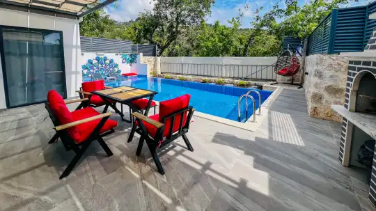 Detayları: Şezlong, güneşlenme şemsiyesi, barbekü, yemek masası ve sandalyeleri bulunmaktadır.