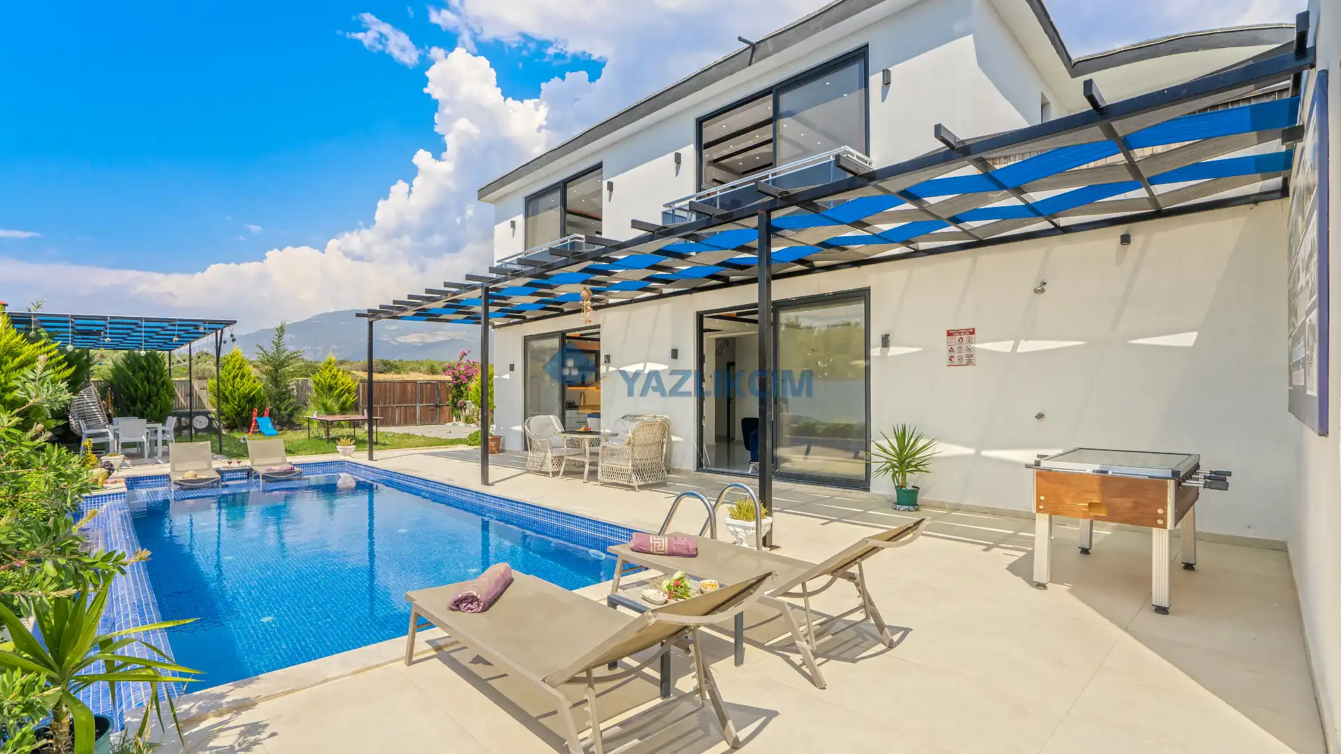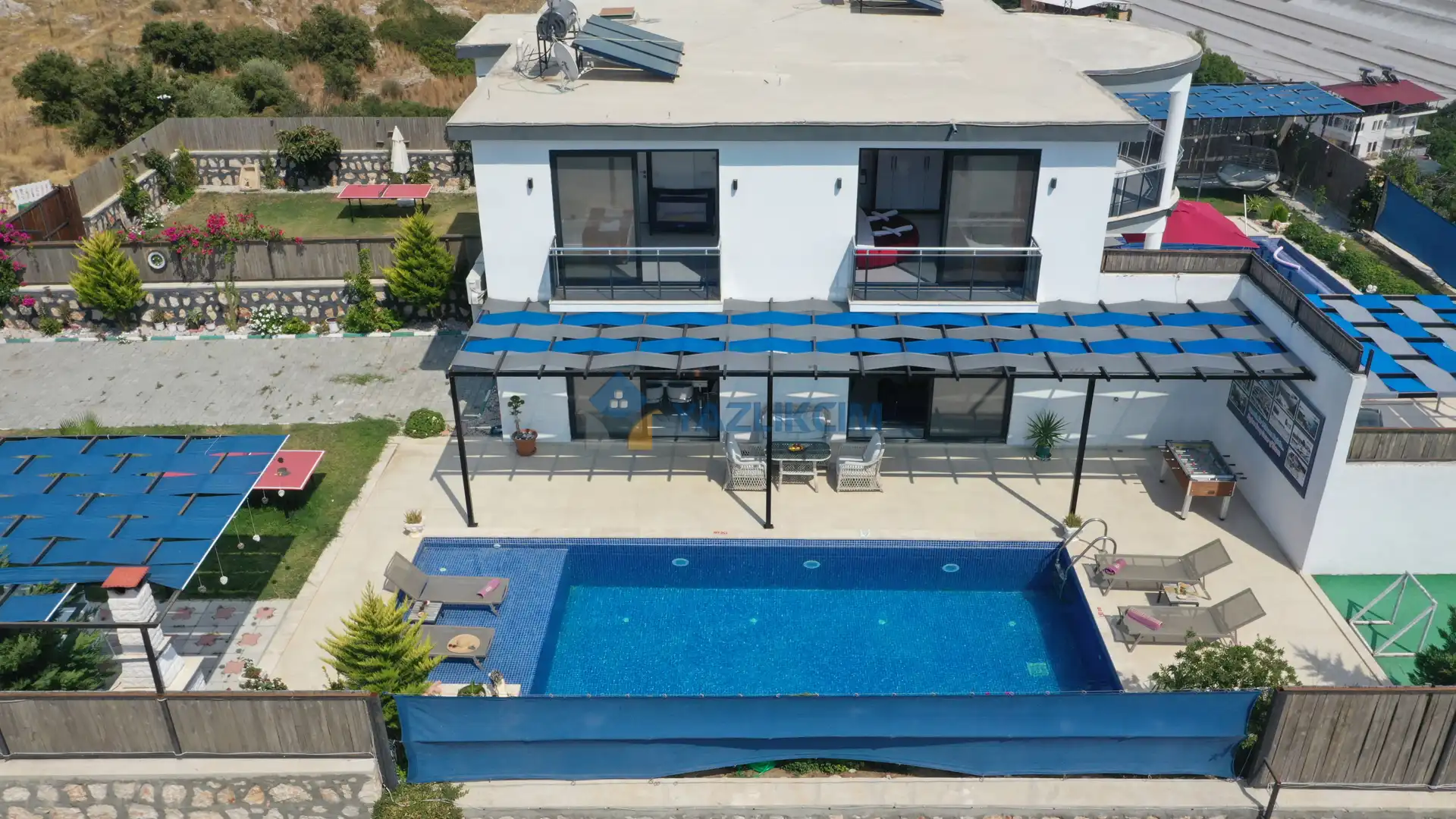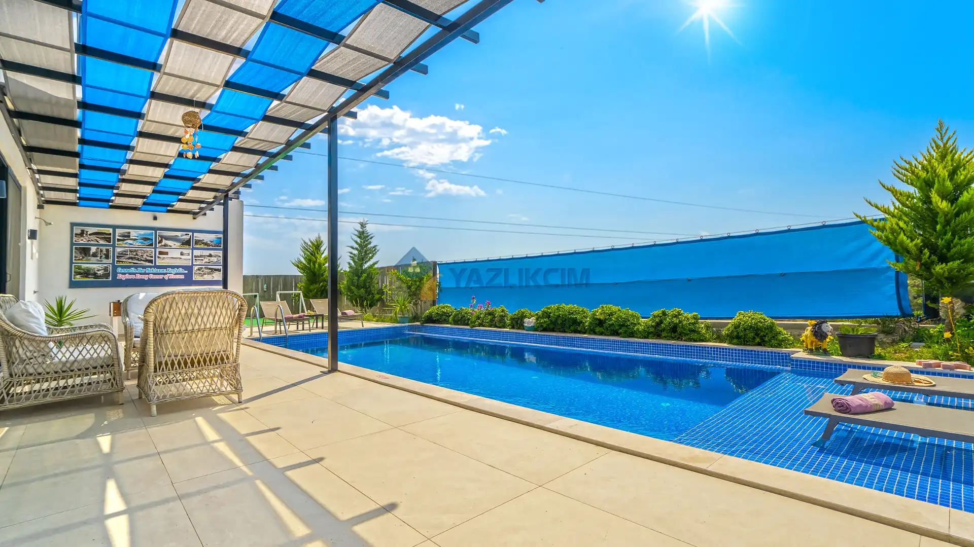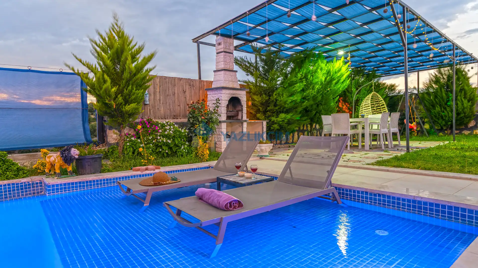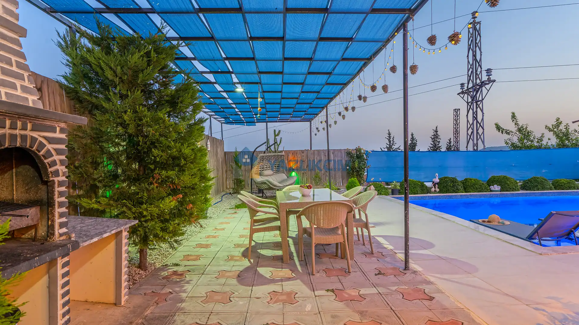 Detayları : Şezlonglar, barbekü, yemek masası, salıncak, oturma grubu bulunmaktadır.