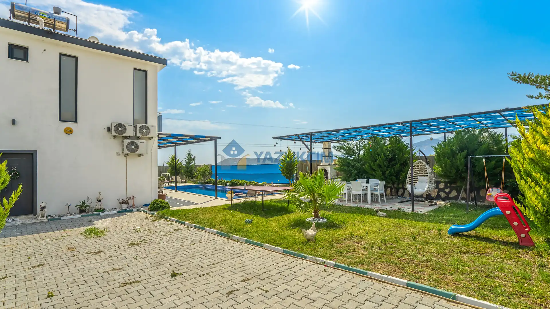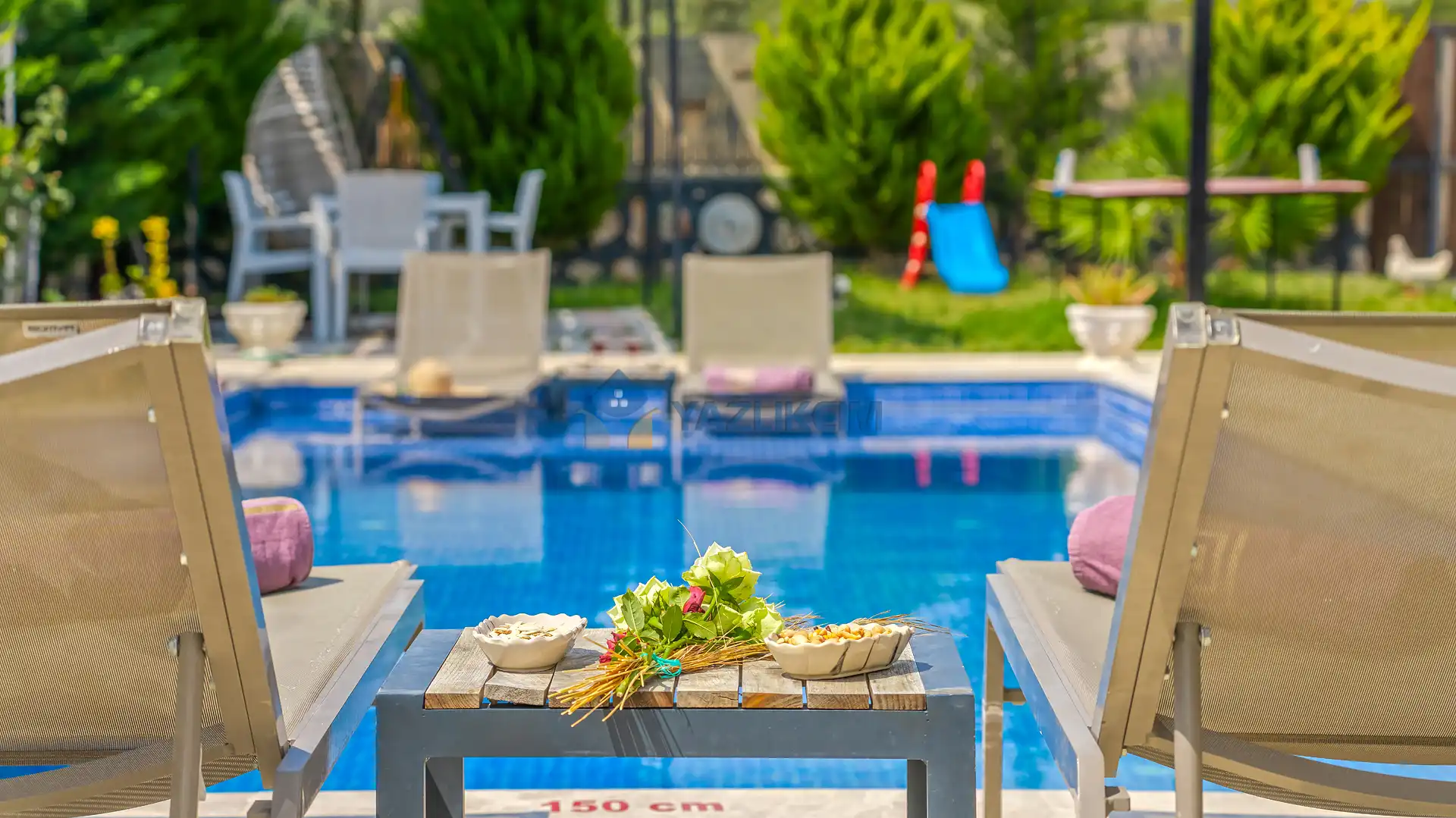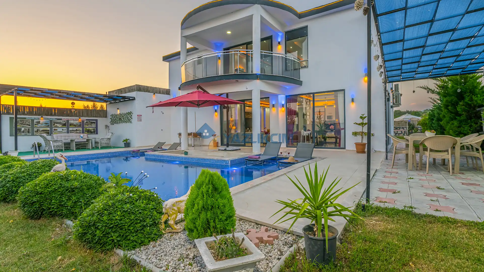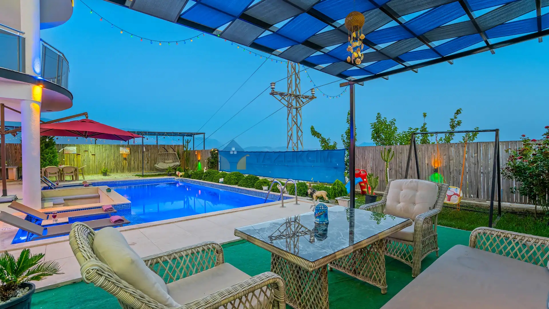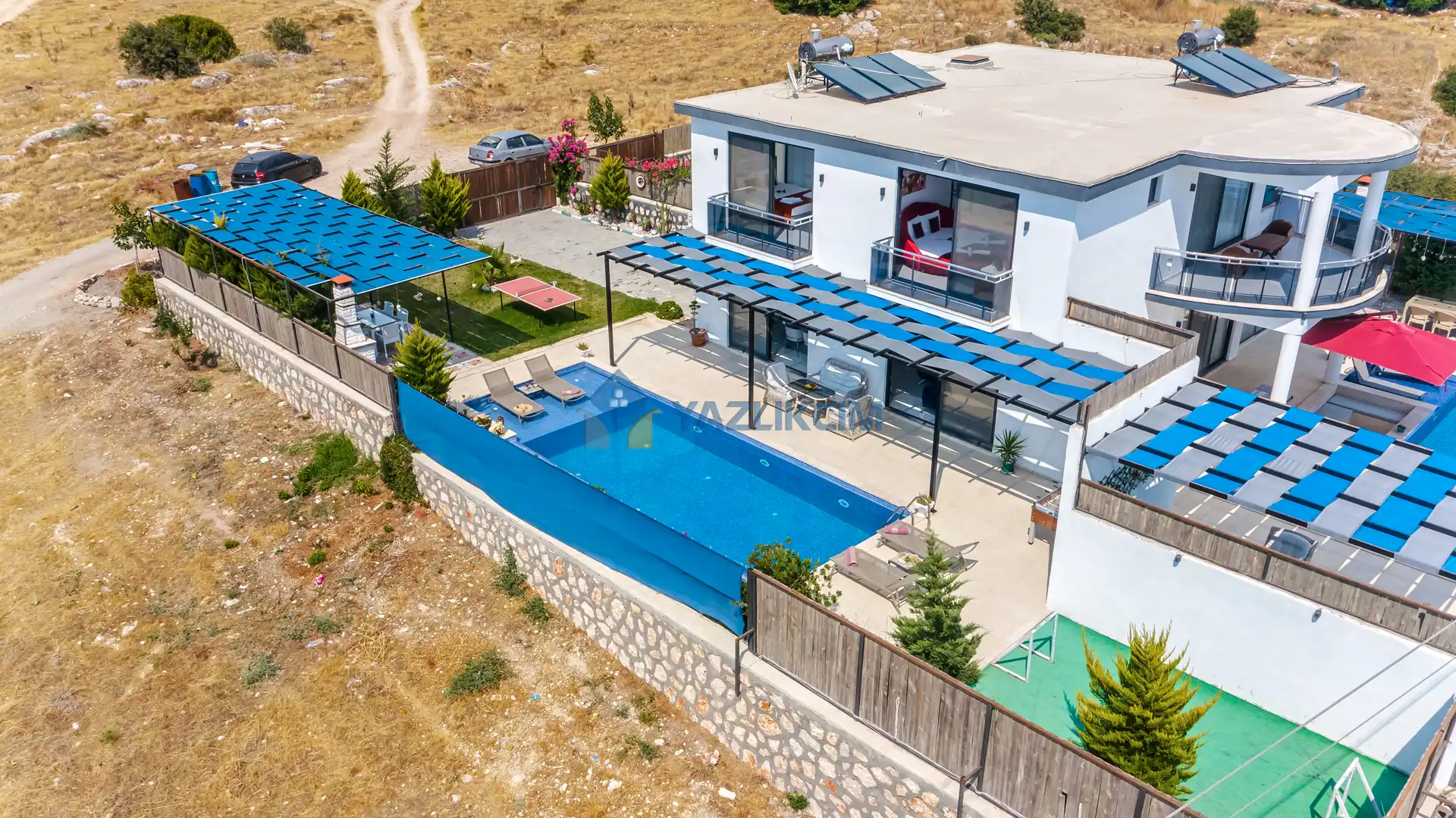 Detayları : Şezlonglar, barbekü, yemek masası, salıncak, oturma grubu bulunmaktadır.