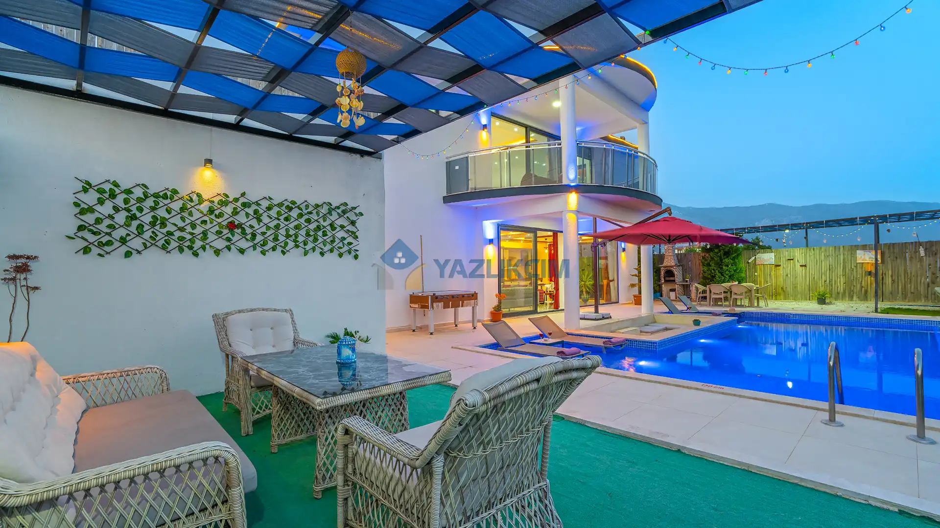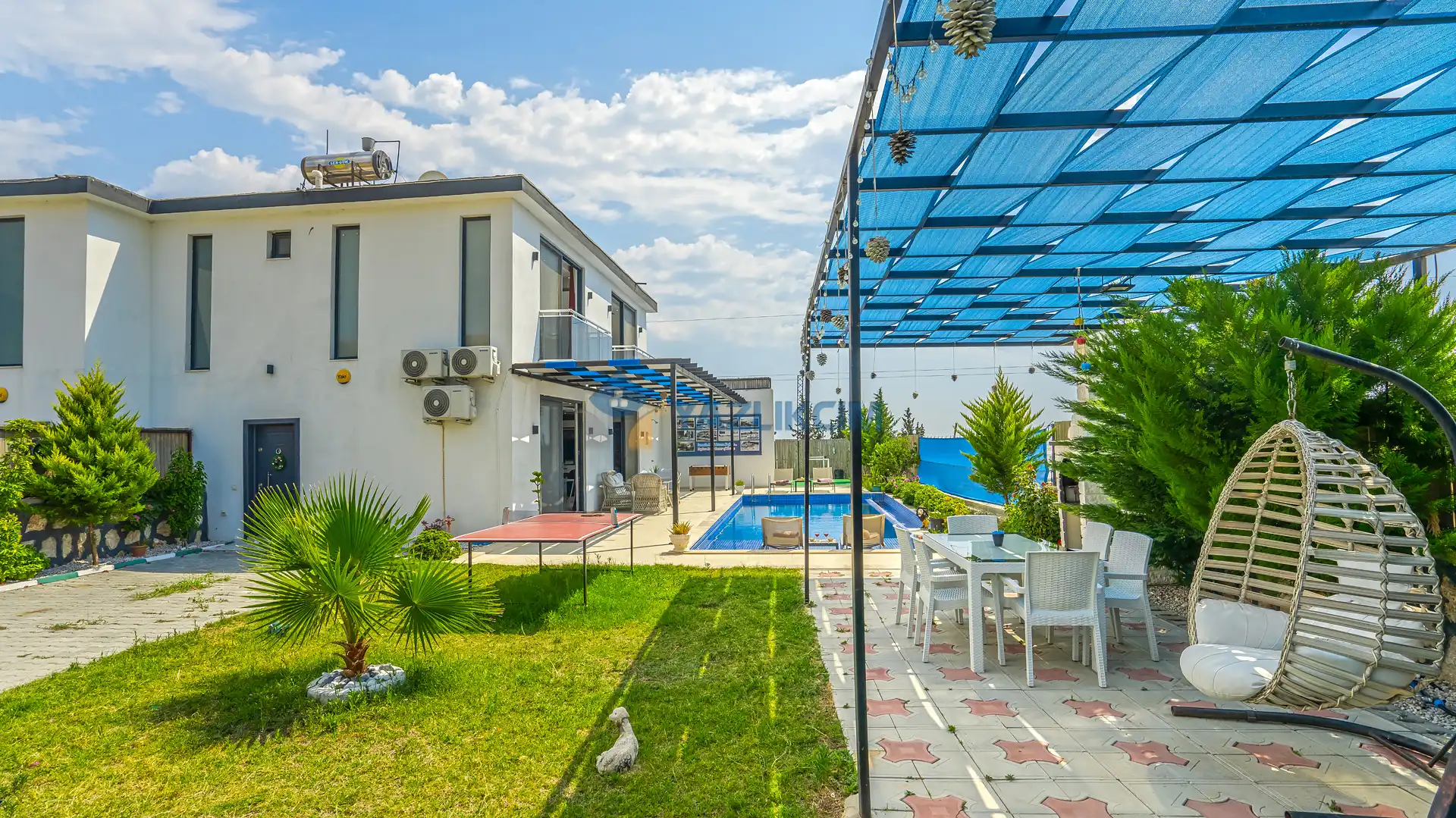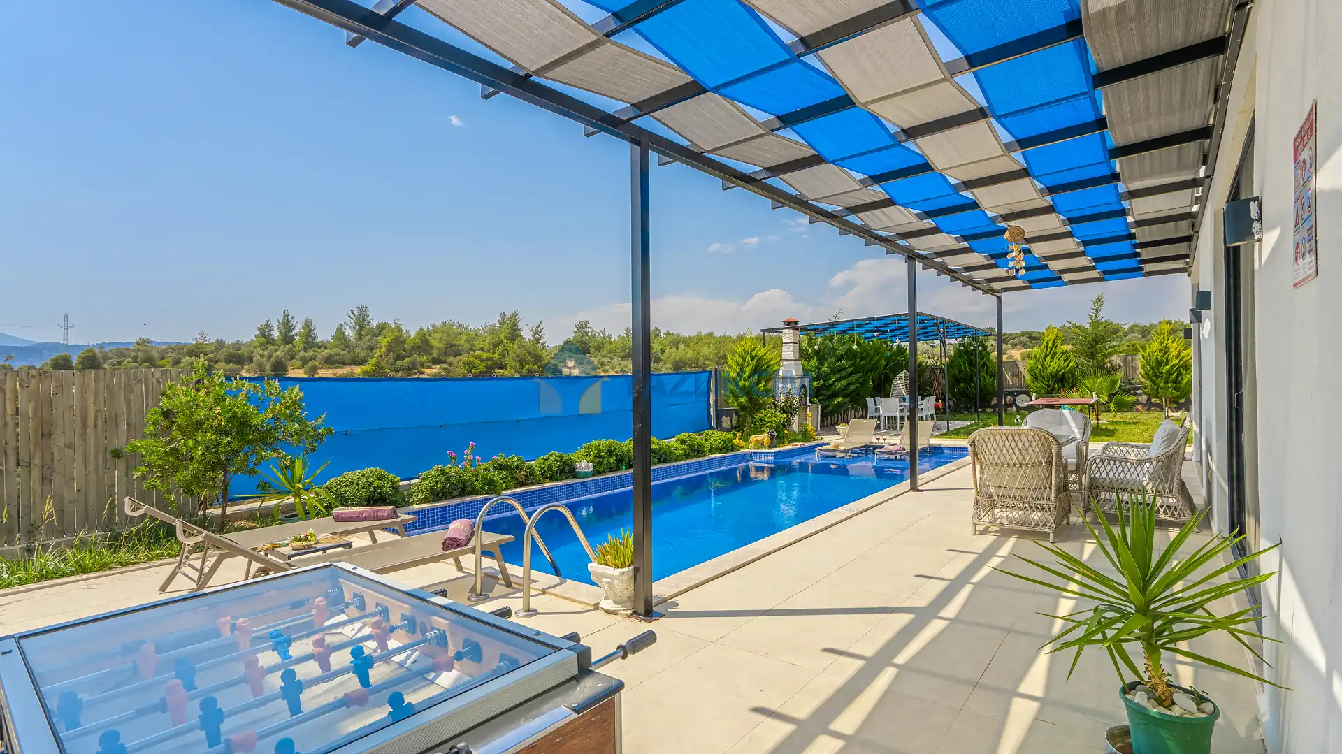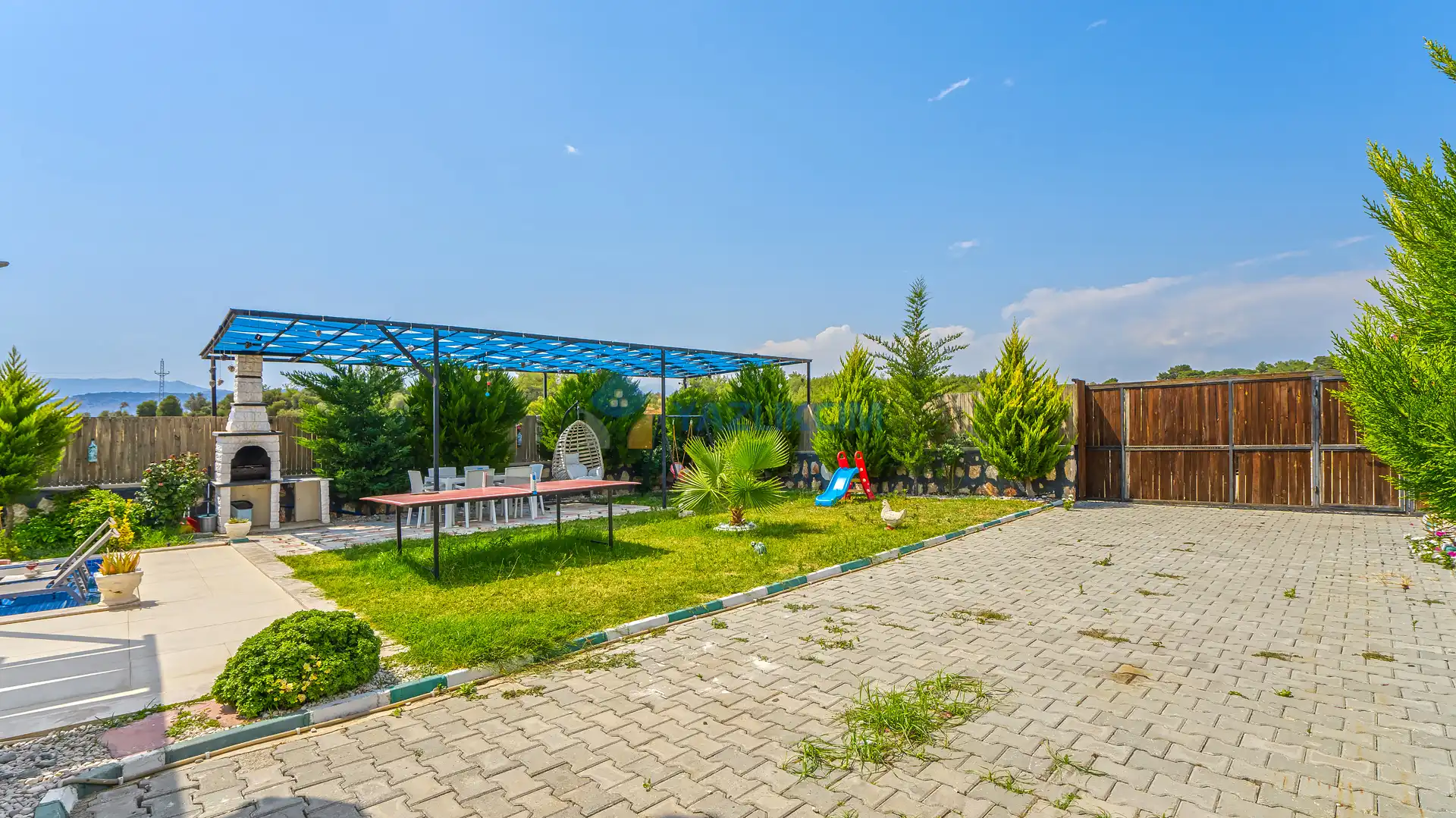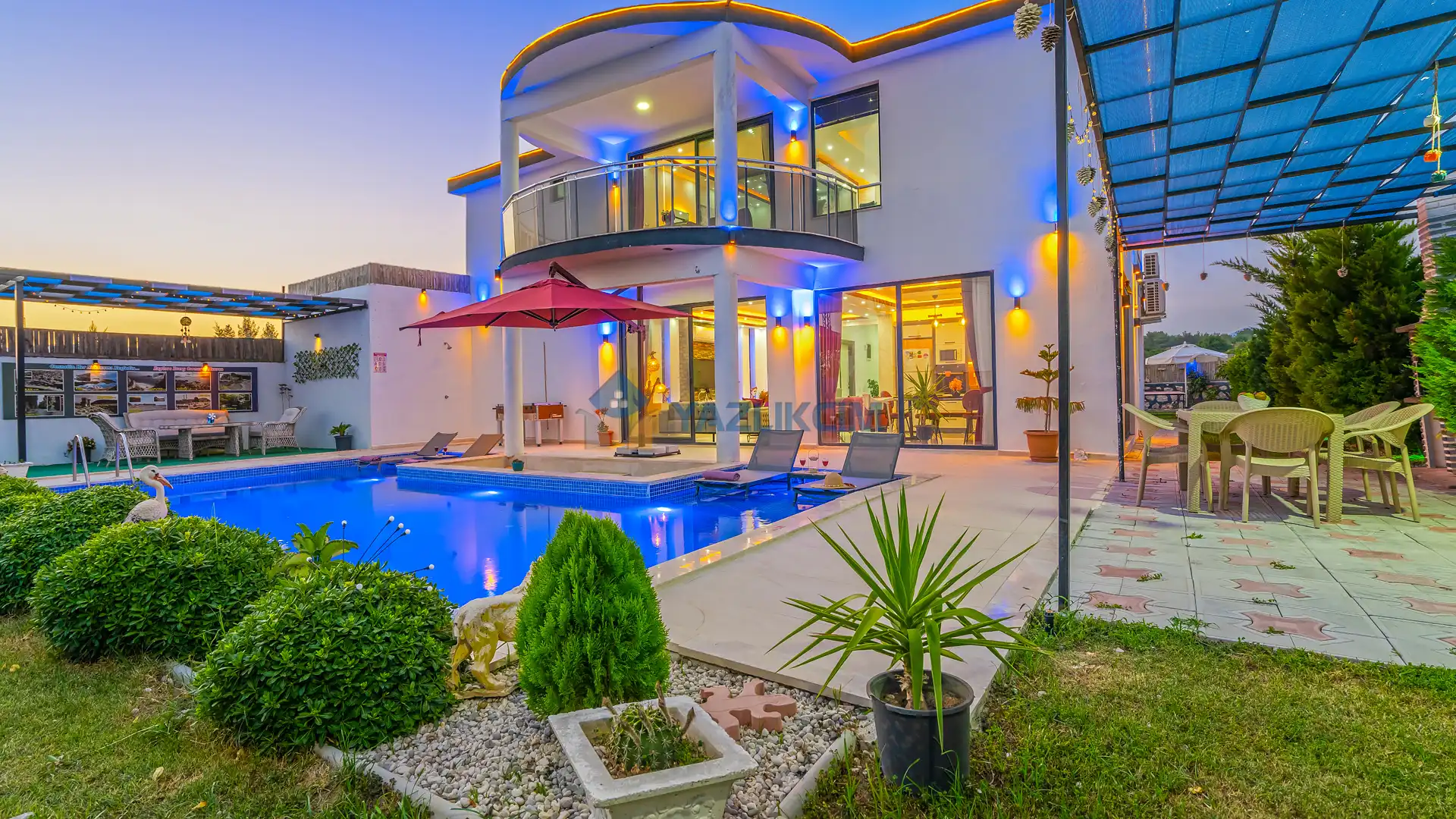 Detayları : Şezlonglar, barbekü, yemek masası, salıncak, oturma grubu bulunmaktadır.