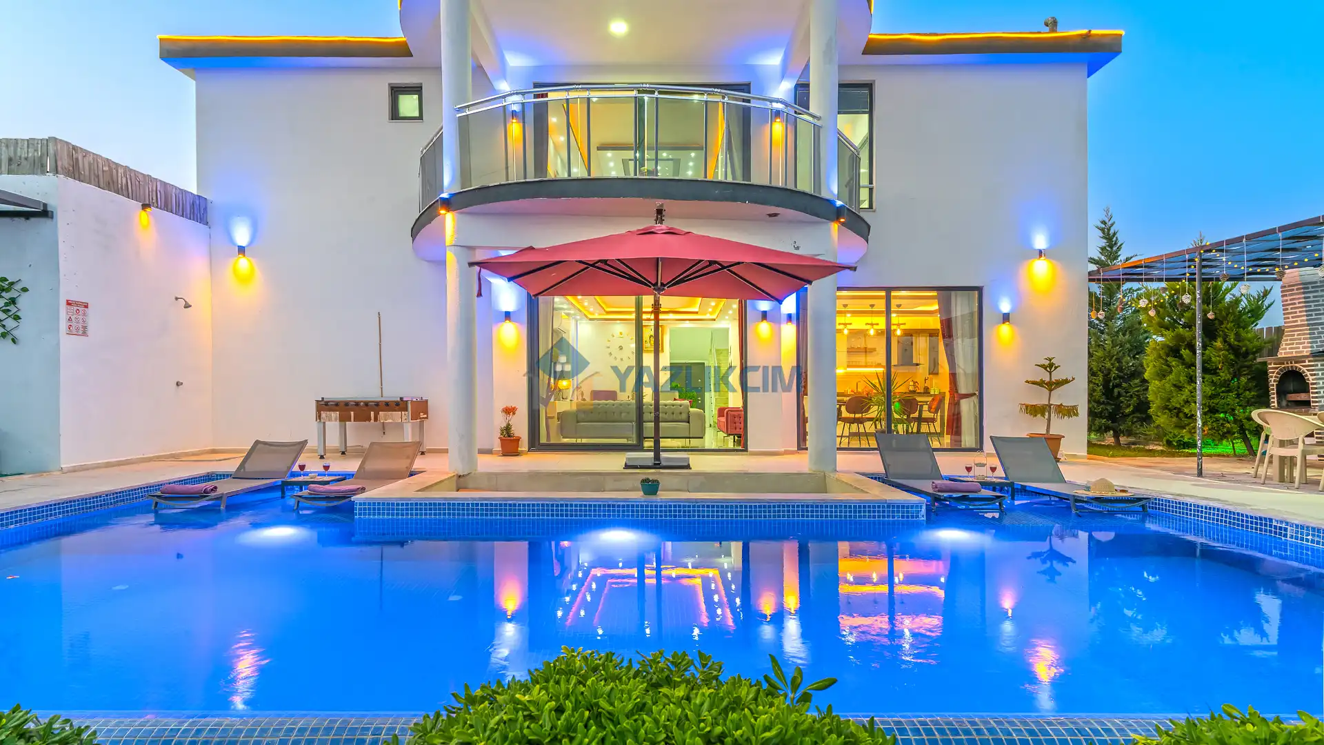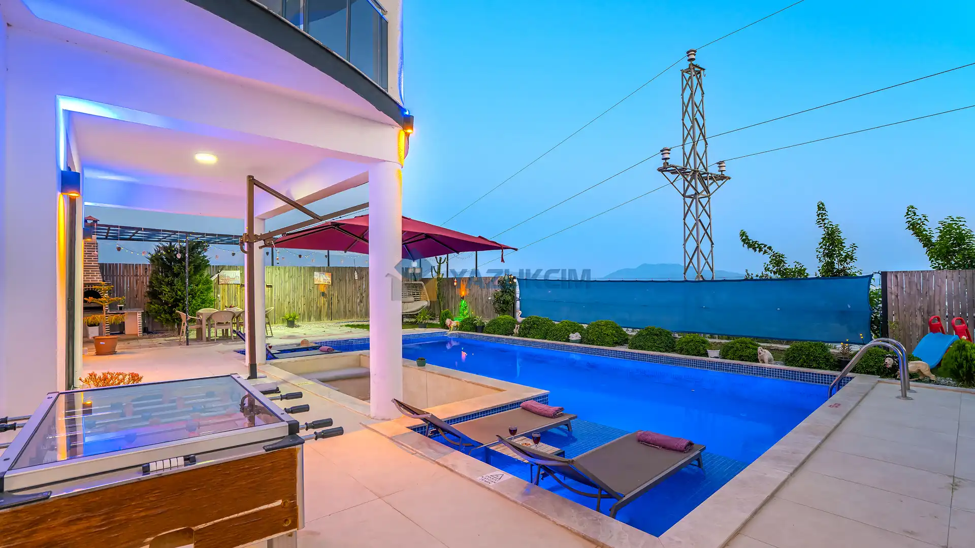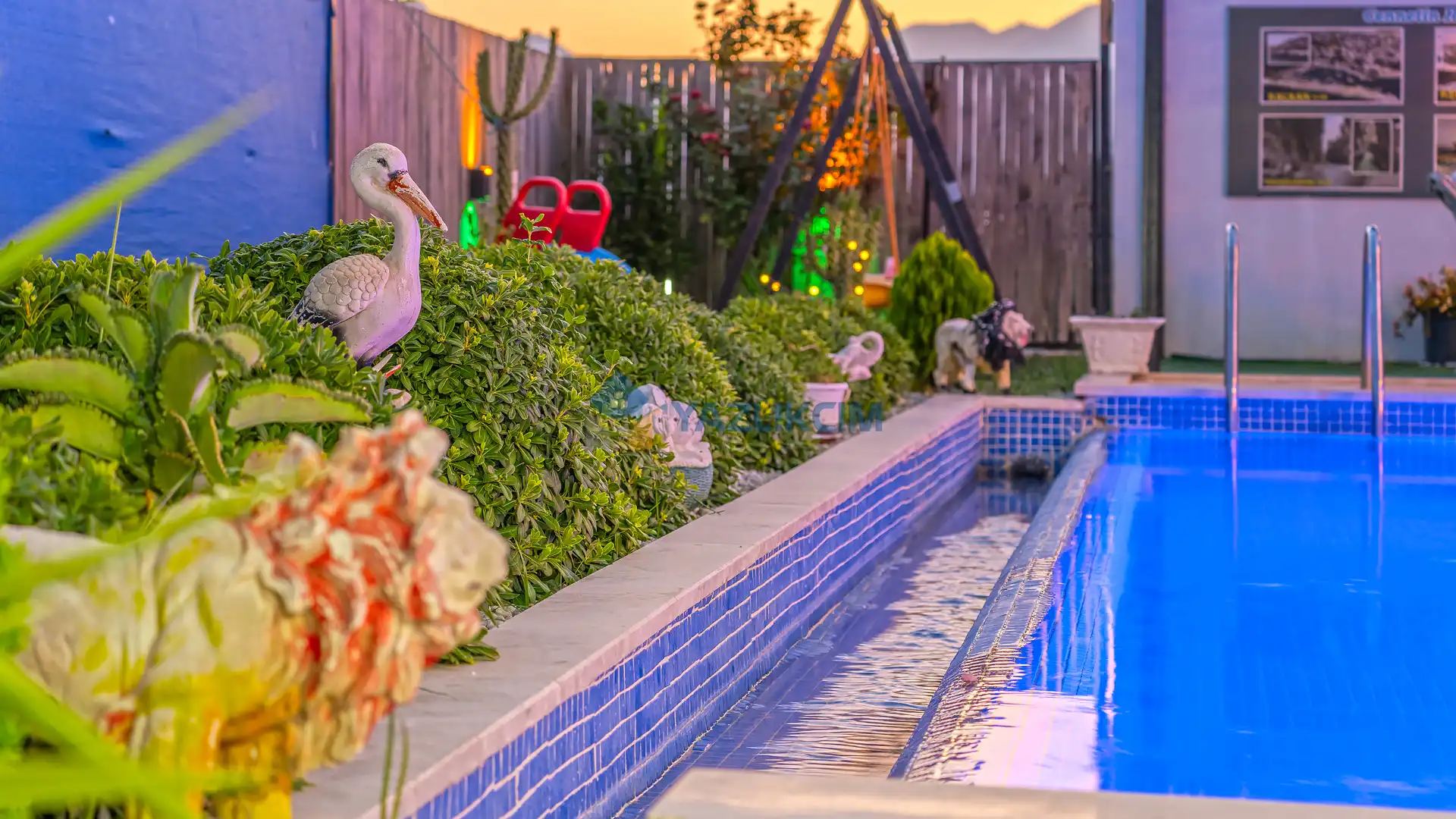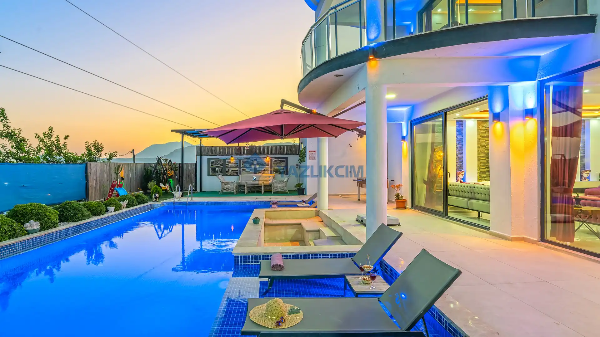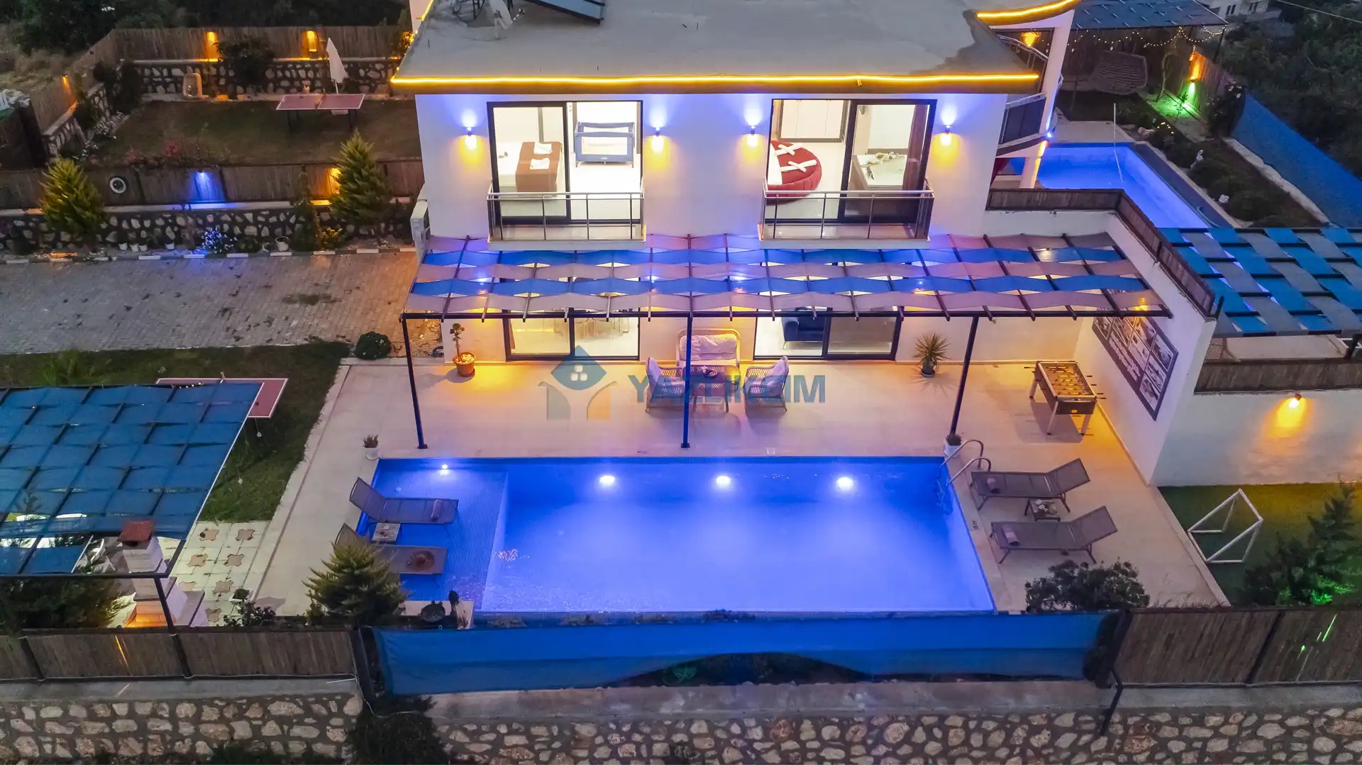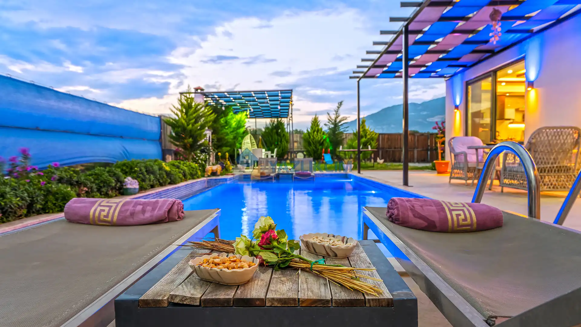 Detayları : Şezlonglar, barbekü, yemek masası, salıncak, oturma grubu bulunmaktadır.