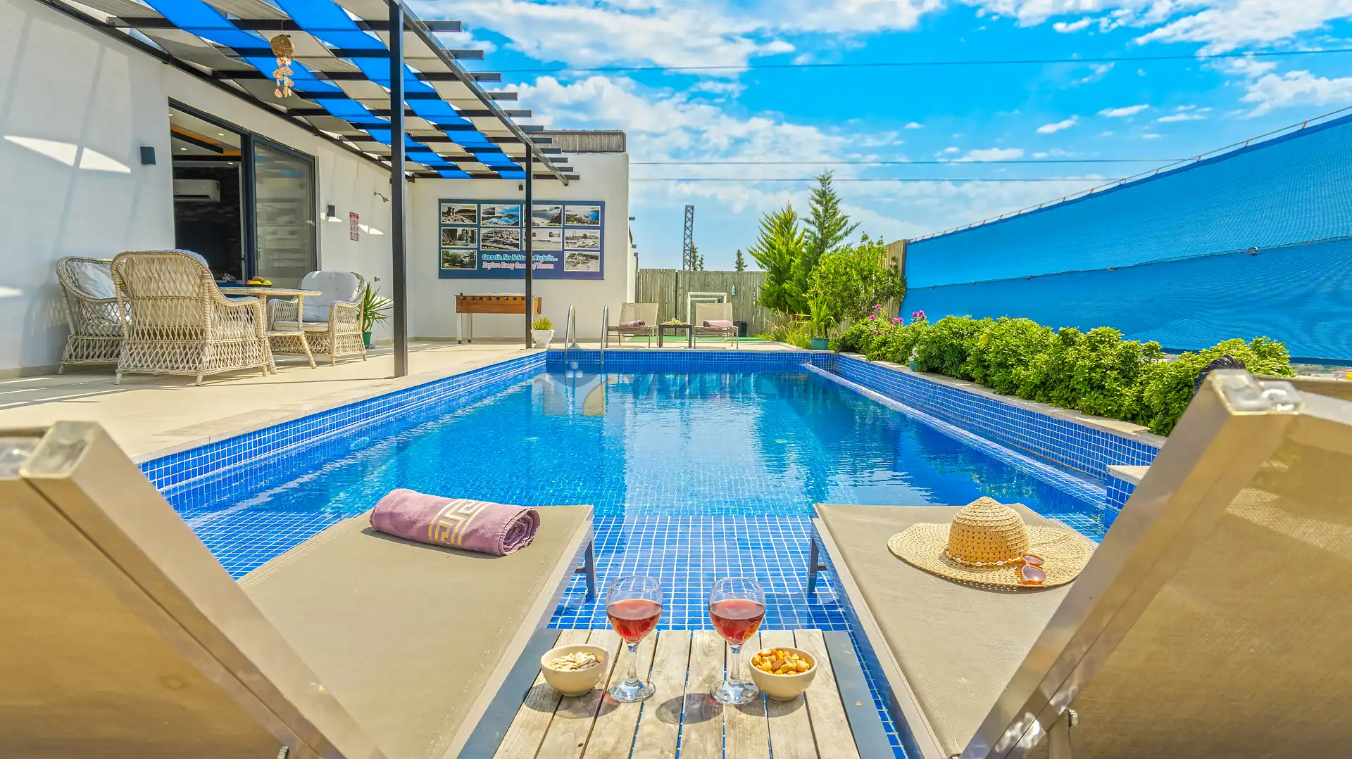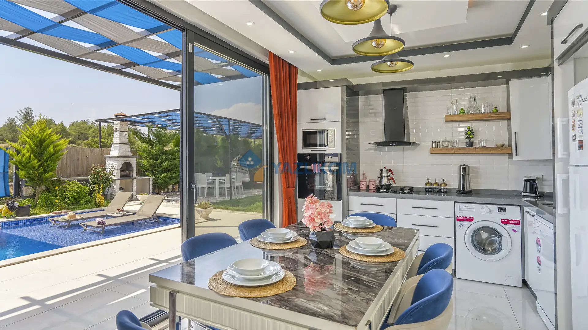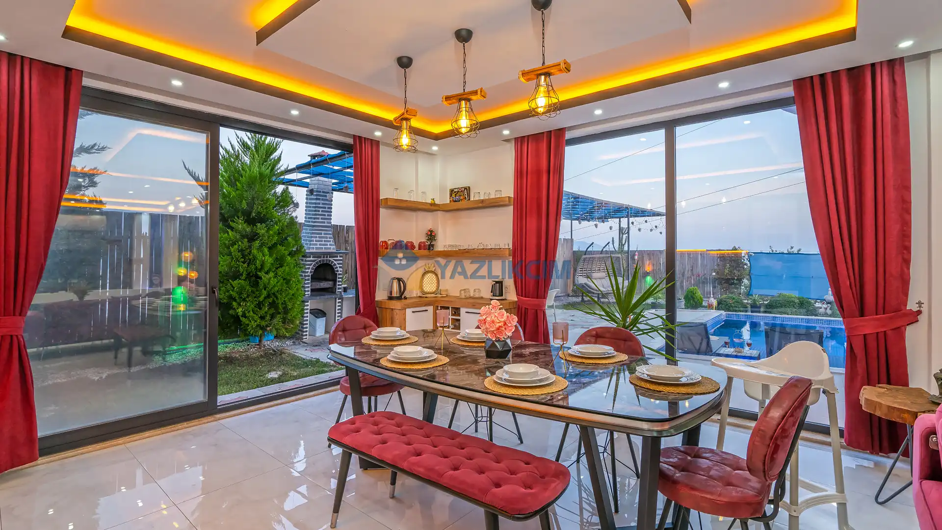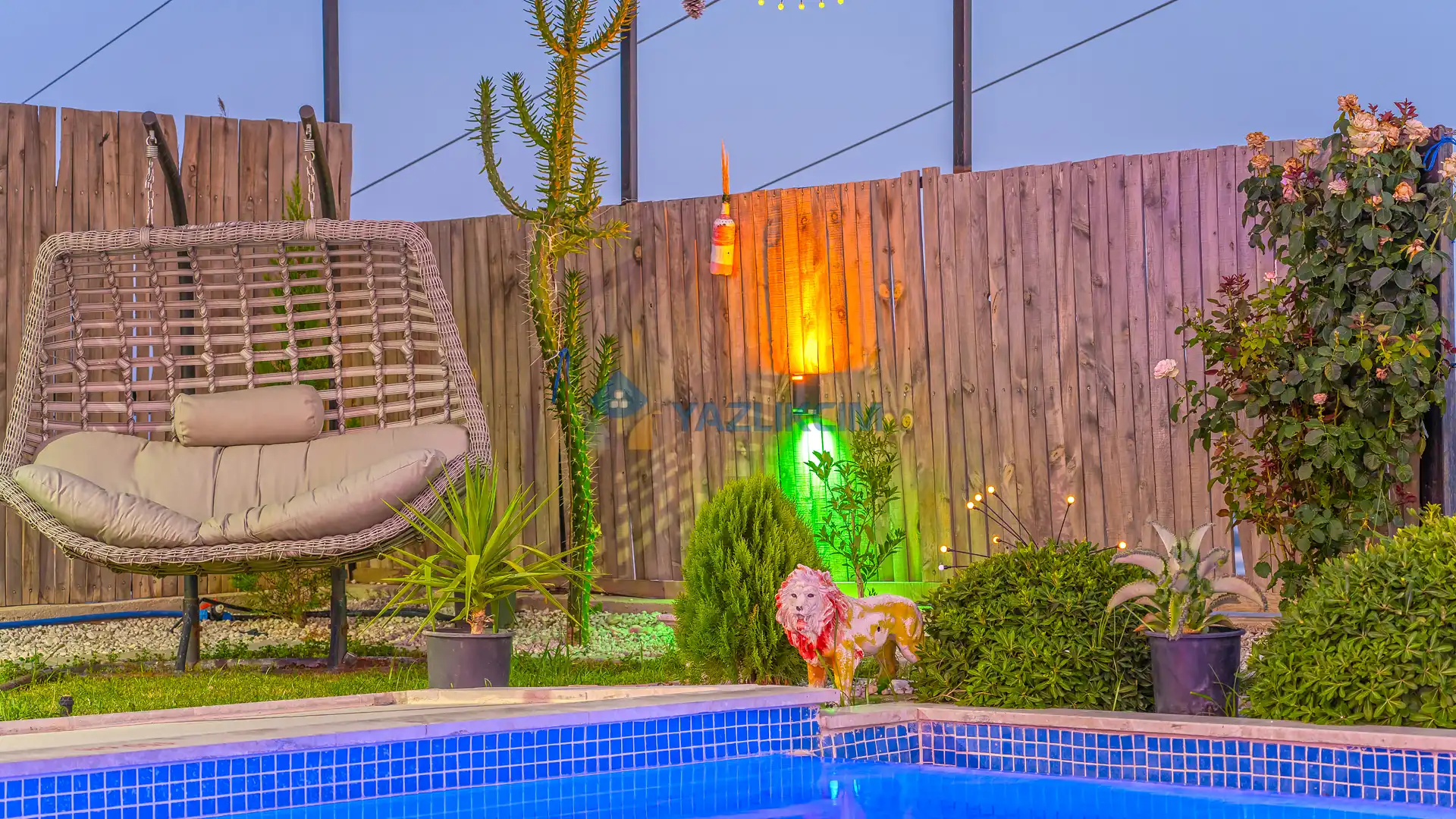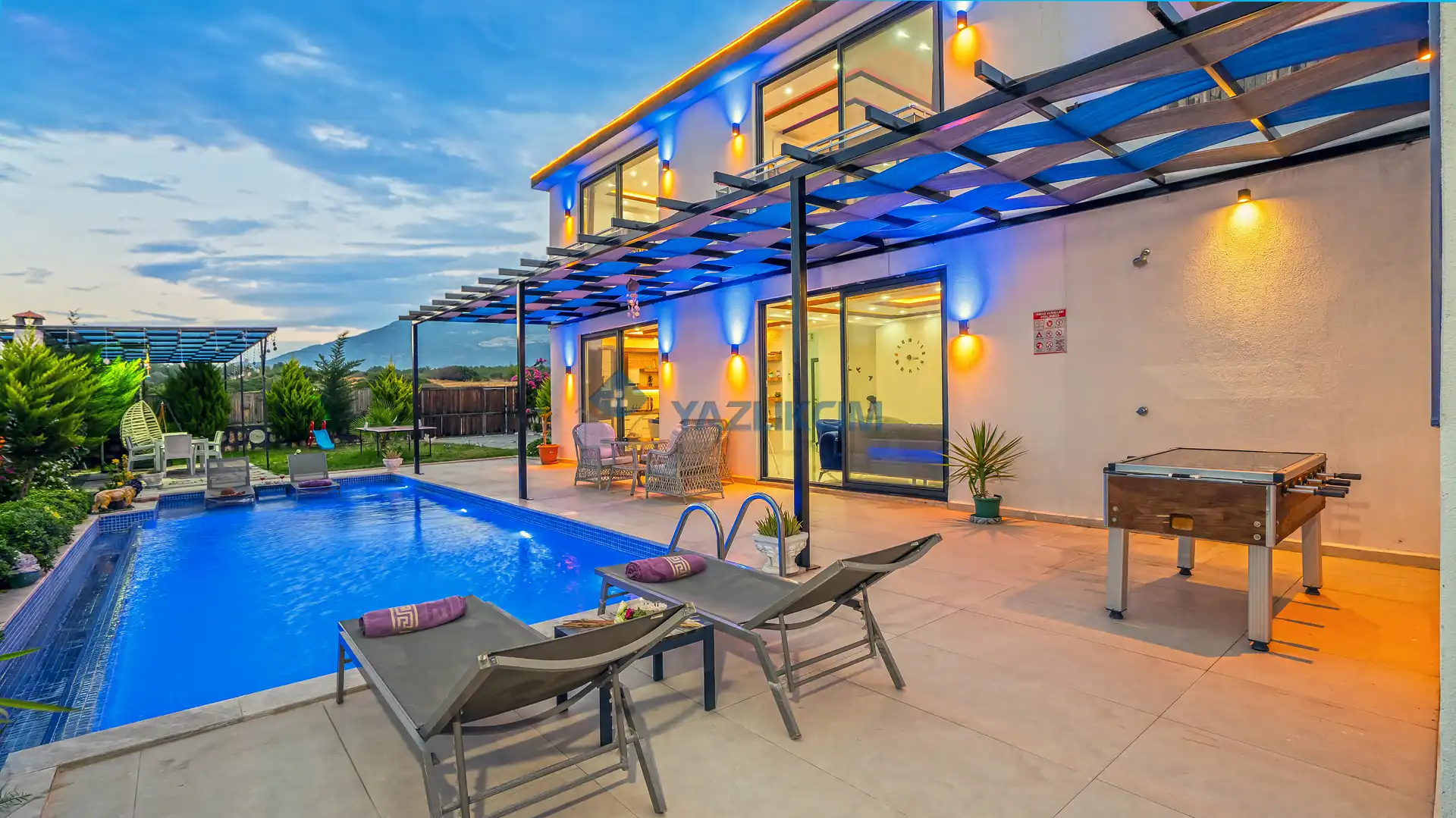 Detayları : Şezlonglar, barbekü, yemek masası, salıncak, oturma grubu bulunmaktadır.