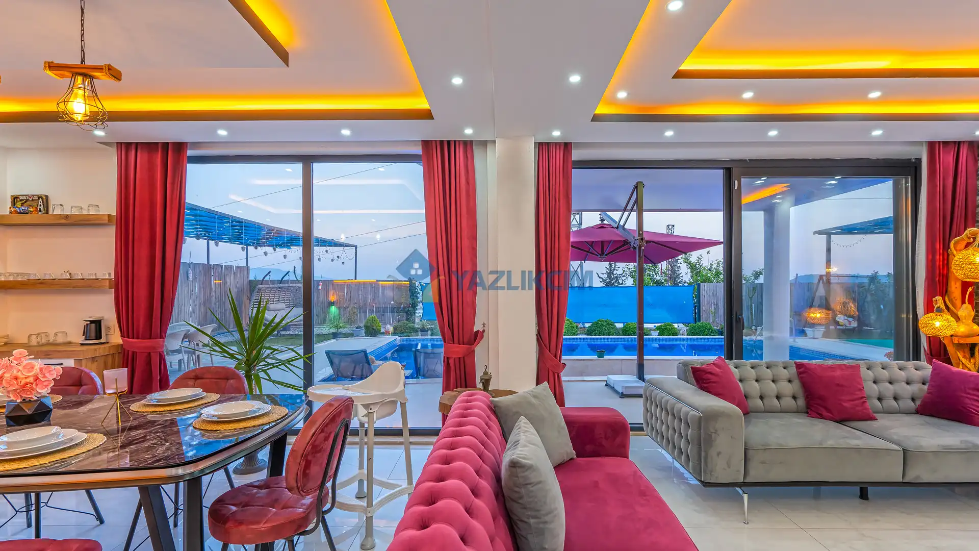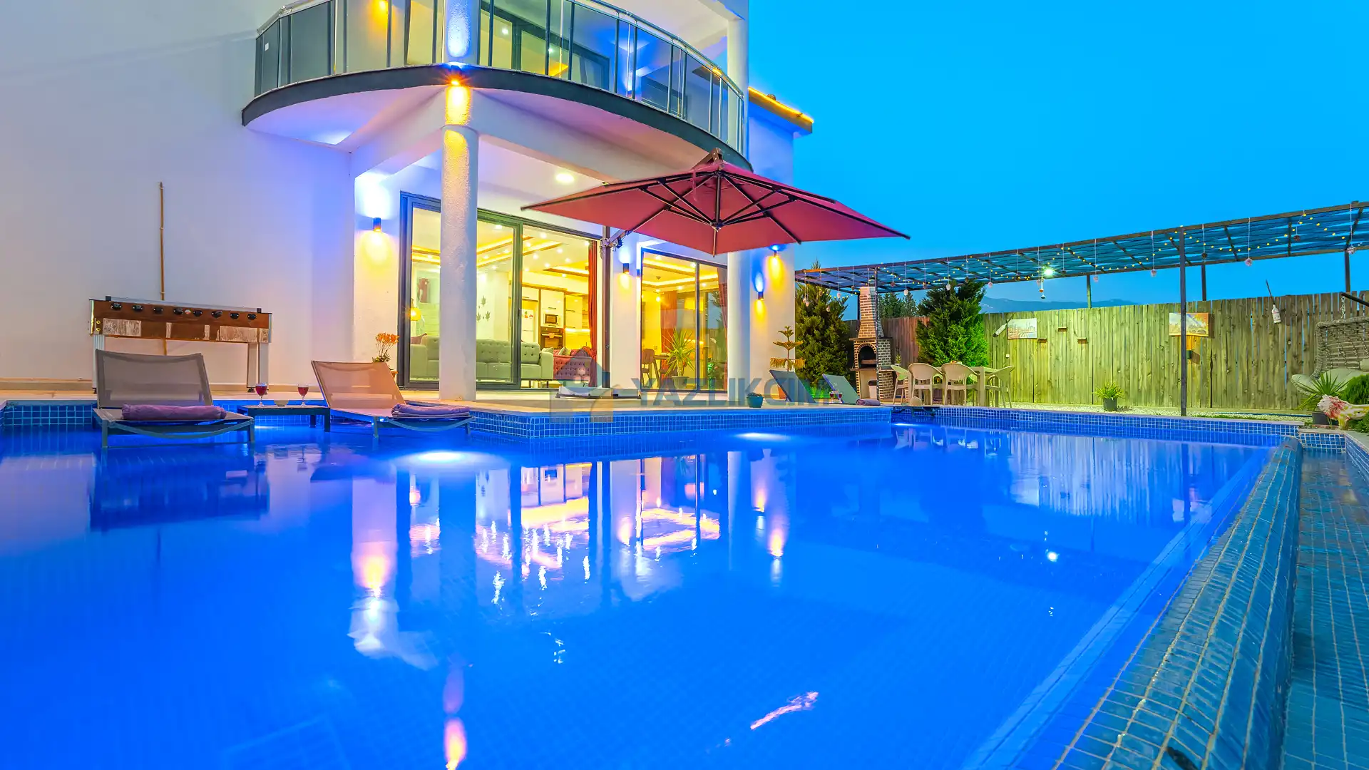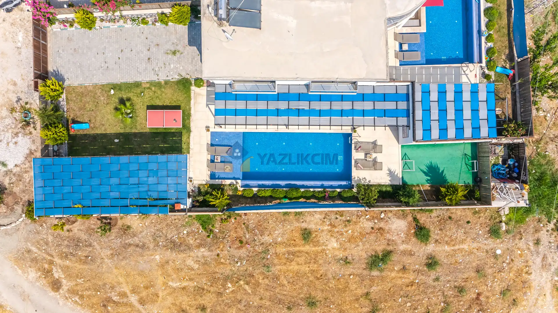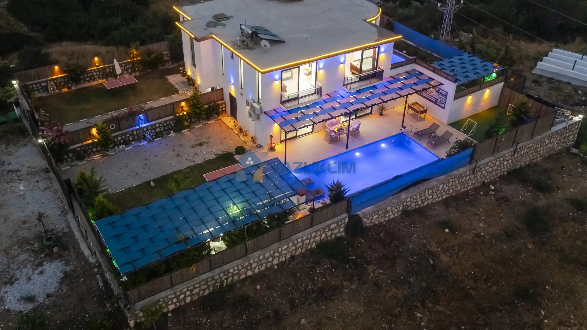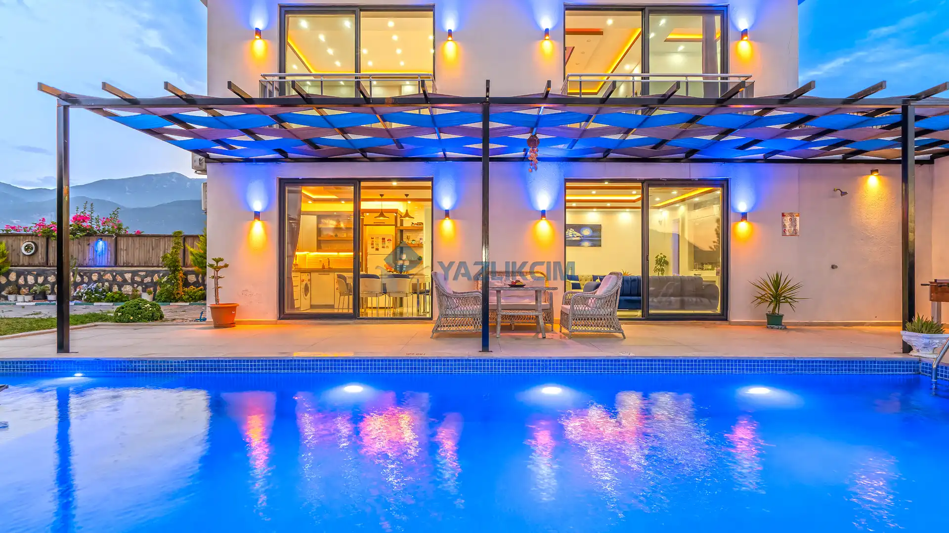 Detayları : Şezlonglar, barbekü, yemek masası, salıncak, oturma grubu bulunmaktadır.