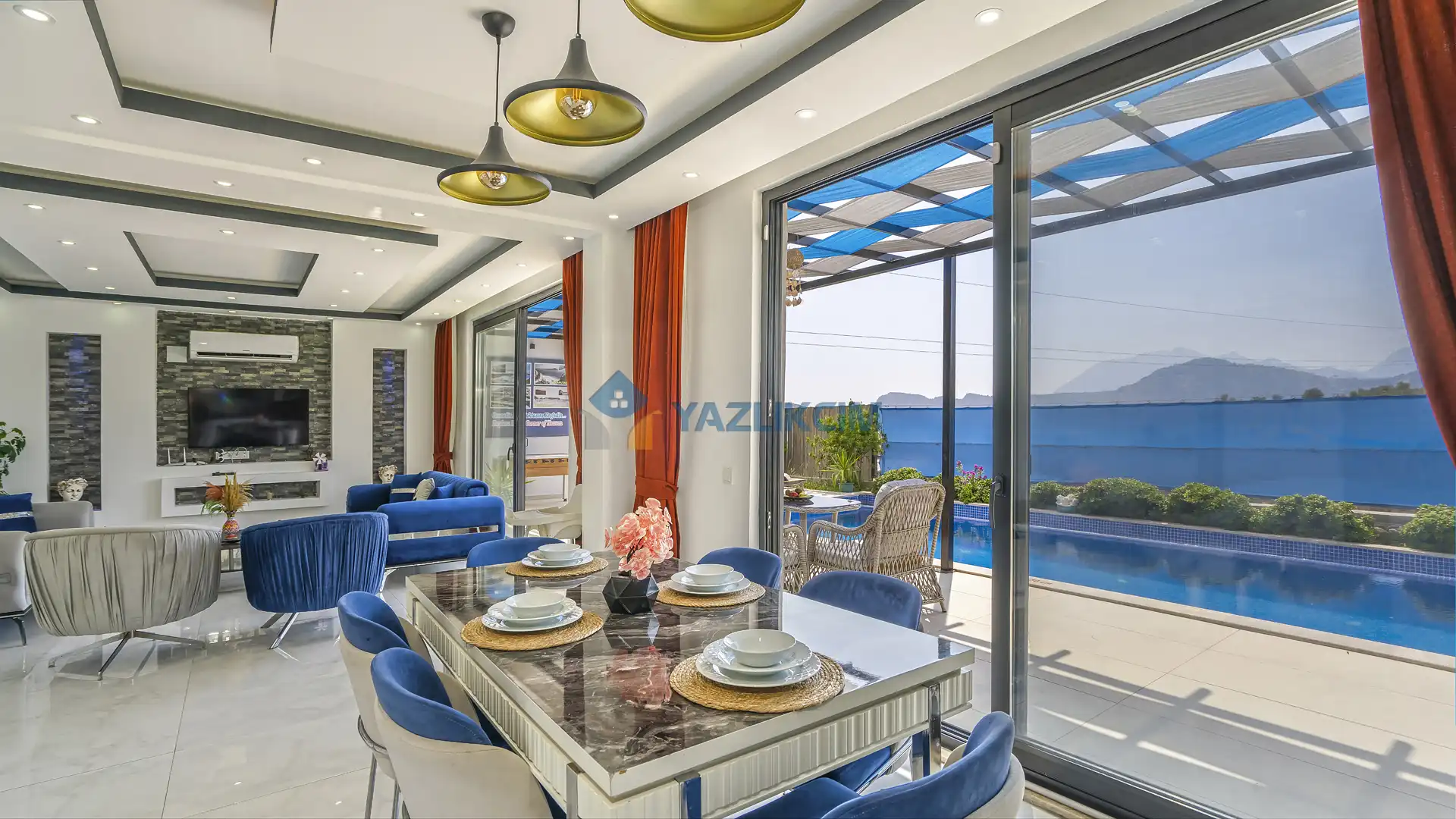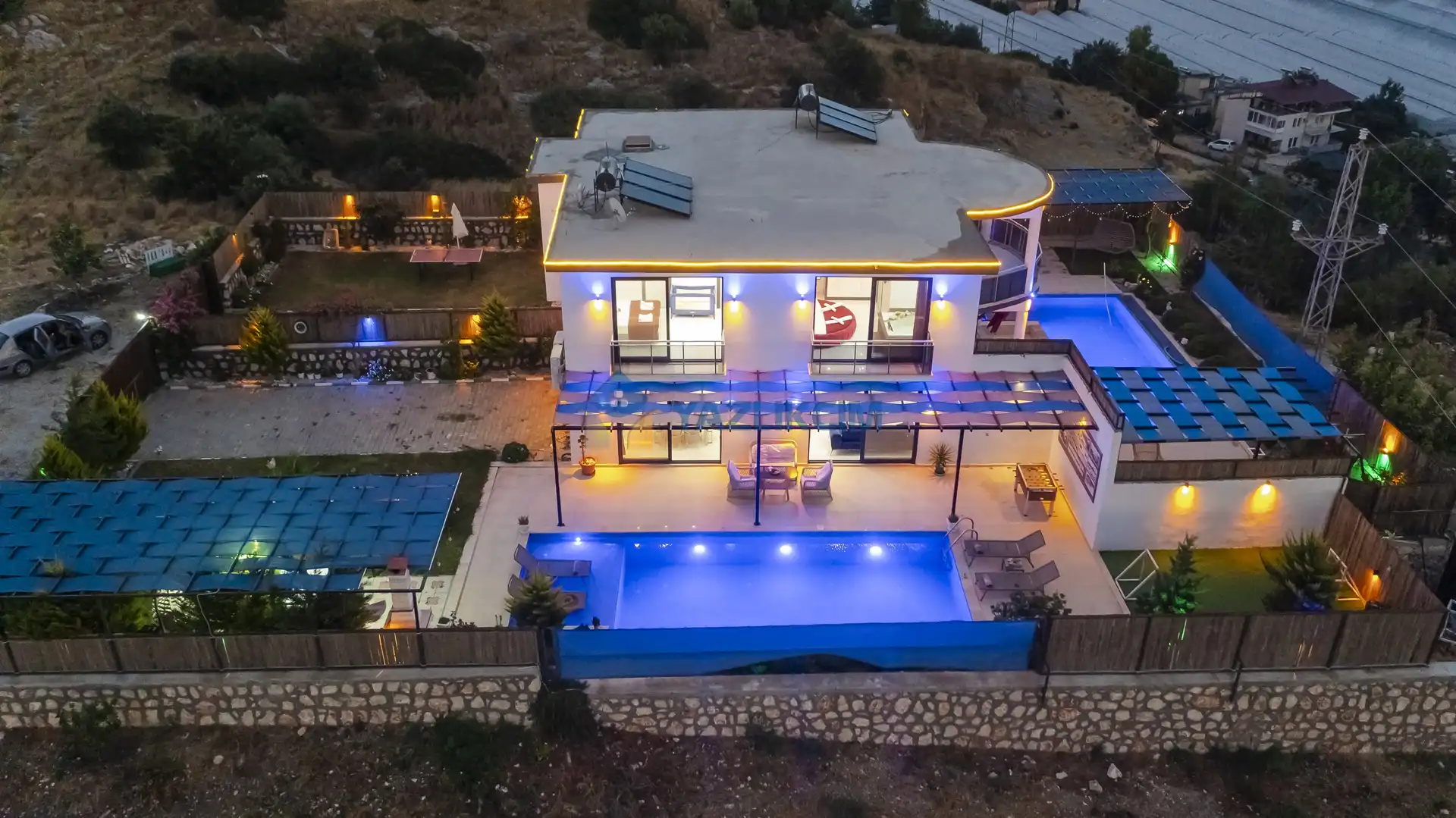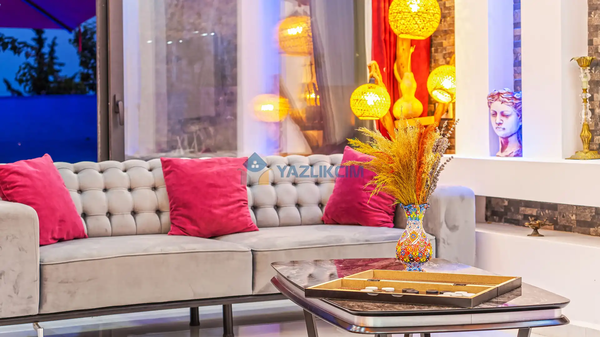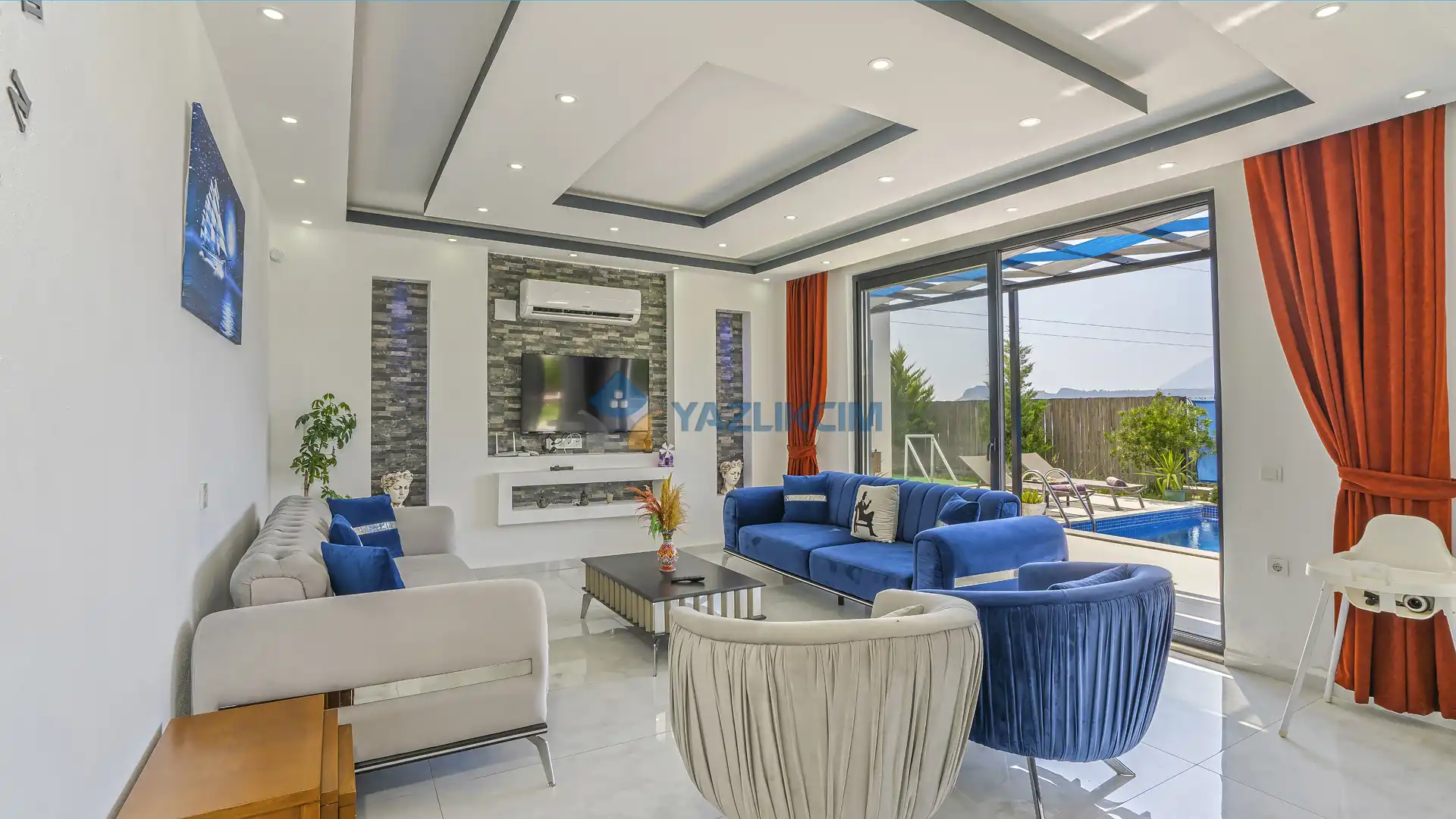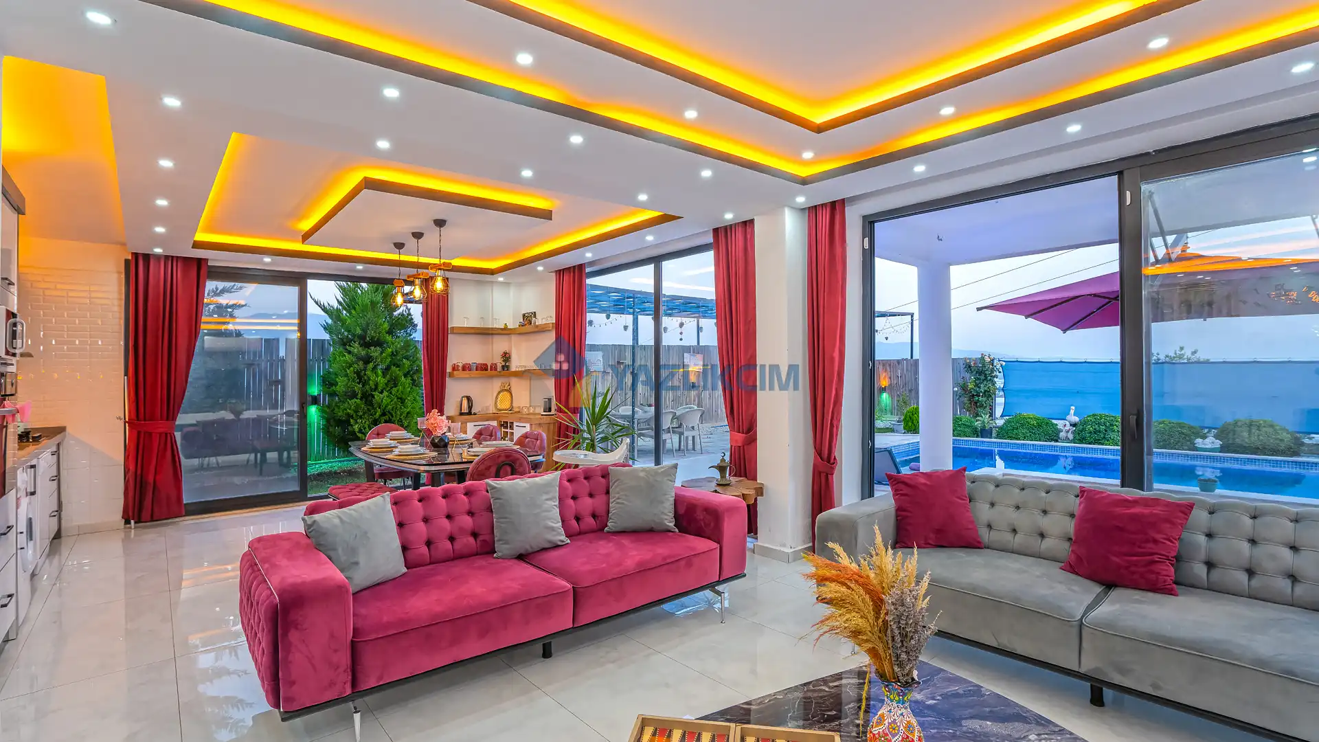Detayları : Şezlonglar, barbekü, yemek masası, salıncak, oturma grubu bulunmaktadır.