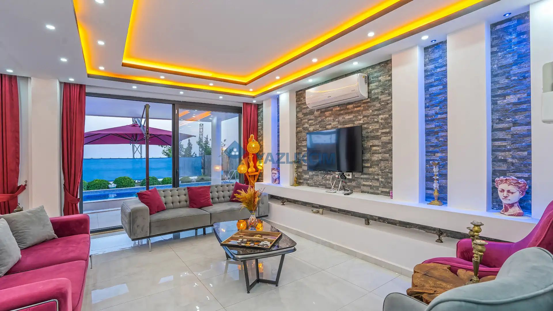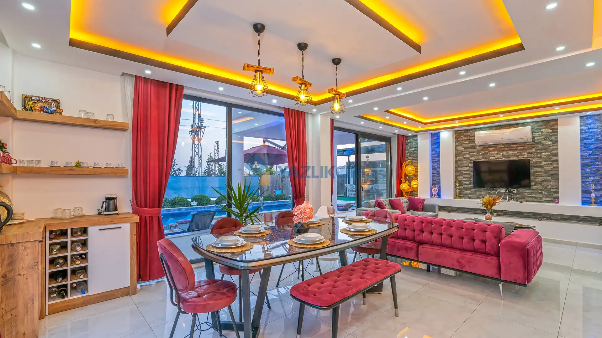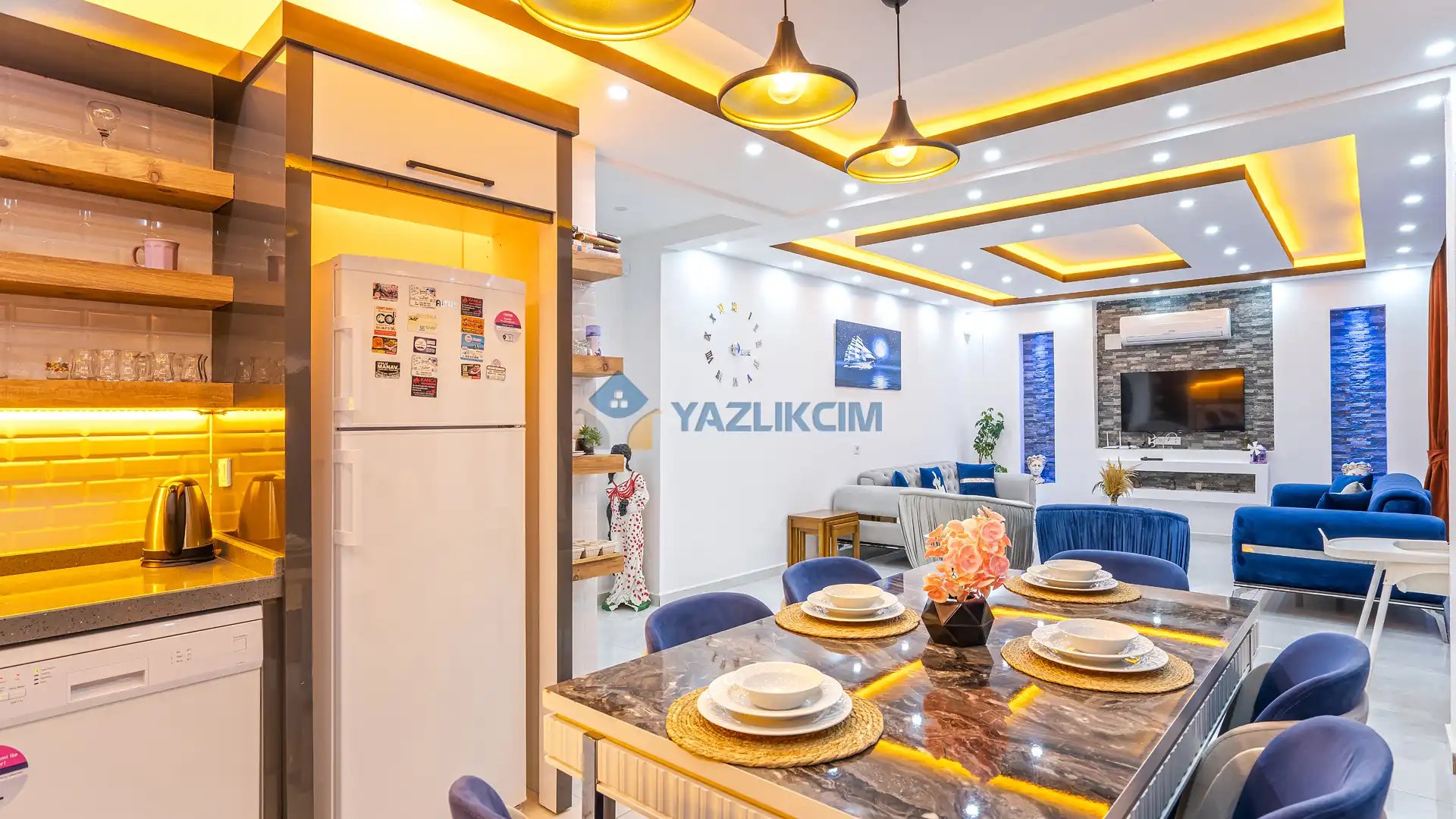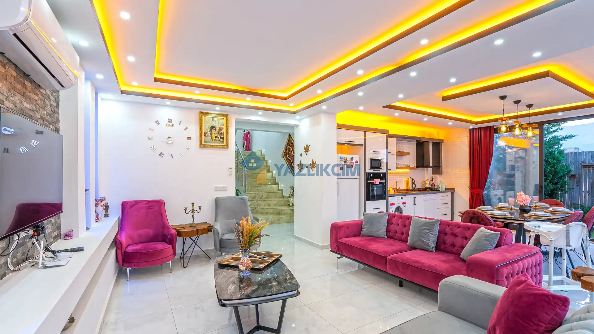 Salon Detayları: TV, modern oturma grubu, yemek masası, klima ve Banyo & WC bulunmaktadır.
