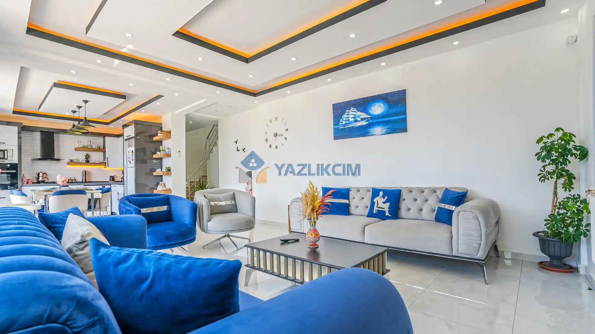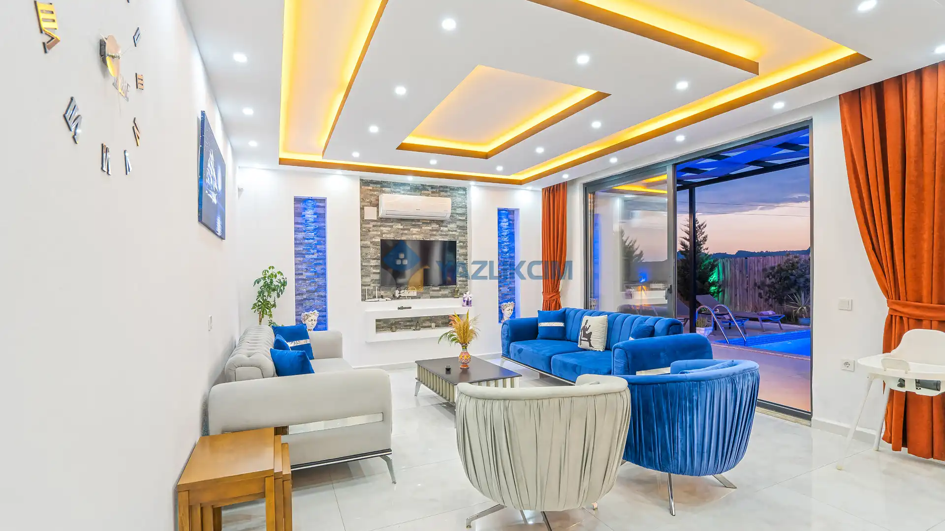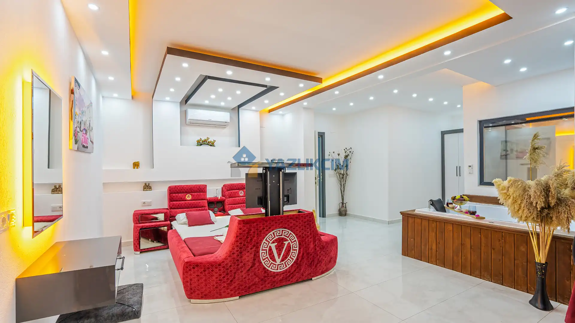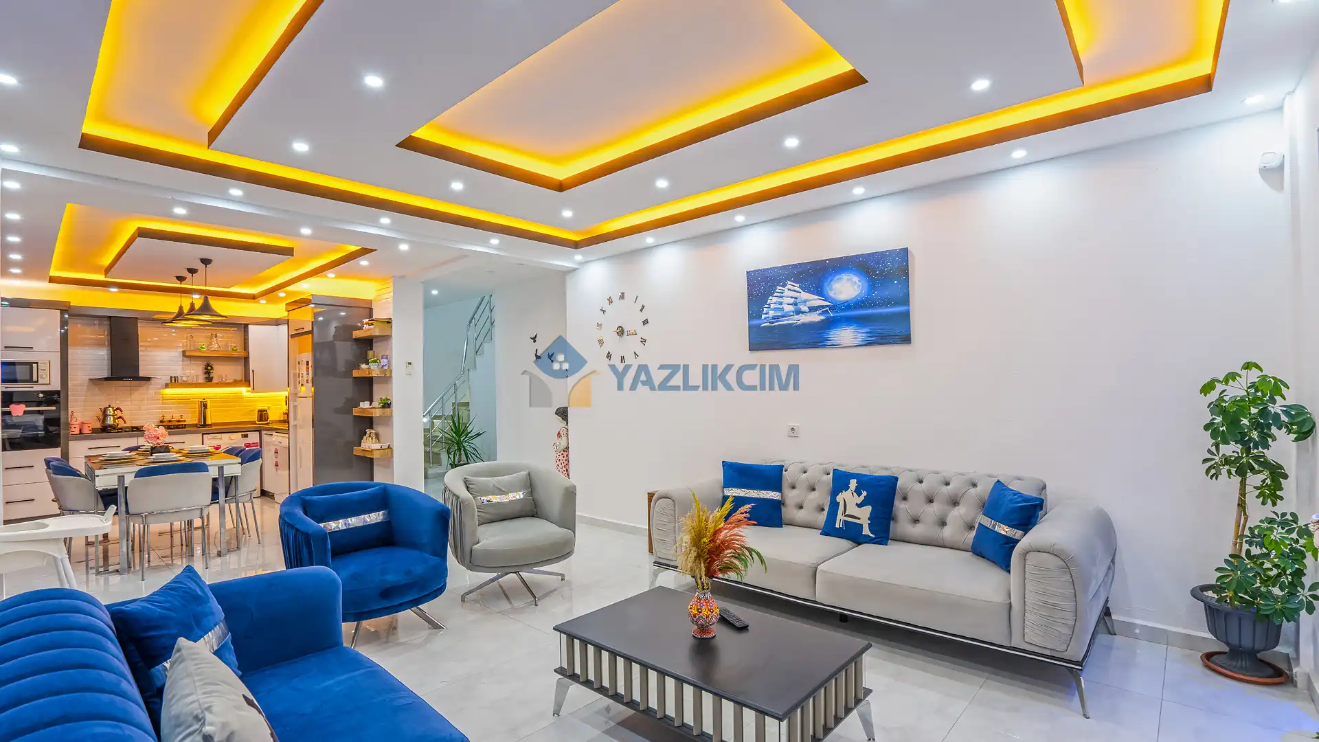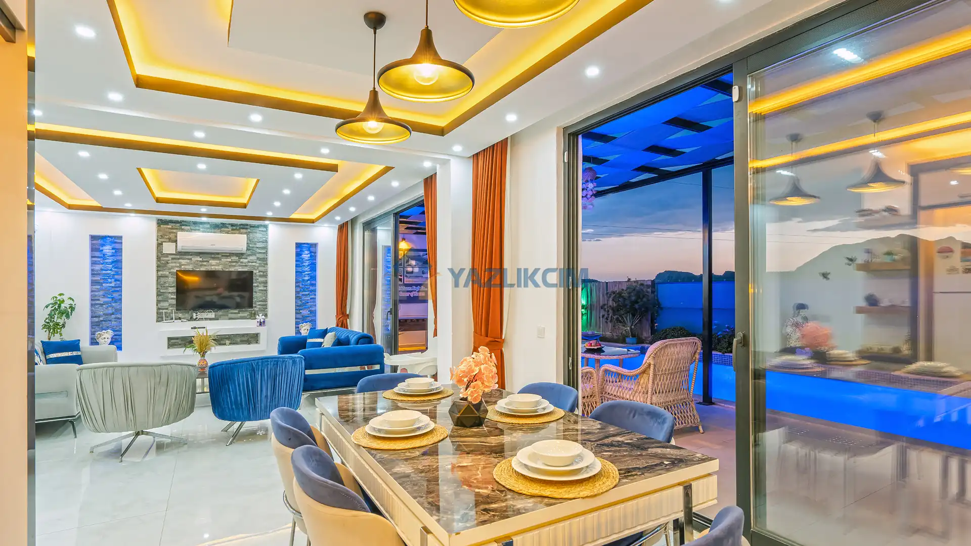 Salon Detayları: TV, modern oturma grubu, yemek masası, klima ve Banyo & WC bulunmaktadır.