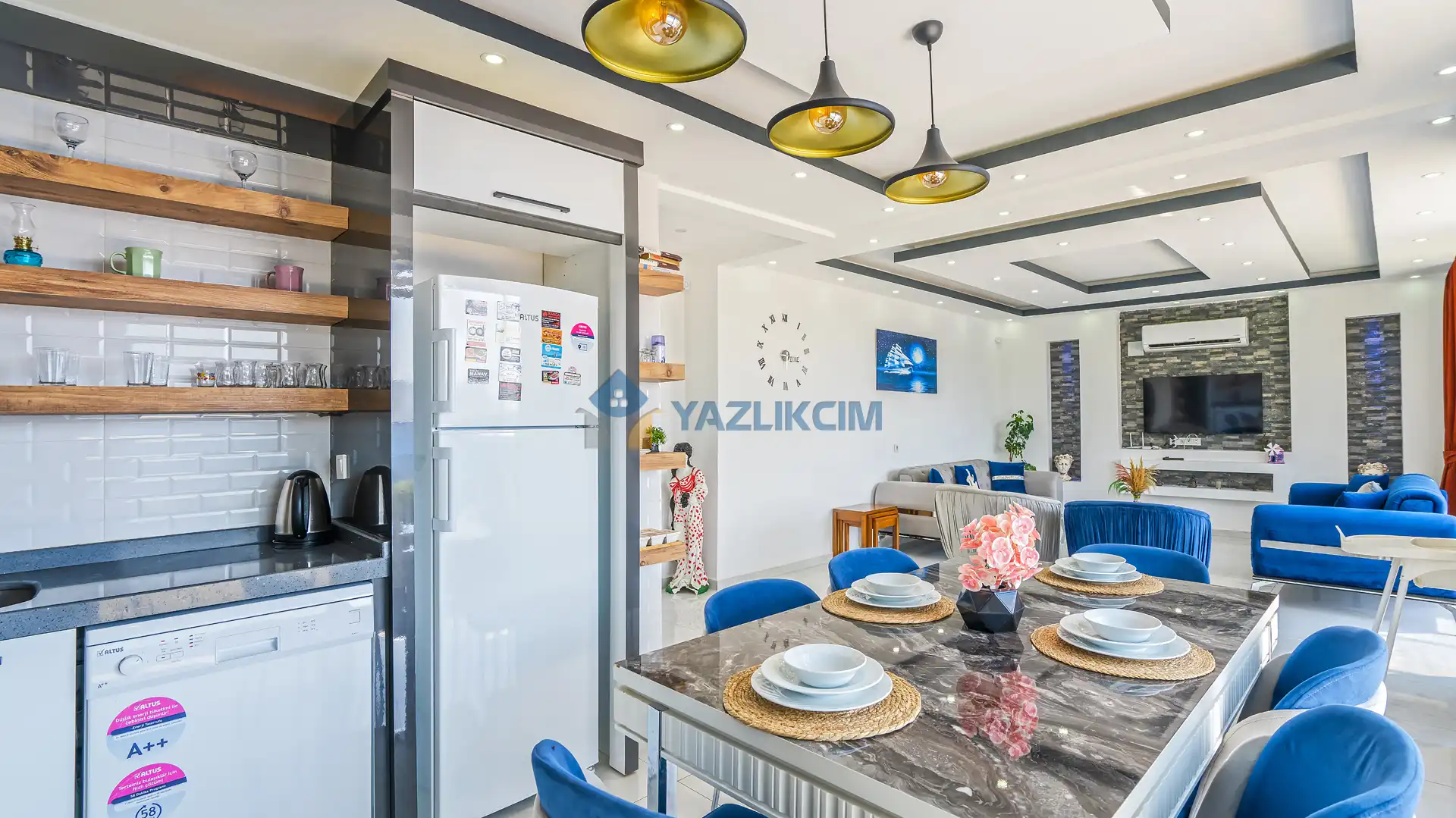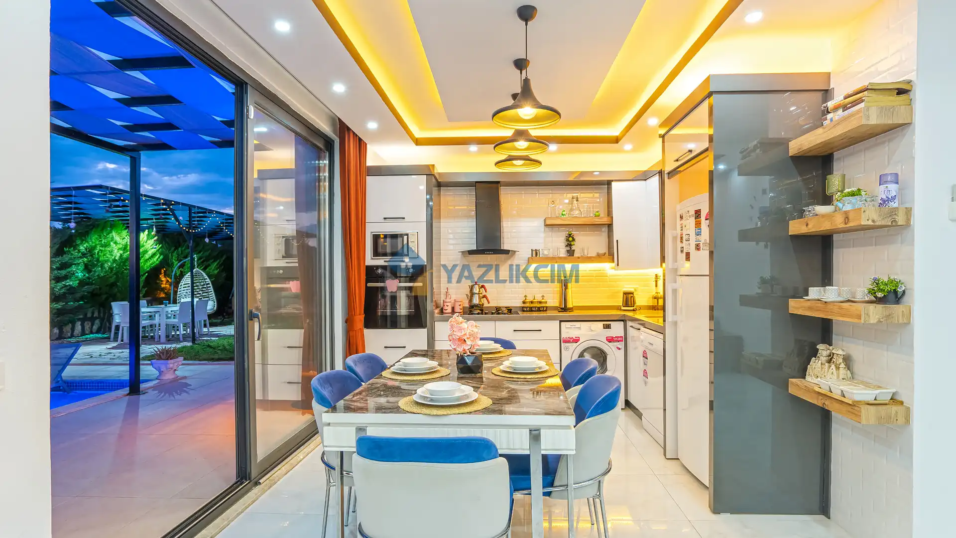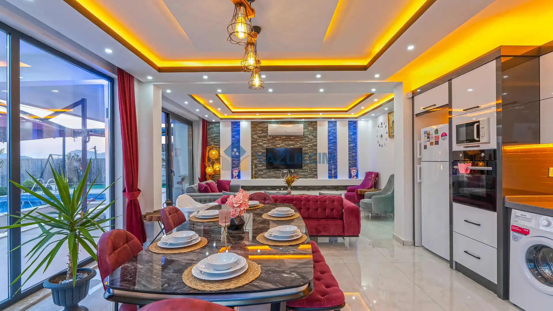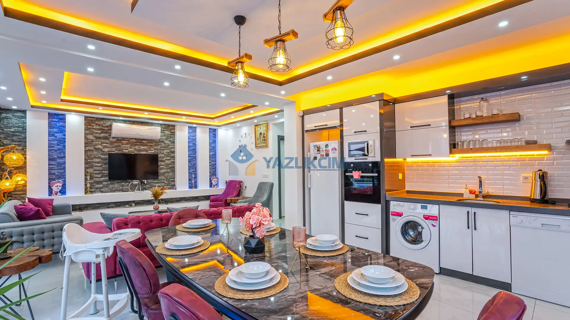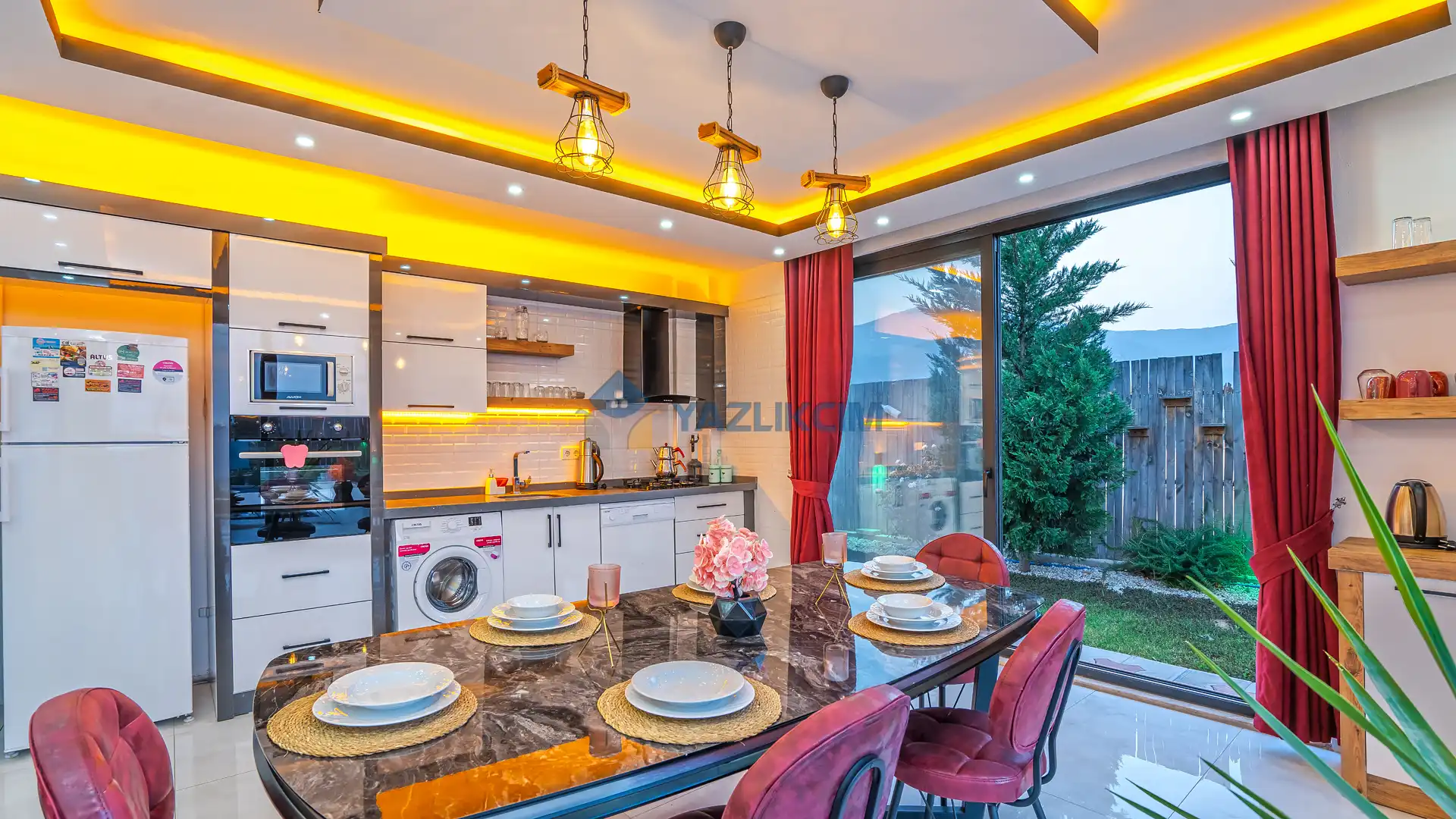 Mutfak Detayları: Buzdolabı, bulaşık makinesi, fırın, mikrodalga, tost makinesi çamaşır makinesi, yemek takımı, tava-tencere, çatal-bıçak seti bulunmaktadır.