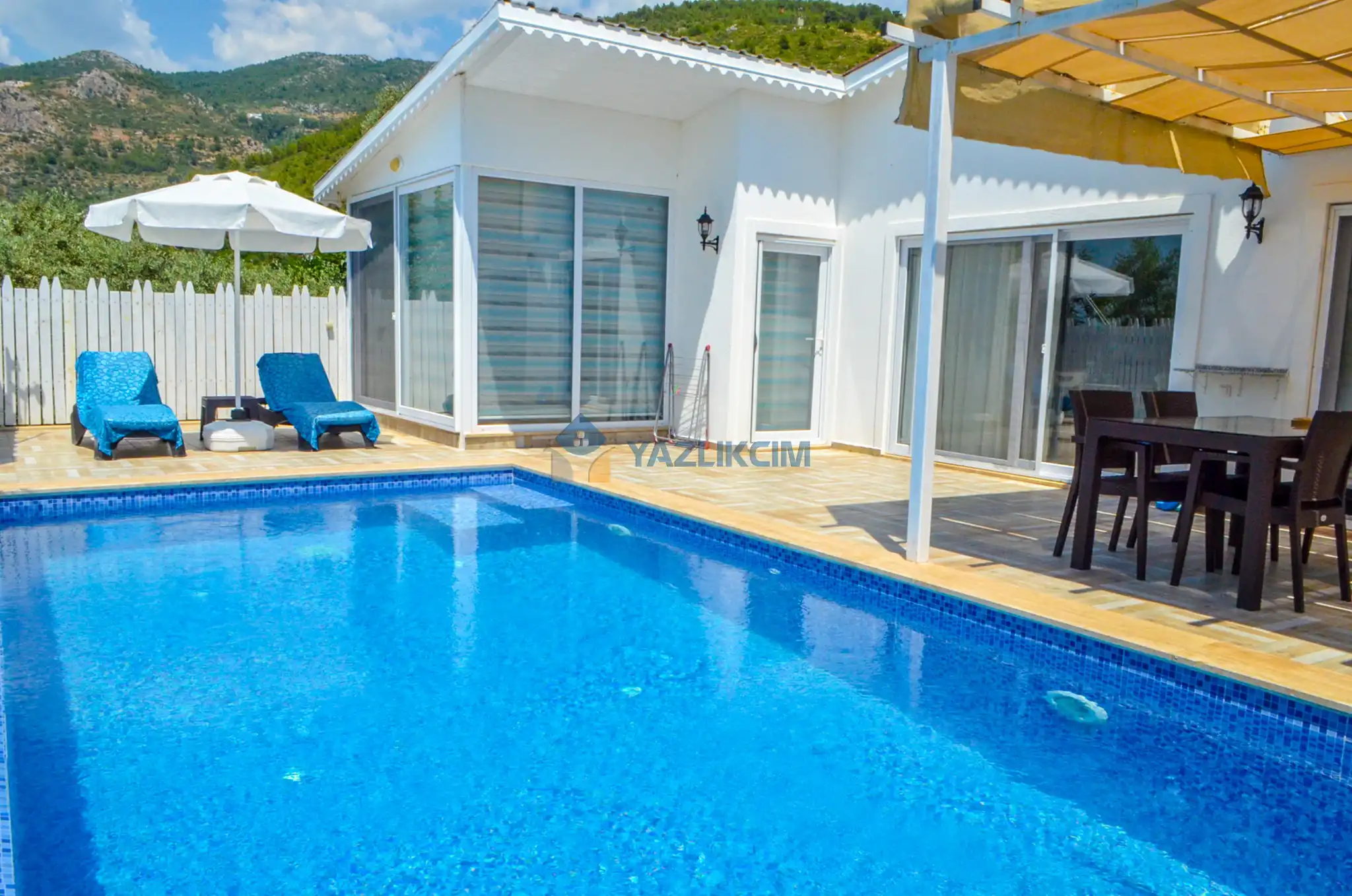 Detayları: TV, koltuk takımı, klima, yemek masası takımı, sehpa ve havuz terasına