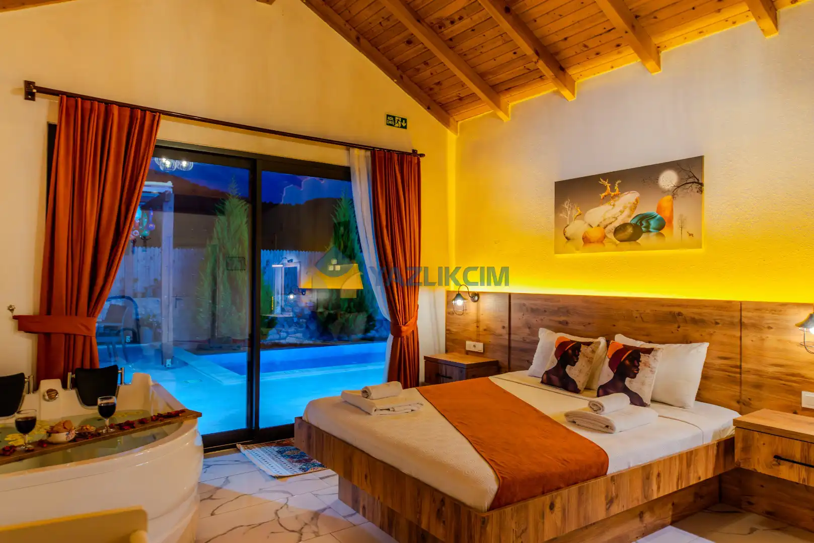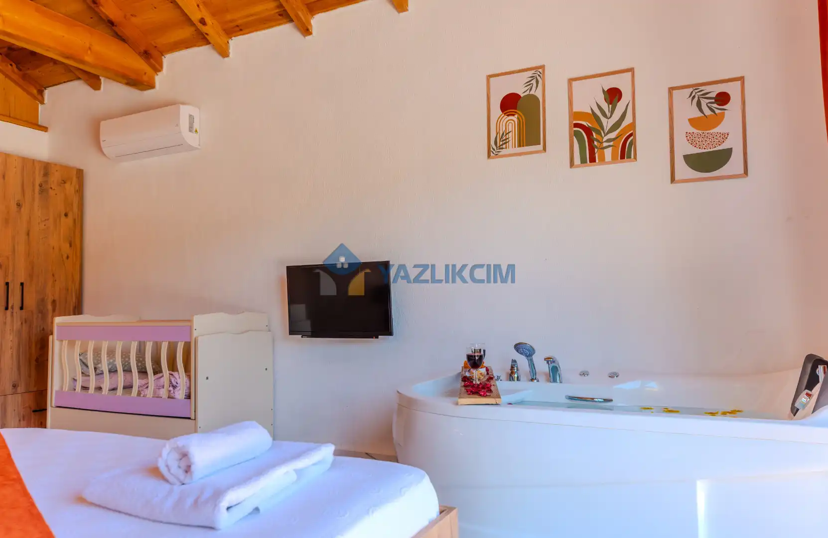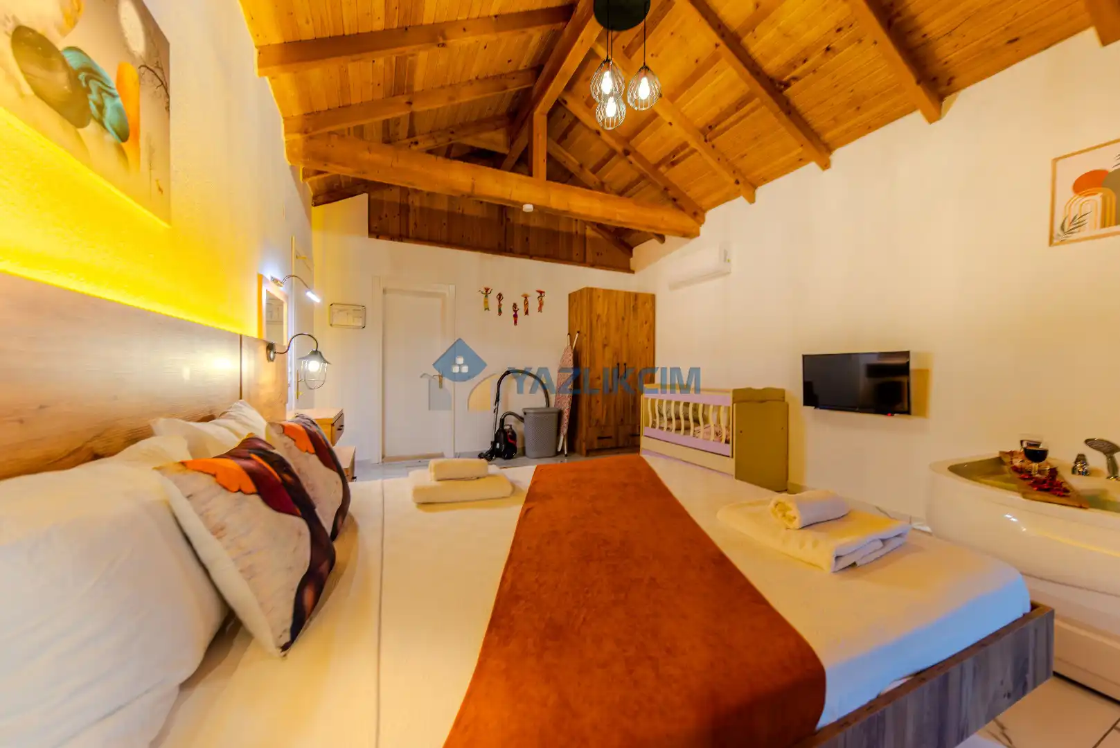 Detayları : Bir adet çift kişilik yatak ,klima, jakuzi, komodin, makyaj masası, park yatak, elbise dolabı ve ebeveyn banyosu bulunmaktadır.