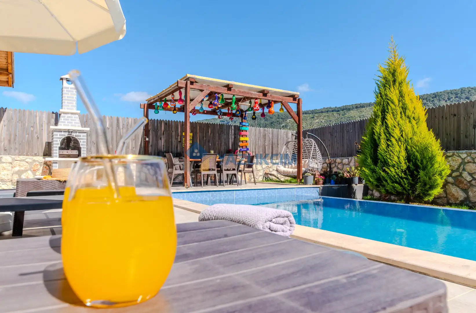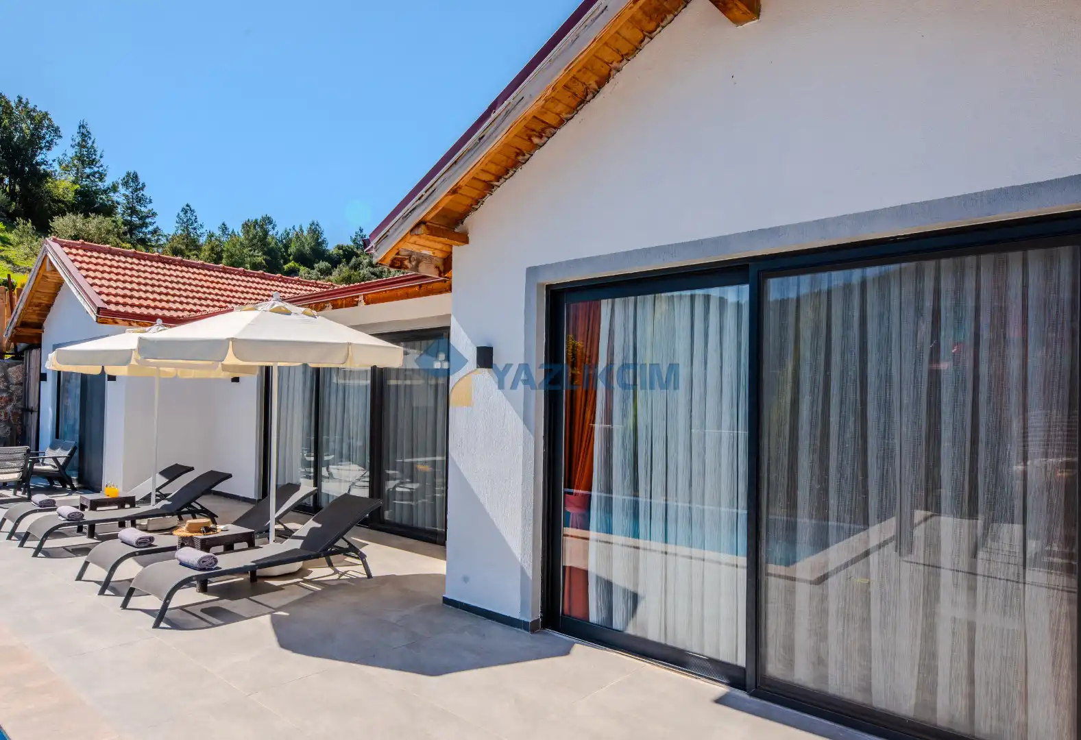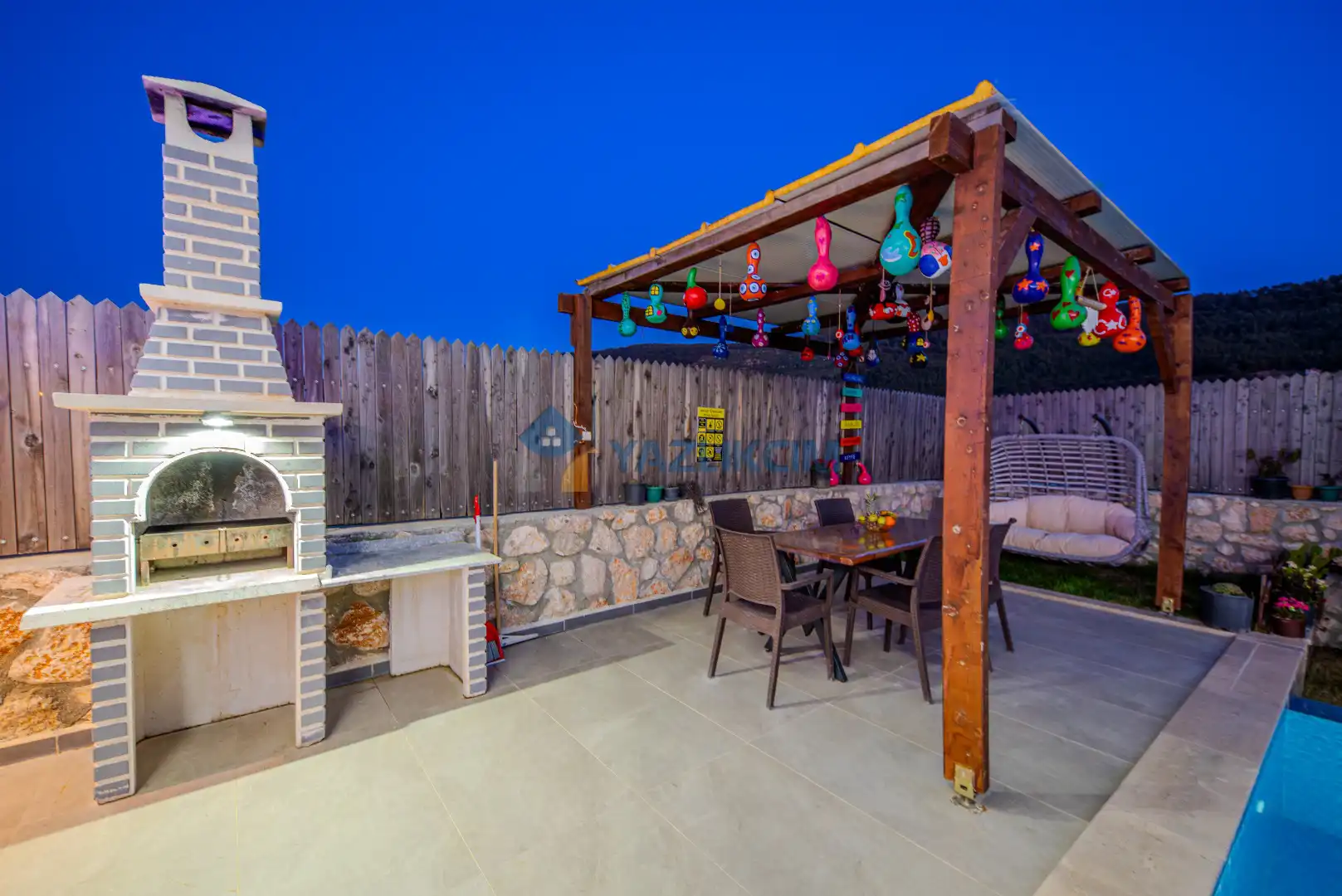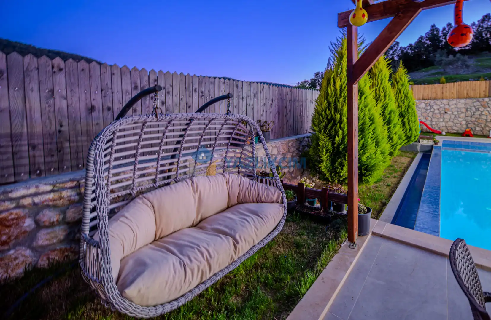 Detayları : Şezlonglar, barbekü, yemek masası, salıncak, oturma grubu bulunmaktadır.