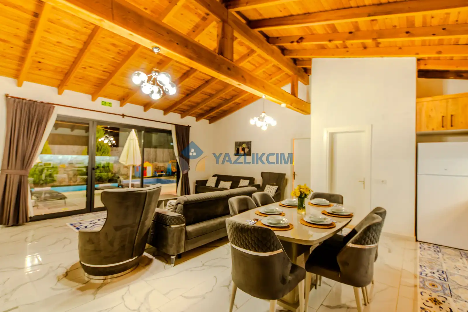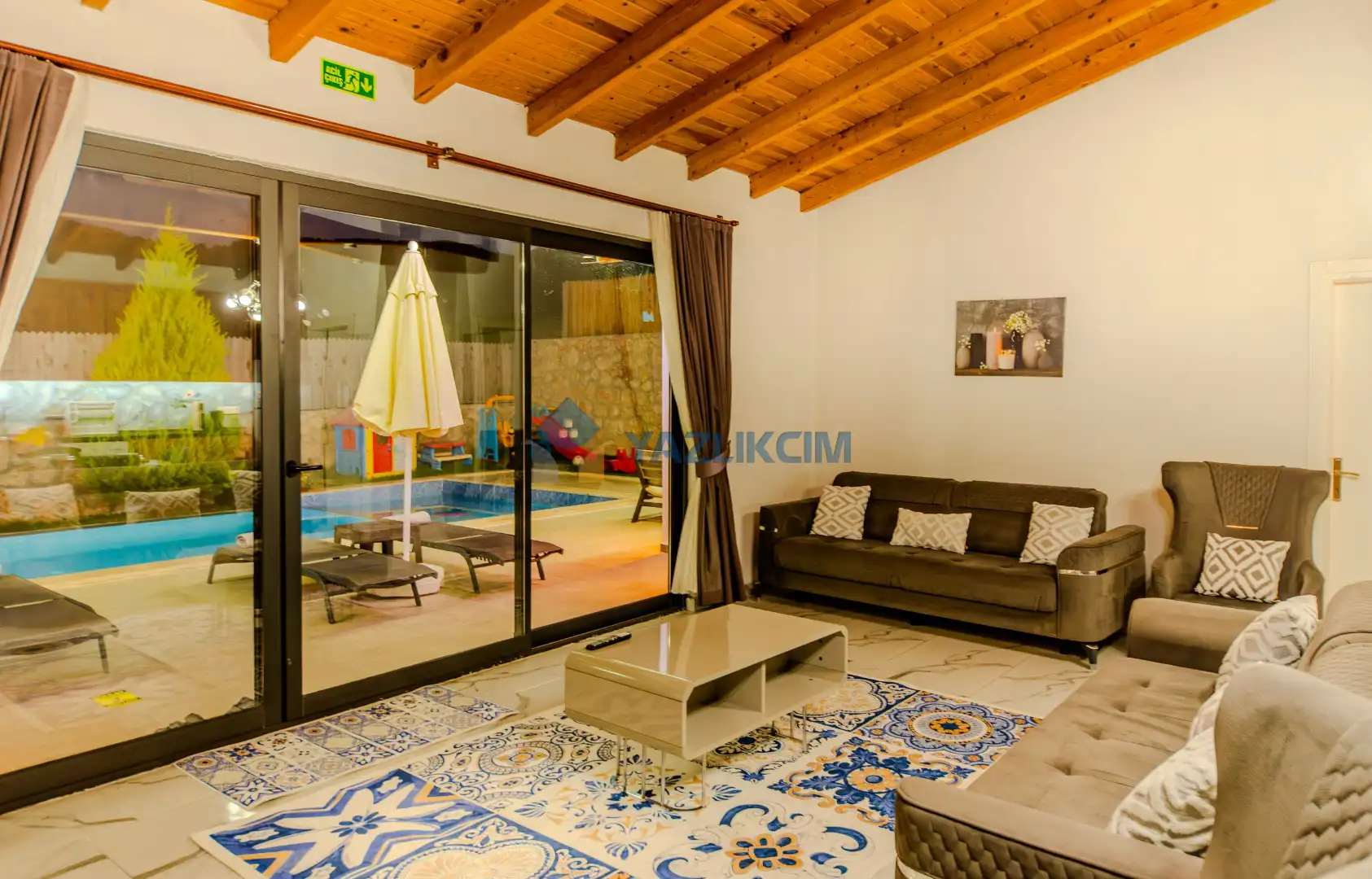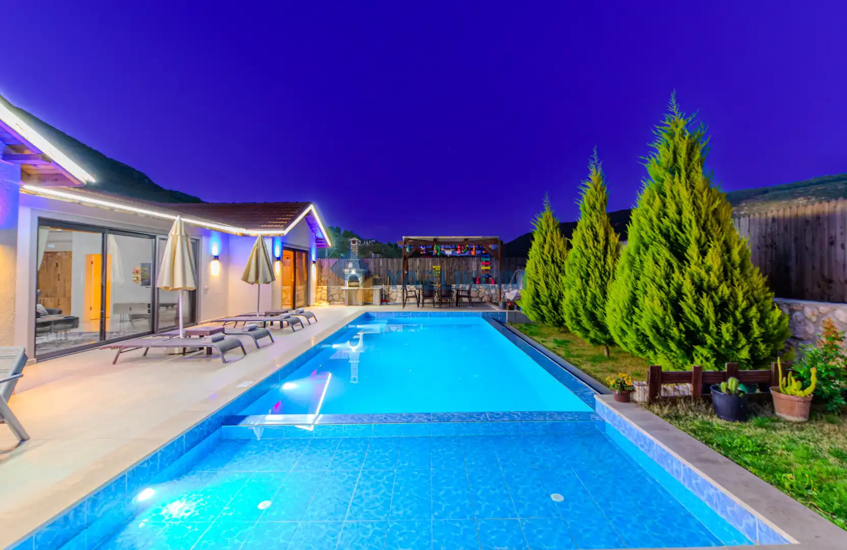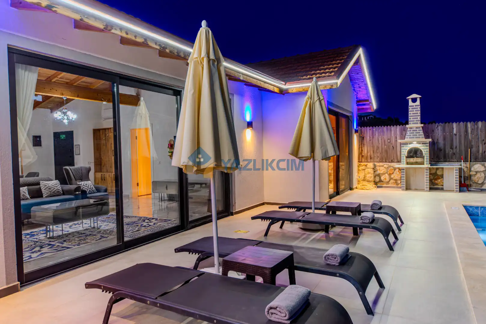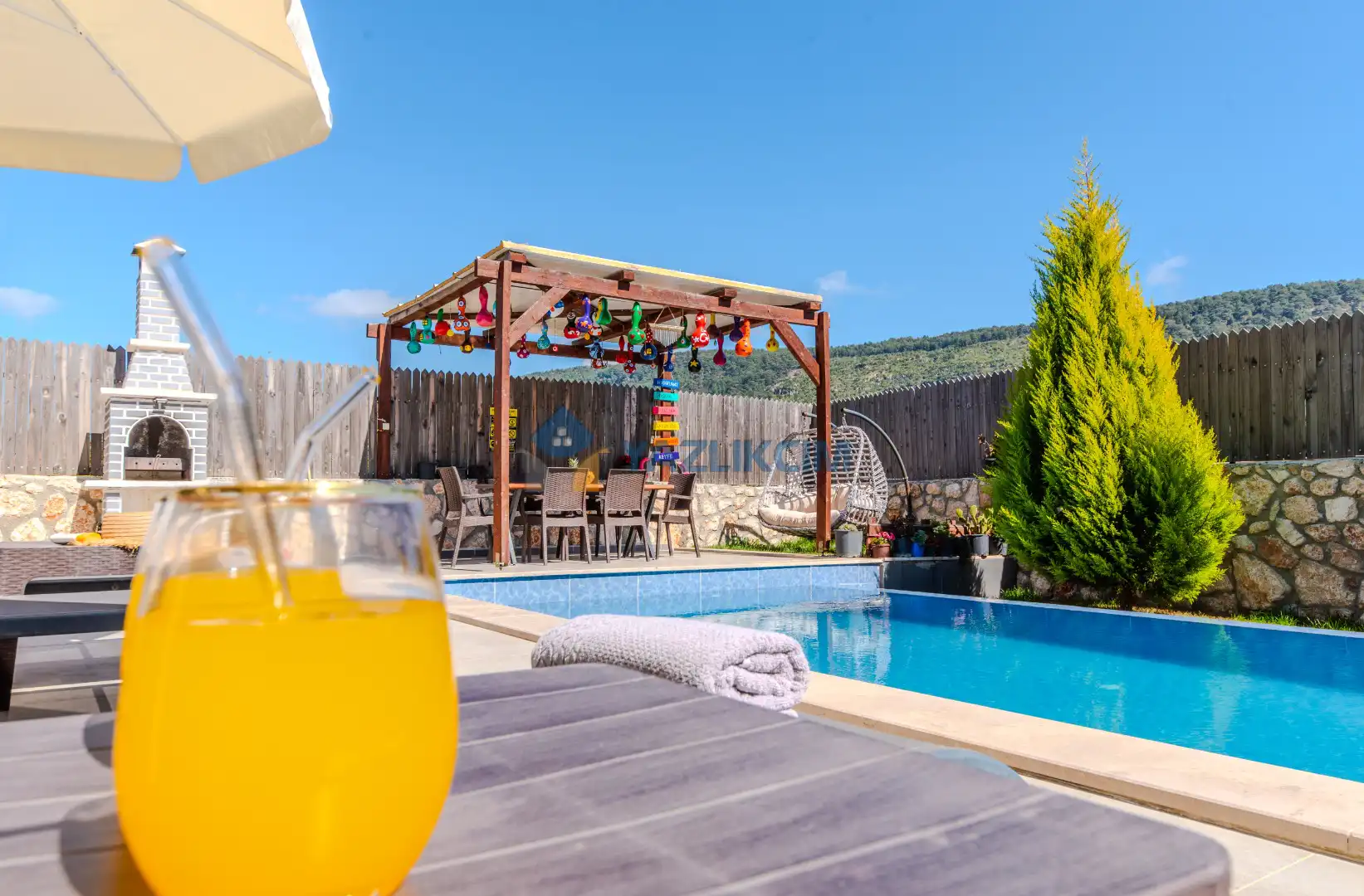 Detayları : Şezlonglar, barbekü, yemek masası, salıncak, oturma grubu bulunmaktadır.