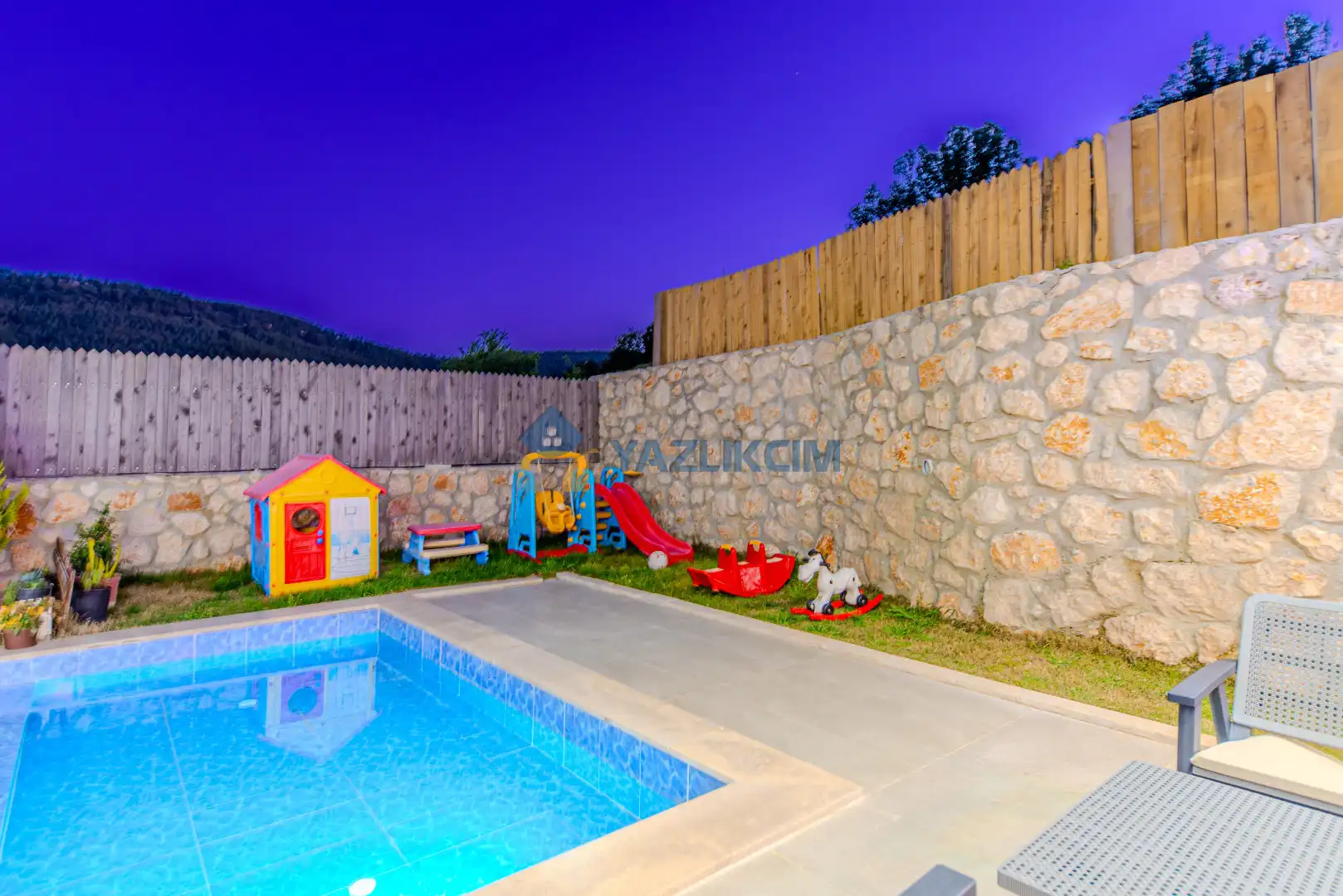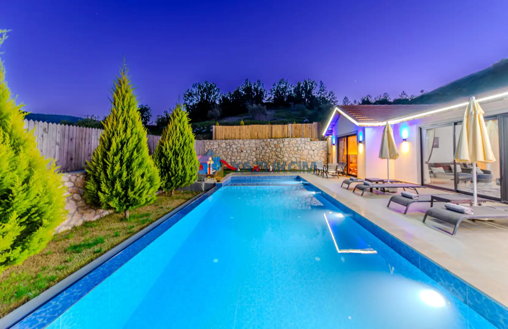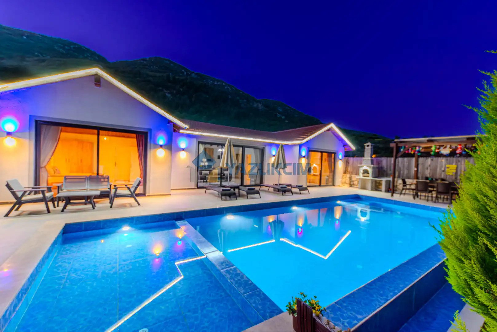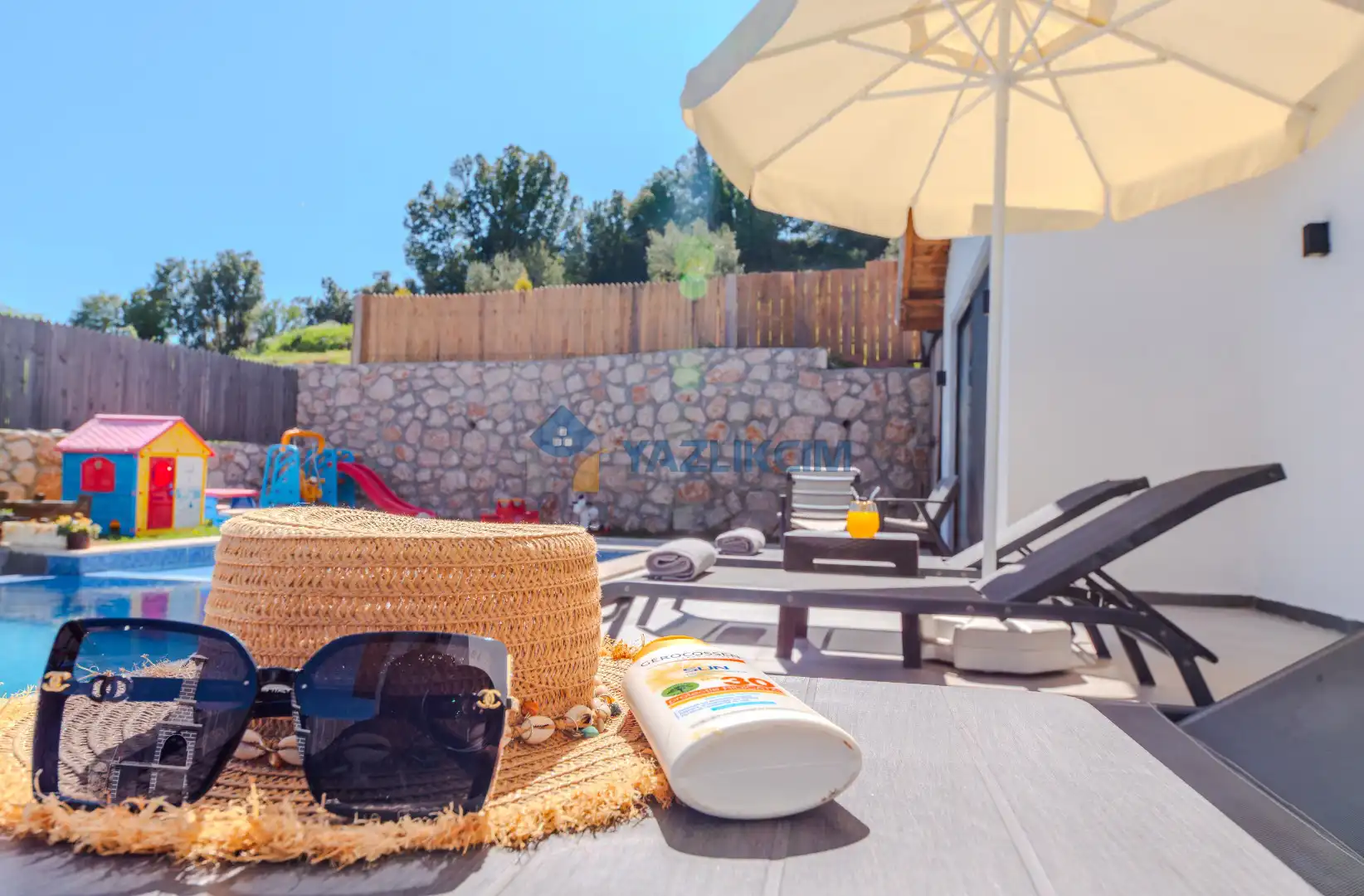 Detayları : Şezlonglar, barbekü, yemek masası, salıncak, oturma grubu bulunmaktadır.