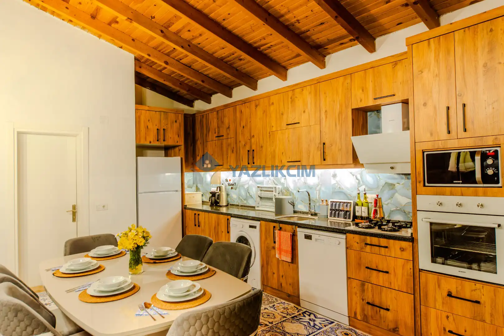 Mutfak Detayları: Buzdolabı, bulaşık makinesi, mama sandalyesi, fırın, mikrodalga, tost makinesi çamaşır makinesi, yemek takımı, tava-tencere, çatal-bıçak seti bulunmaktadır.
