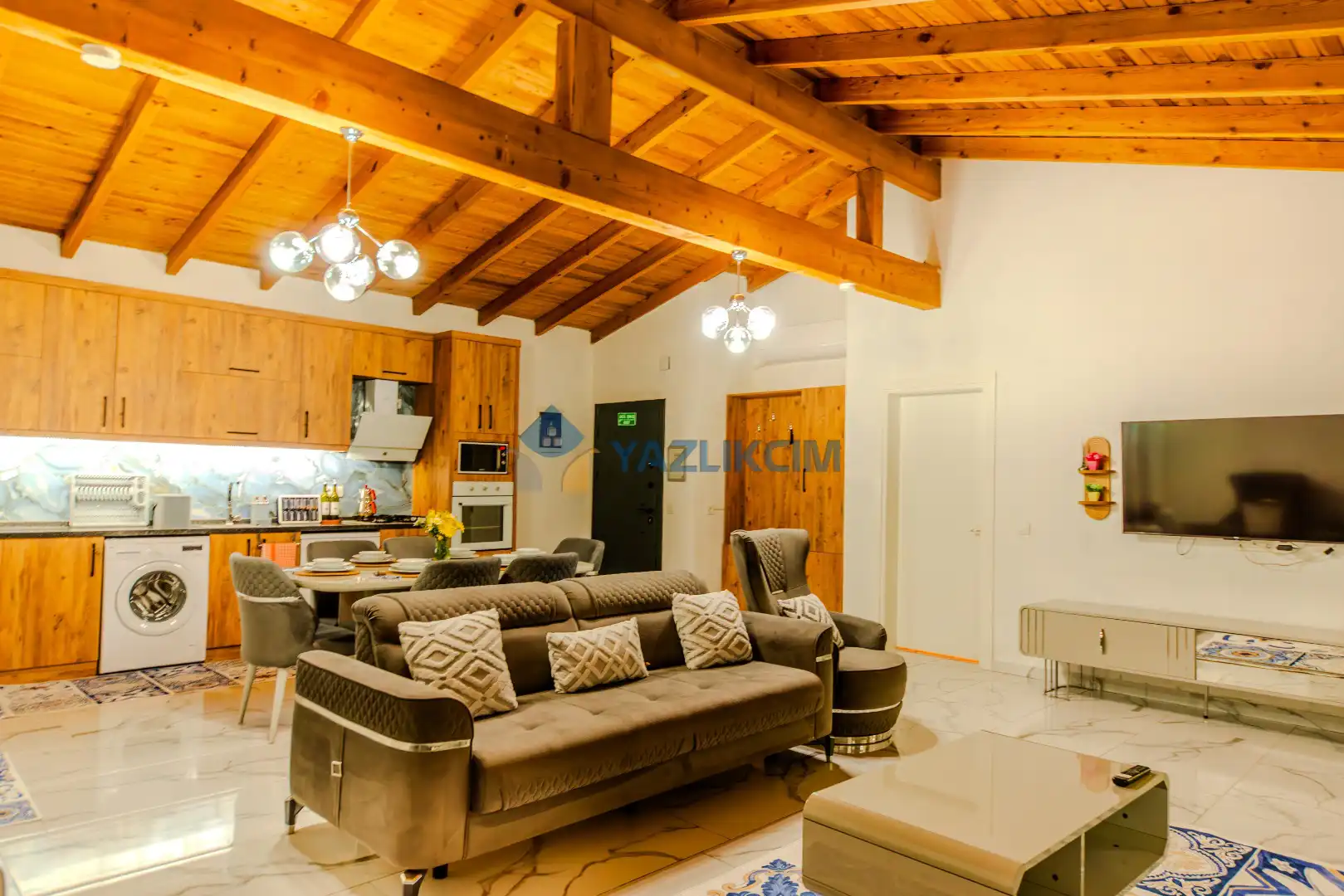 Salon Detayları: TV, modern oturma grubu, yemek masası, klima ve Banyo & WC bulunmaktadır.