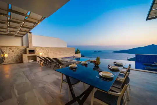 Yazlik tatil villalari merkezi haline dönüsen Antalya’nin Kalkan beldesi; plajlari, dogal manzaralari ve bol oksijene sahip havasi ile tatilcilerin ugrak adresleri arasinda yer almaya devam ediyor. Kalkan sinirlari içerisindeki Villa Retro, ekonomik villa, doga ile iç içe bir konumunun yani sira, essiz mimarisi ve tatilcilere sundugu genis ve ferah yasam alanlari ile mutlu ve huzurlu bir tatilin huzurunu ilk dakikalardan itibaren yasatiyor. Villa Retro'nun sahip oldugu dag ve deniz manzarasi esliginde kahvalti ile güne baslayabilir, özel havuzunuzda serinledikten sonra deniz manzarasina sahip terasta güneslenebilirsiniz. Sakin bir tatil noktasi Villa Retro, yesillikler içerisindeki konumu ile misafirlerine aradiklari huzuru, sakinligi ve ferahligi sunar. Konum itibari ile plaj ve sehir merkezine yakin bir lokasyonda yer alir. Havuz keyfini doyasiya yasadiktan sonra tatilin bir gününü en yakin plajda degerlendirmeyi de düsünebilirsiniz.