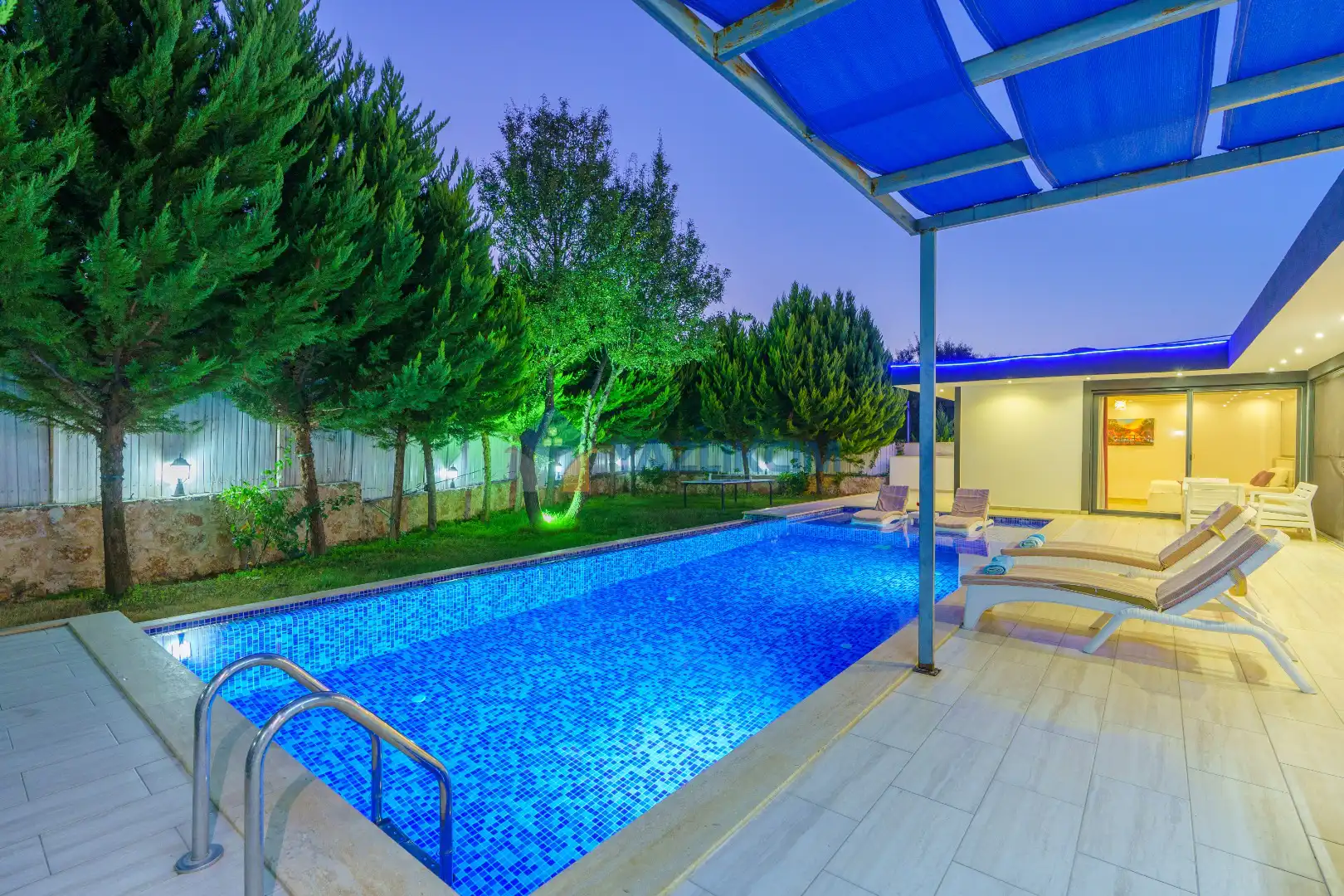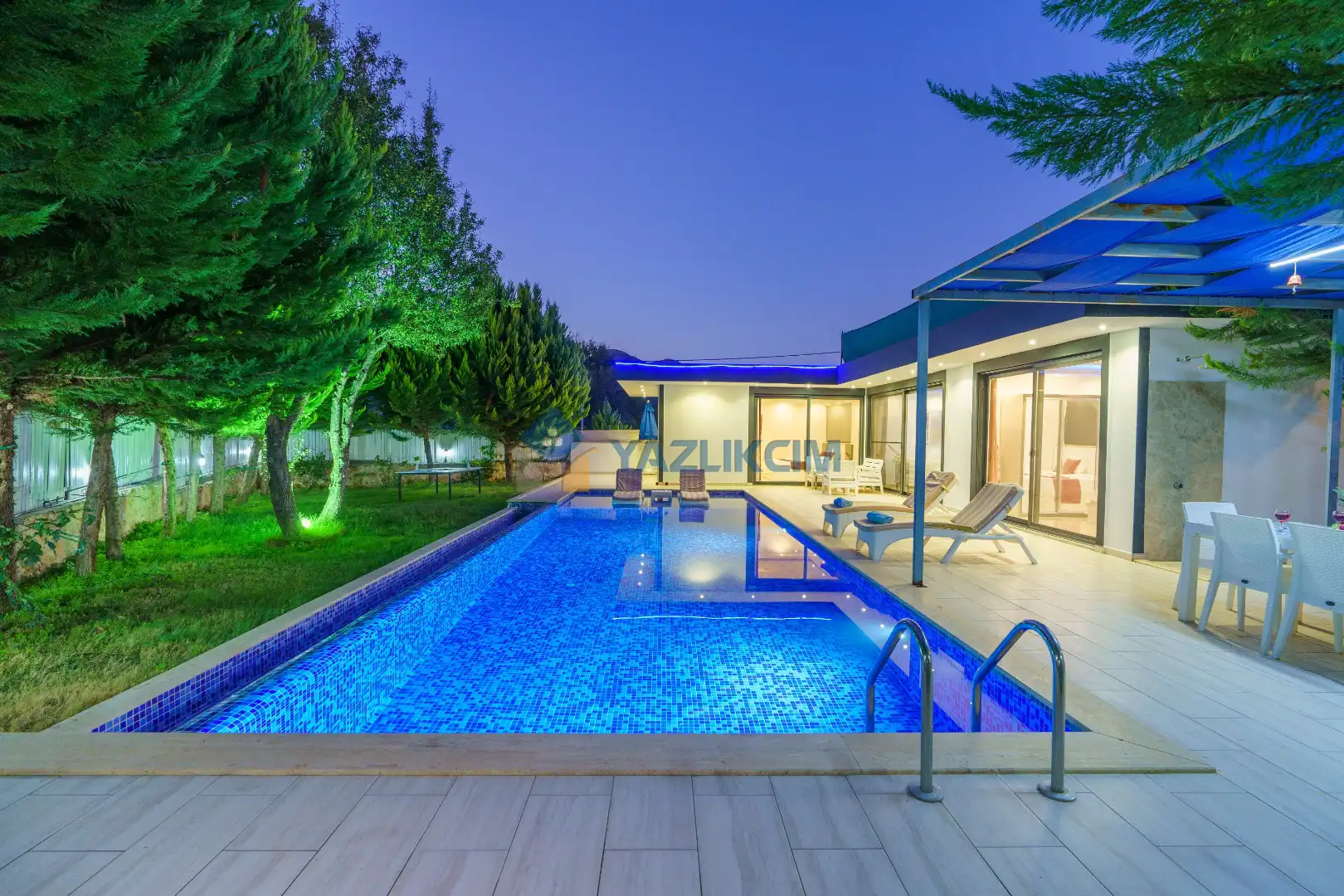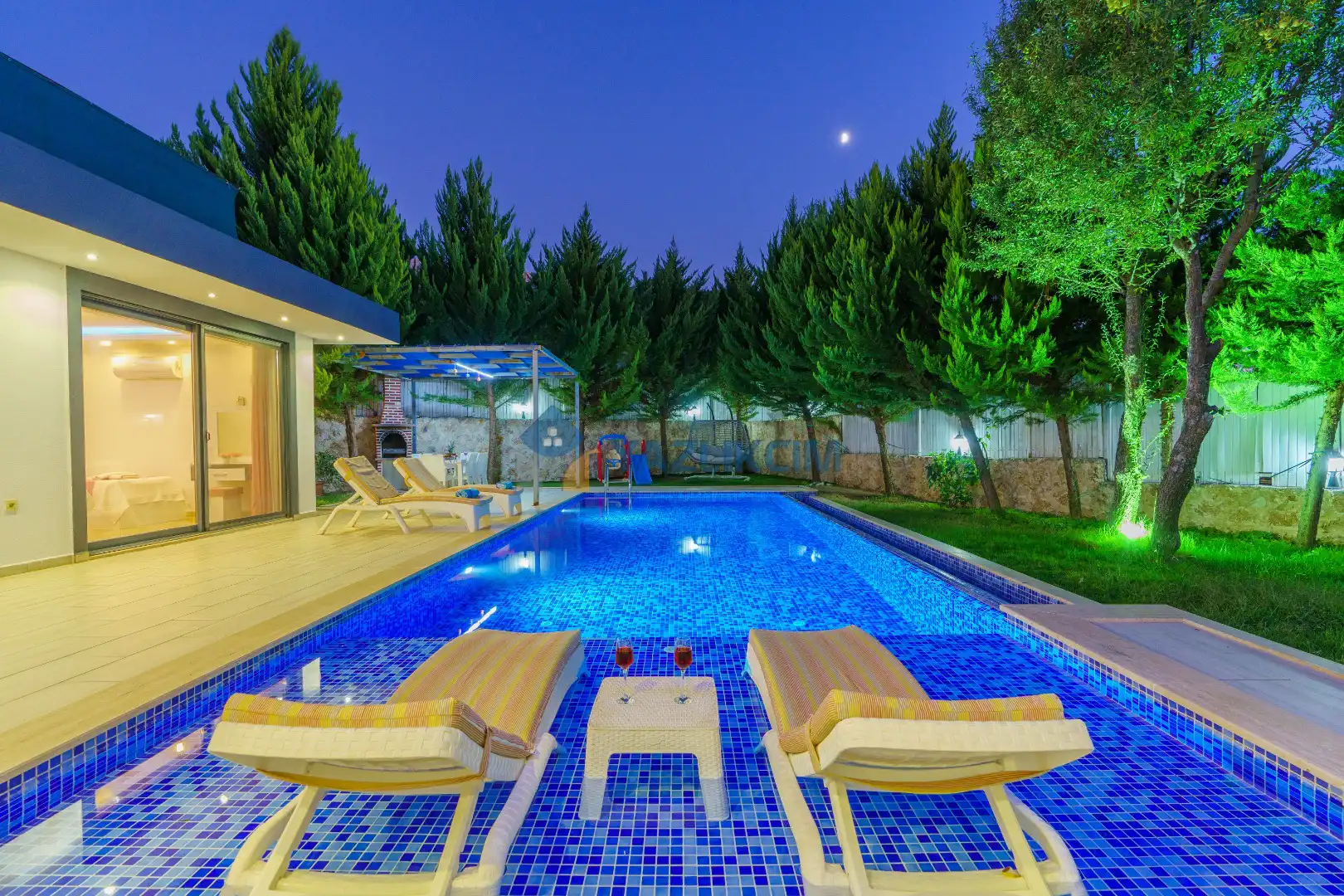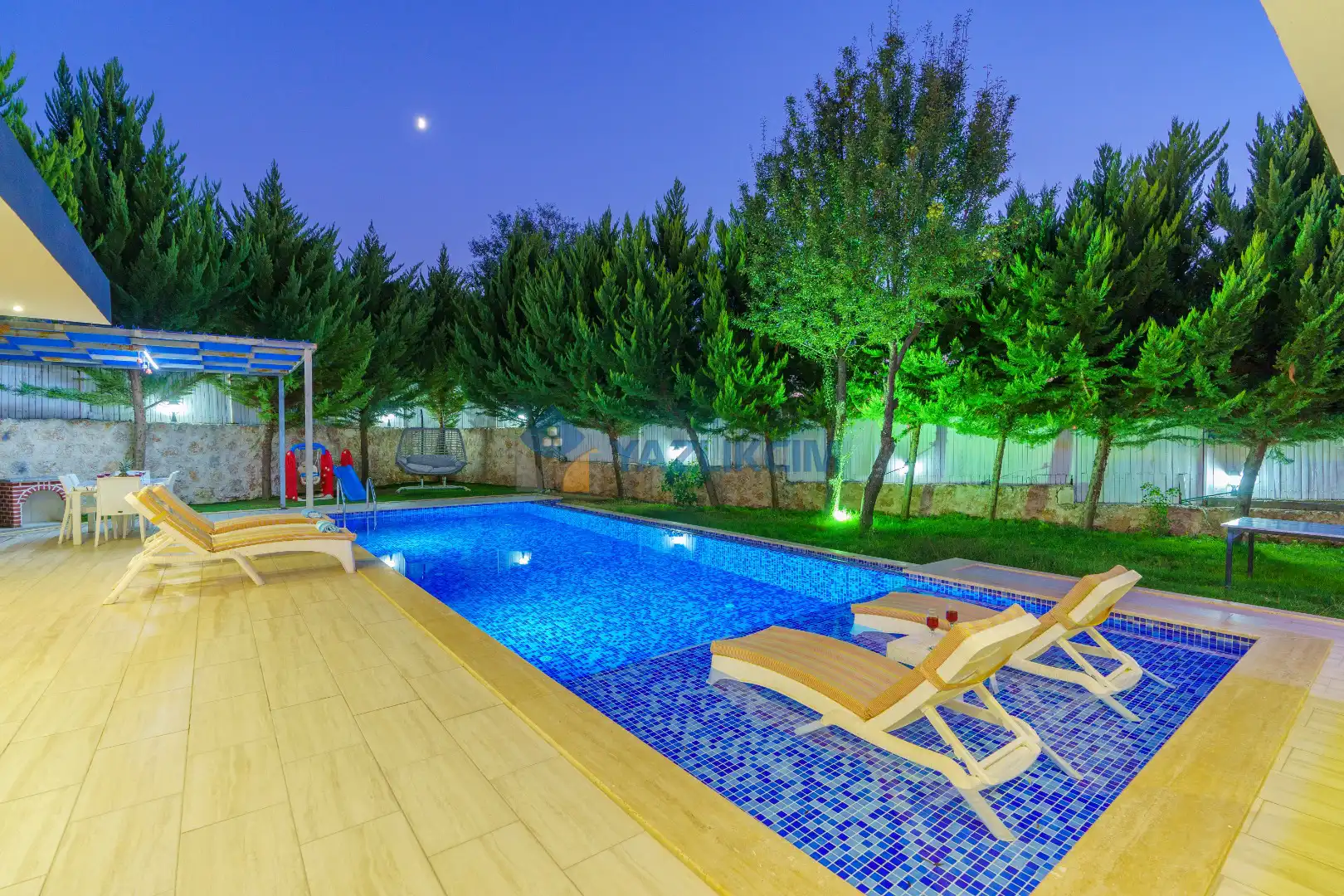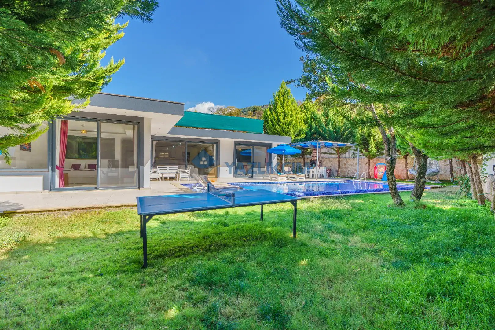 Detayları : 6 Kişilik masa ve sandalye, Oturma grubu, 6 adet şezlong, Şömine, Salıncak, Güneş şemsiyesi, Çocuk havuzu