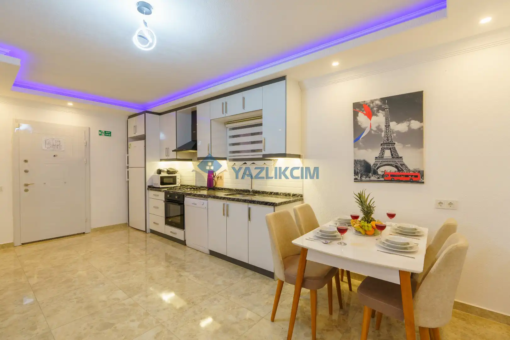 Mutfak Detayları : Buzdolabı, Bulaşık makinesi, Çamaşır makinesi, Fırın, 4’lü Ocak , Mikrodalga fırın, tost makinesi, kettle , yemek takımı, Tava, Tencereler, Çatal bıçak, Kahve makinası vb.