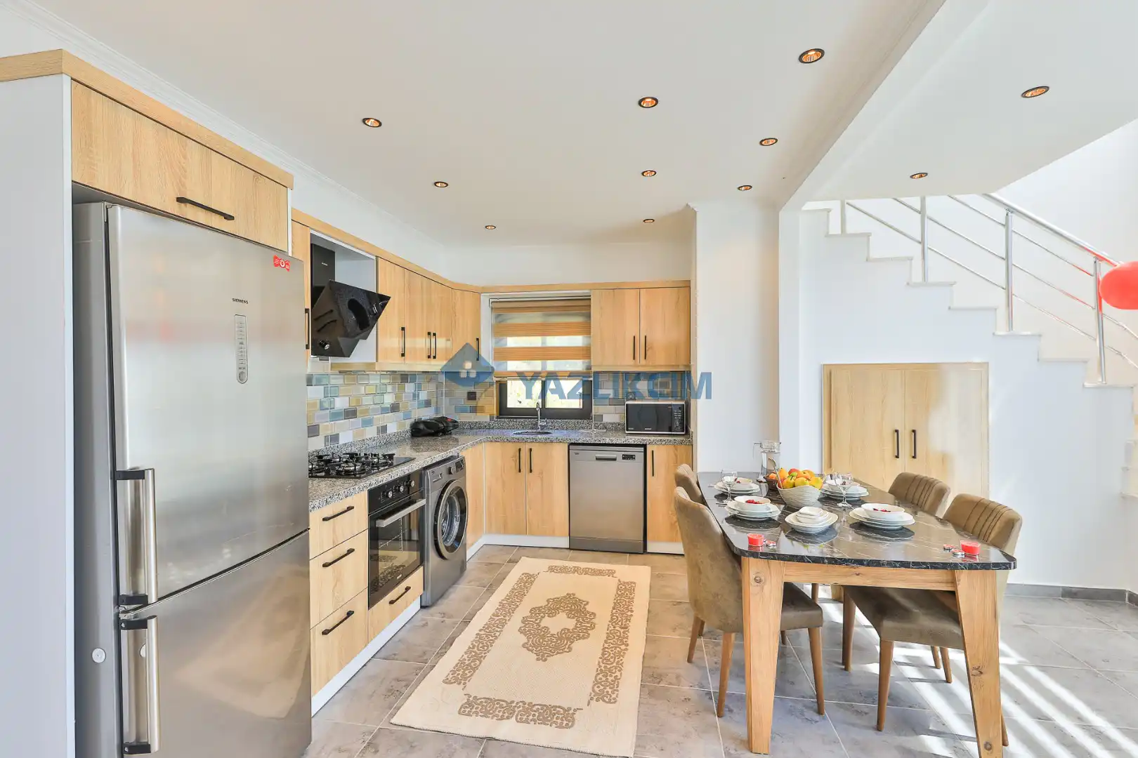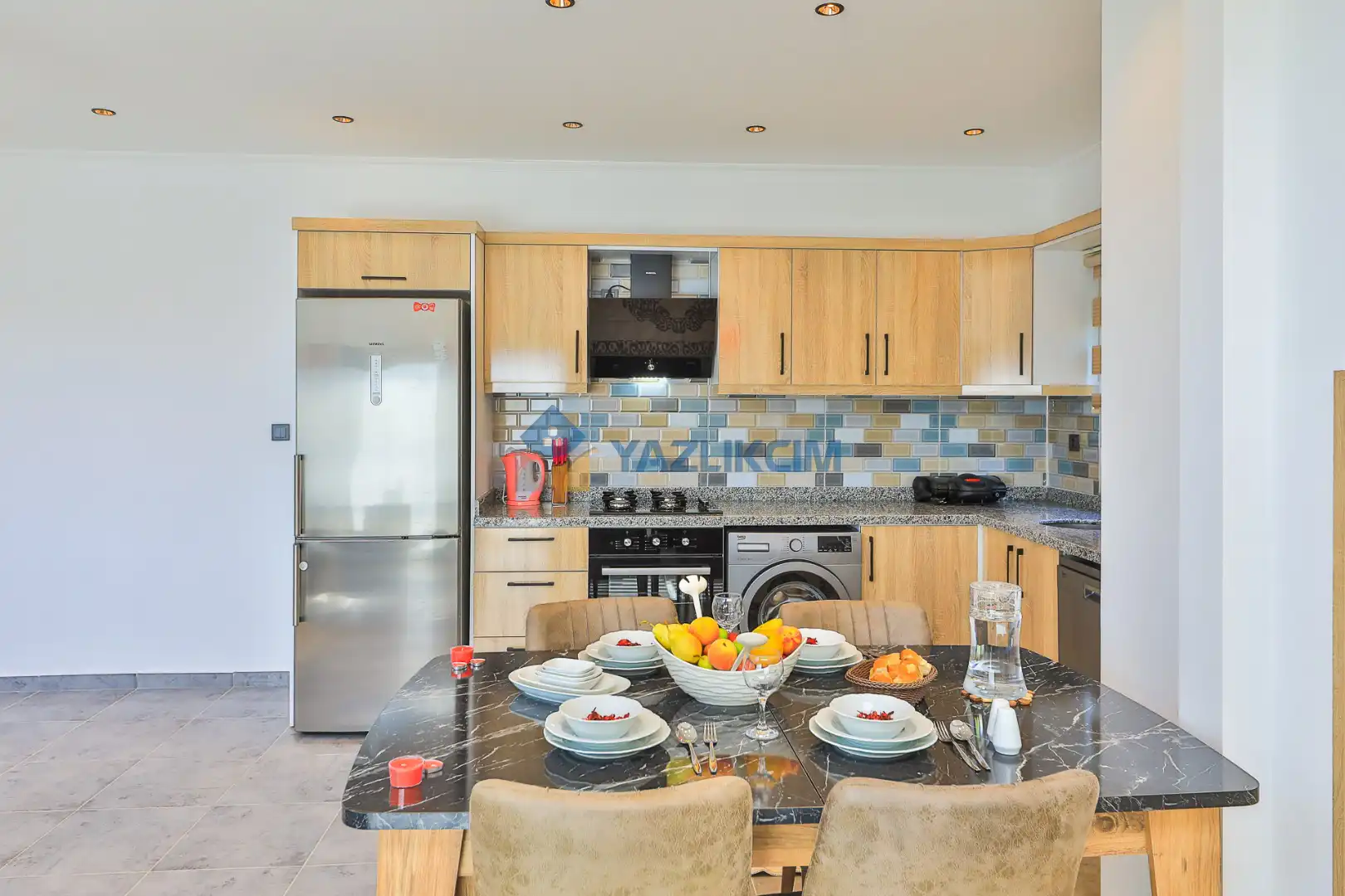 Mutfak Detayları : Buzdolabı , bulaşık makinesi , fırın , çamaşır makinesi, su ısıtıcısı (kettle), tost makinesi, mikro dalga fırın, 2 kişilik yemek takımı , tava-tencere, çatal-bıçak seti bulunmaktadır.